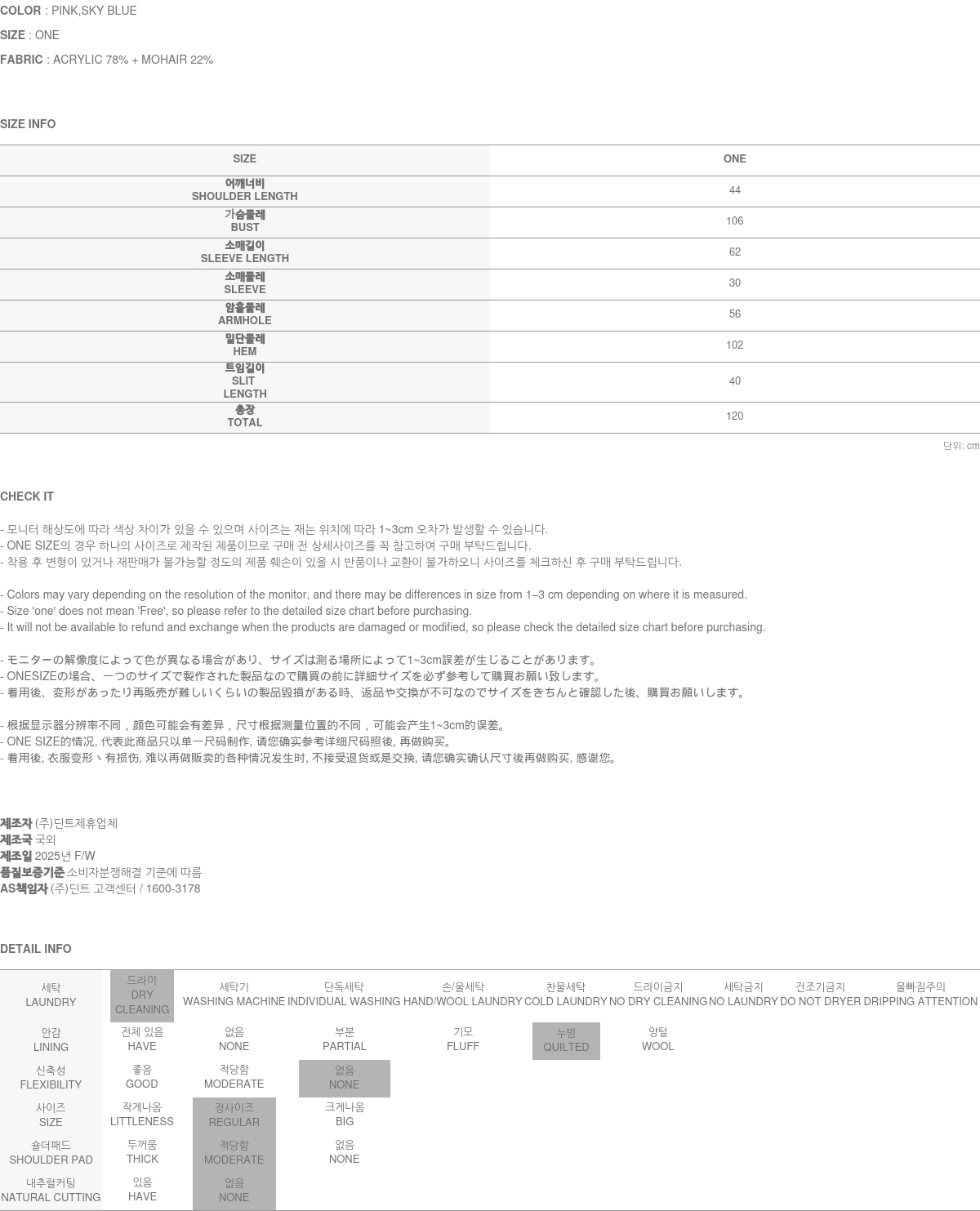 171CM 모델 ONE 사이즈, PINK 컬러 착용하였습니다.