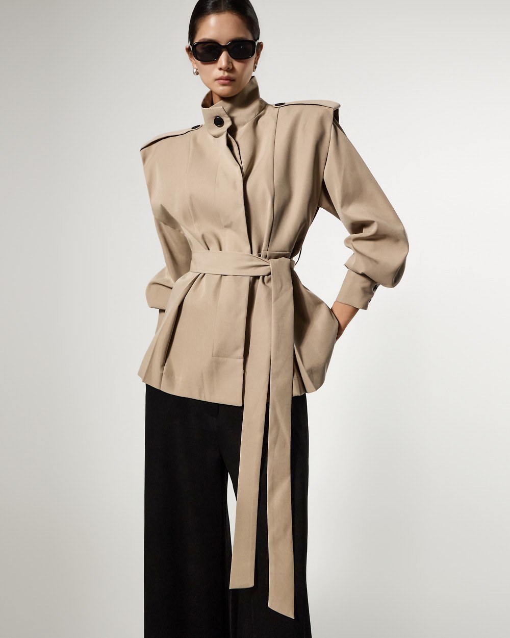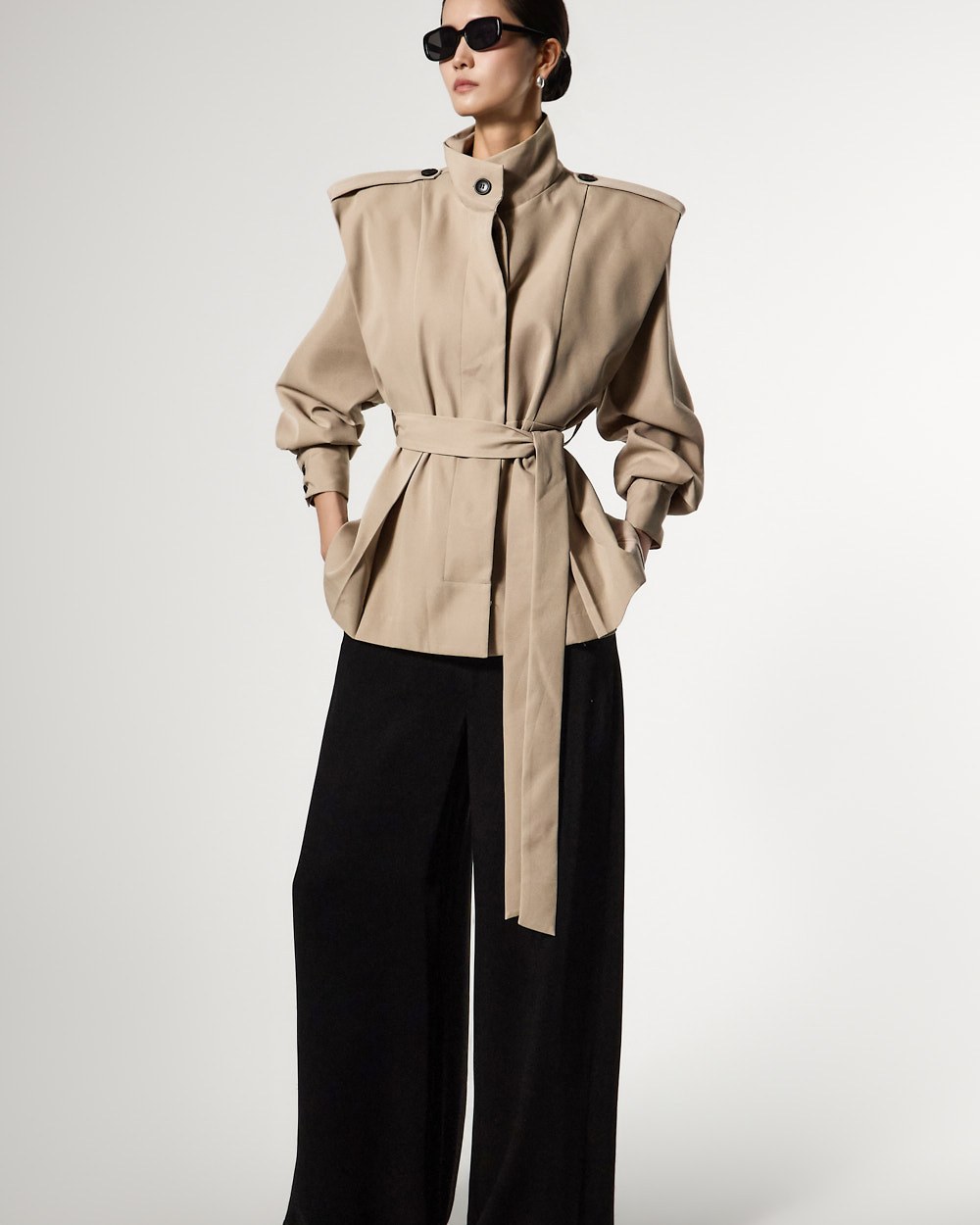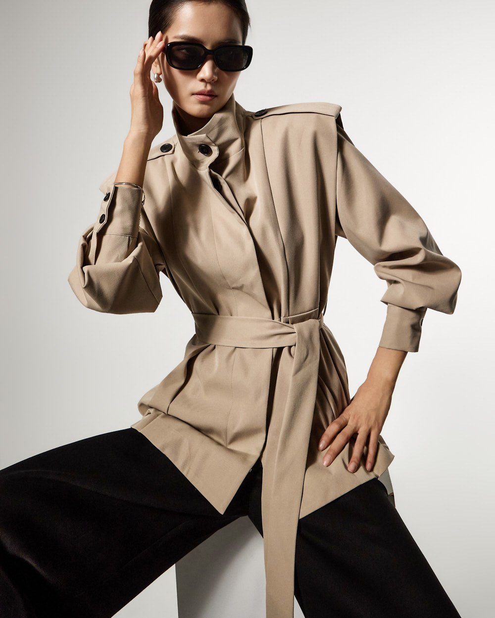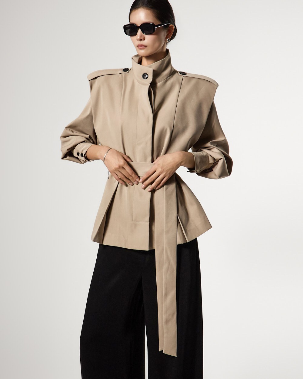 모던한 무드의 벨트 세트 하이넥 트렌치 자켓입니다.