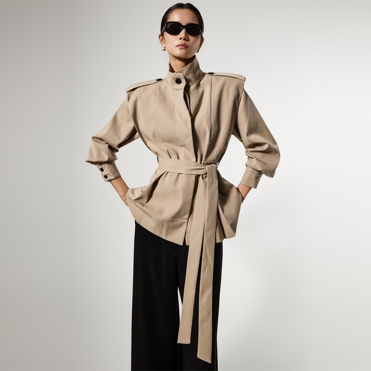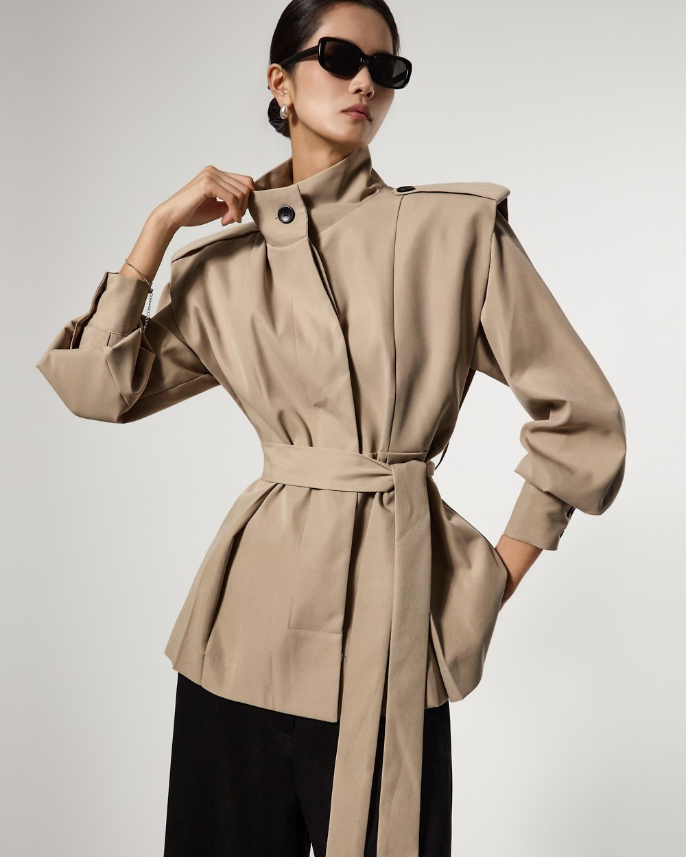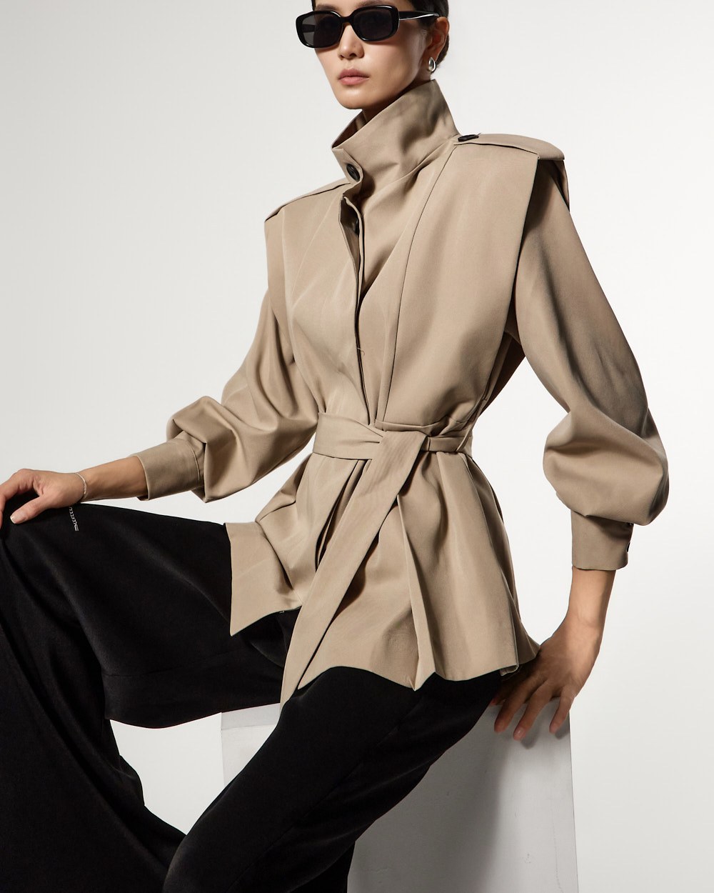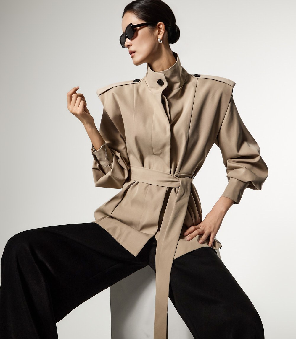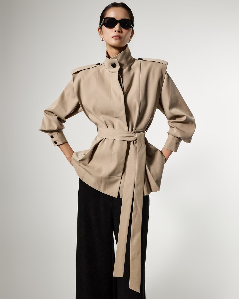 모던한 무드의 벨트 세트 하이넥 트렌치 자켓입니다.