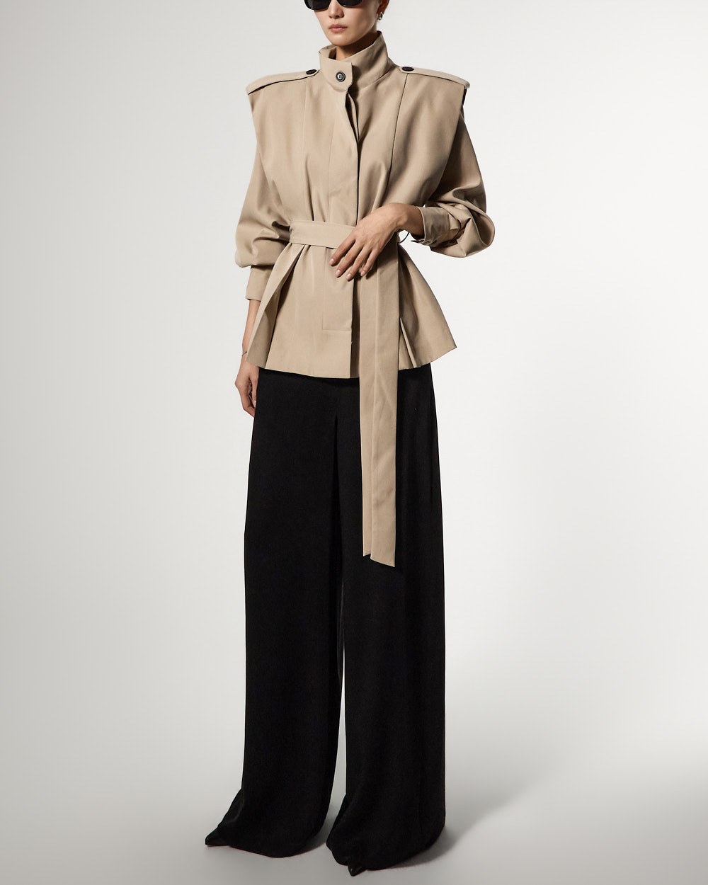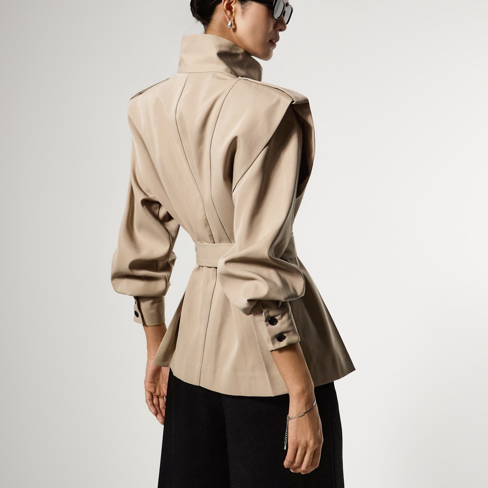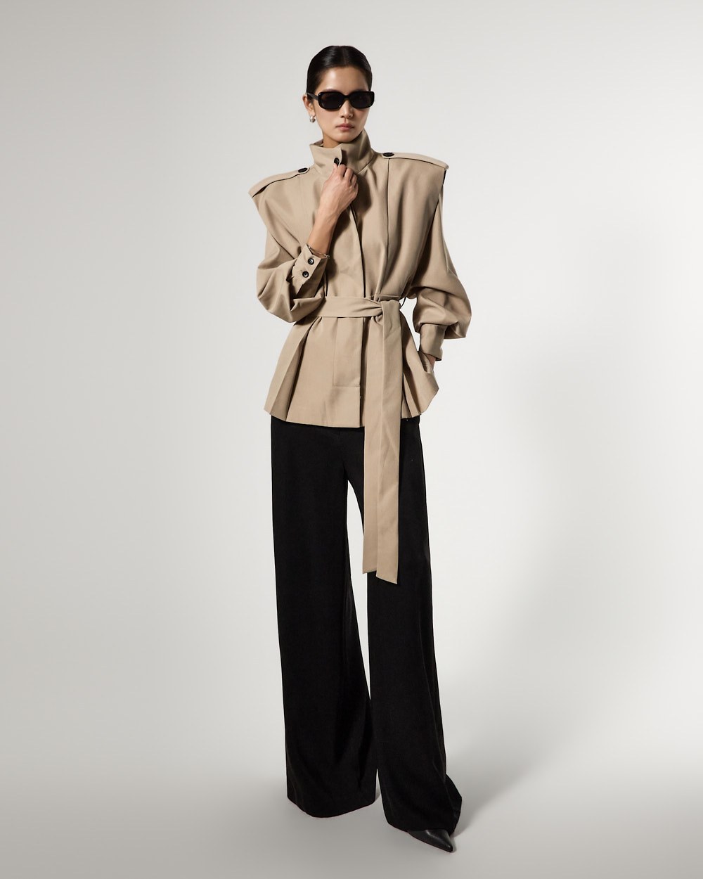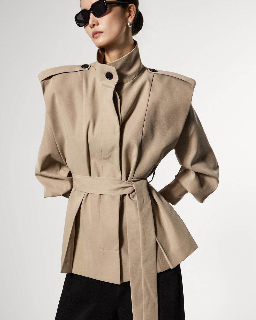 모던한 무드의 벨트 세트 하이넥 트렌치 자켓입니다.