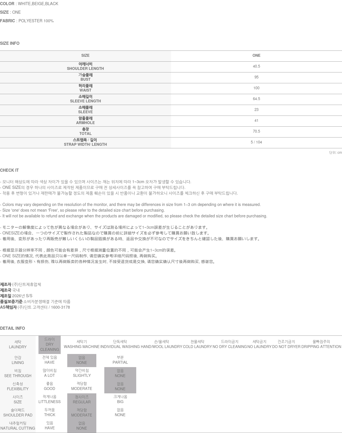 - (주)딘트의 의류는 일반 세탁 및 건조기 사용 시 원단의 변형이나 제품 손상의 원인이 될 수 있으므로, 하단에 안내된 세탁 방법을 따라주시기를 권장합니다.