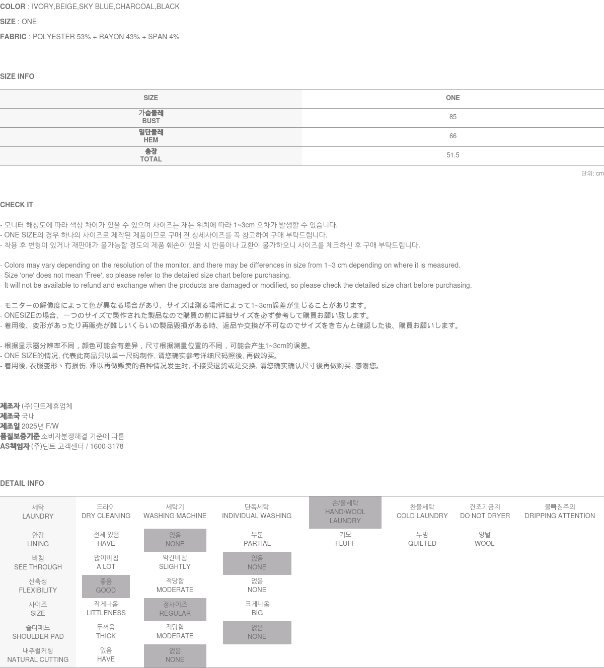 폴리에스테르·레이온·스판 혼방 소재로 제작되어