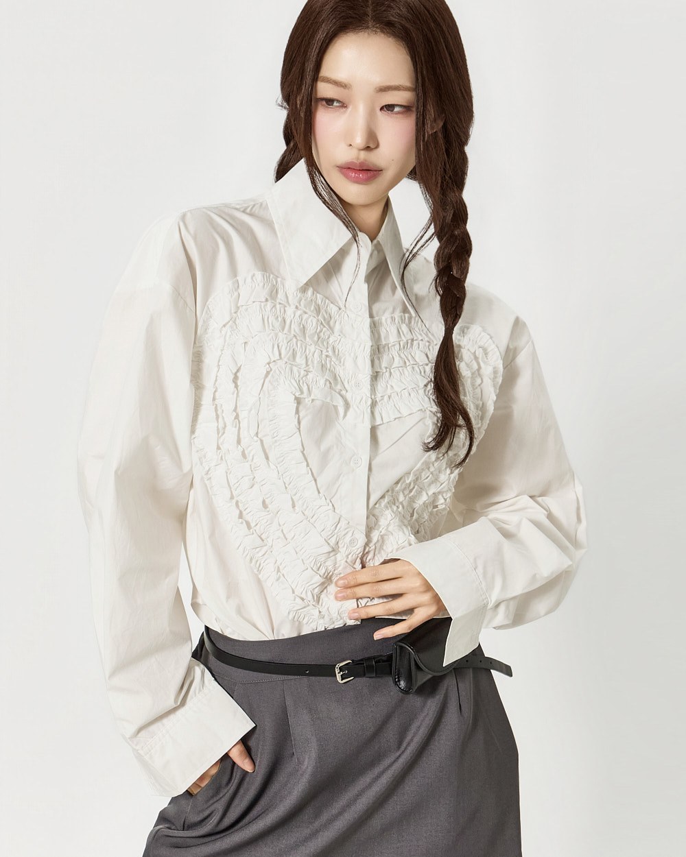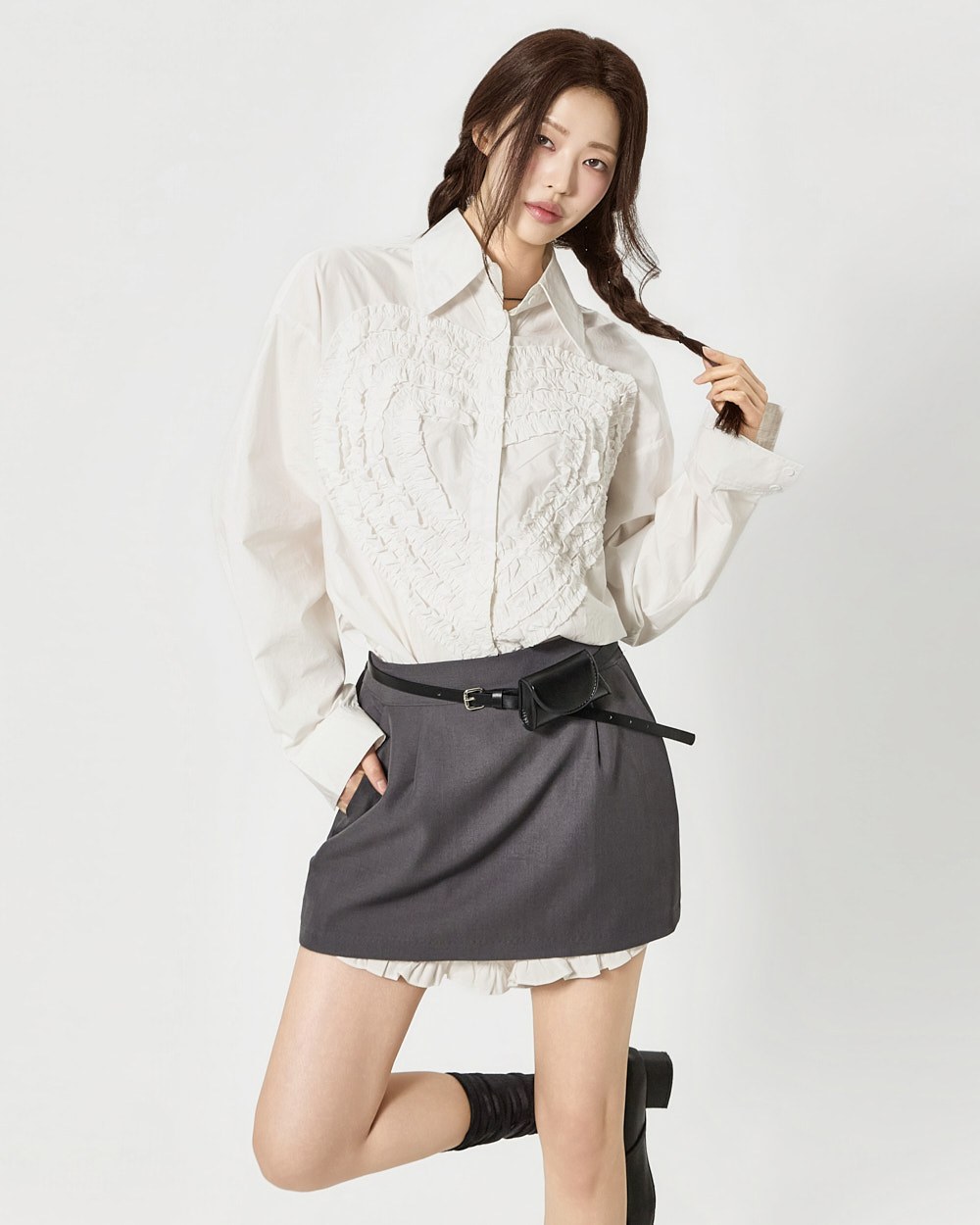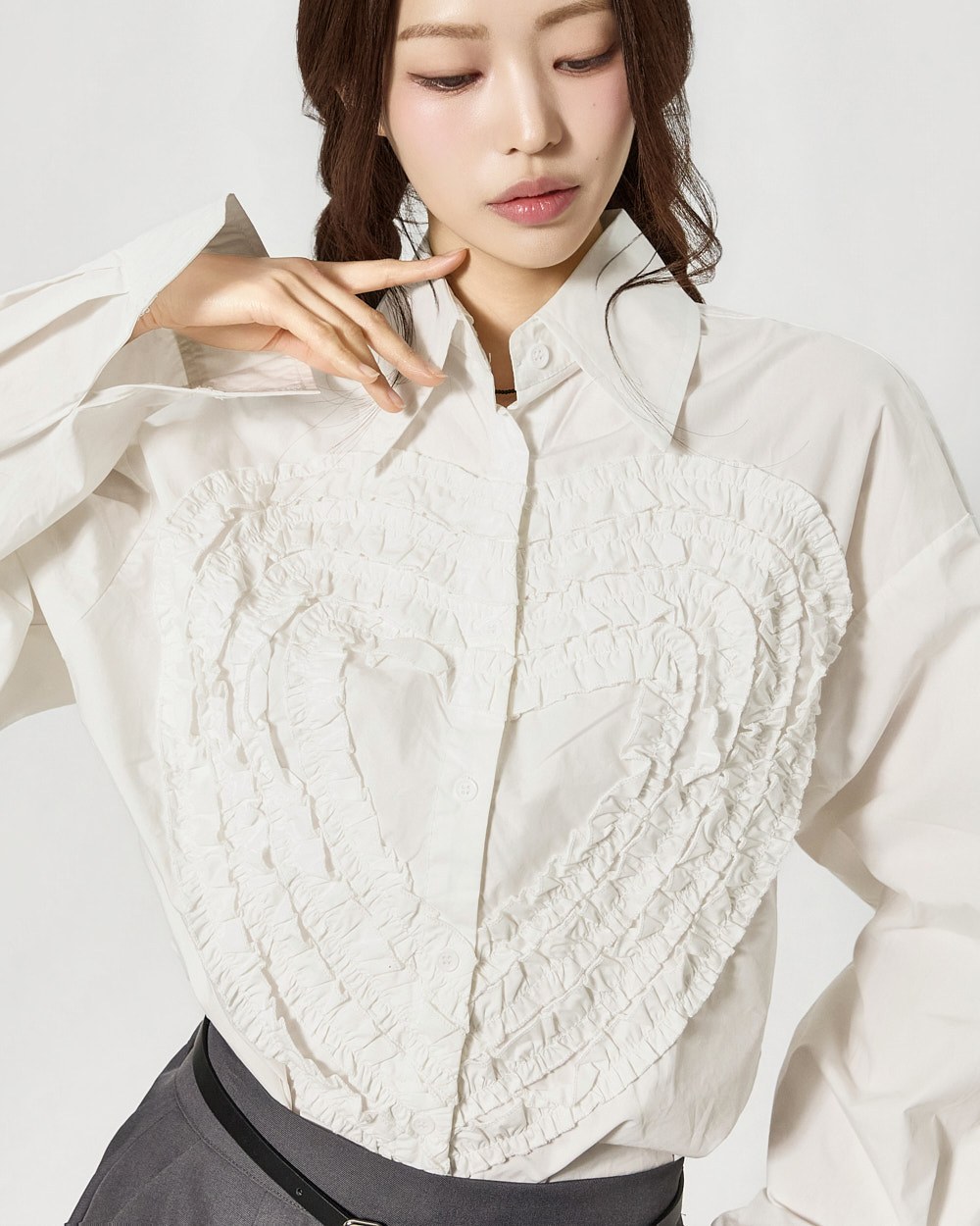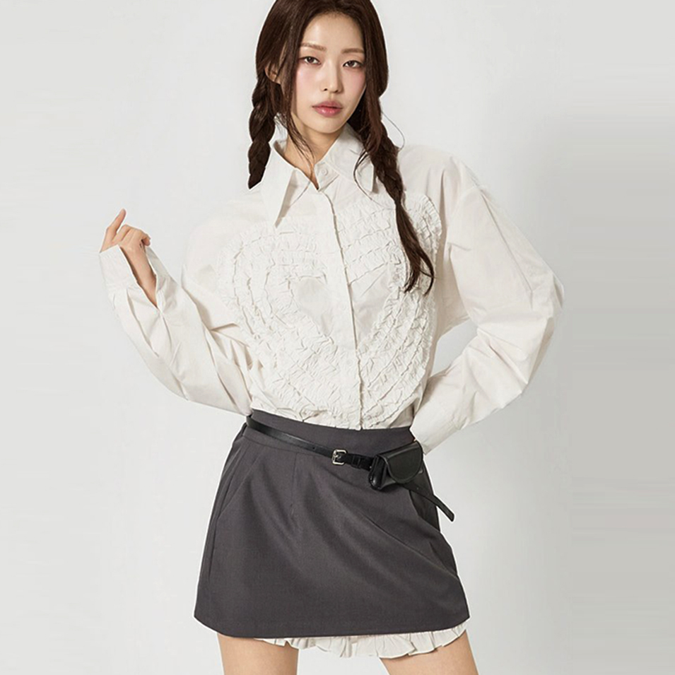 전면에 더해진 프릴 디테일이 하트 형태로 표현되어