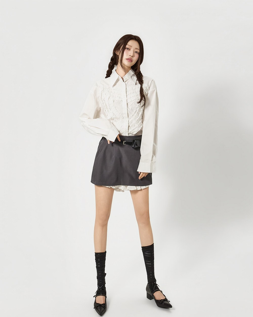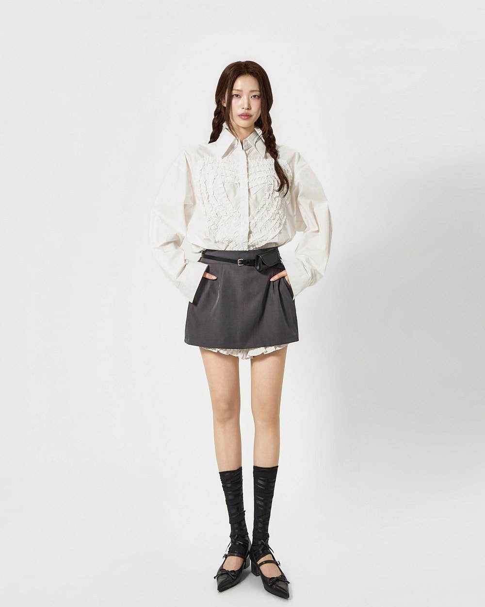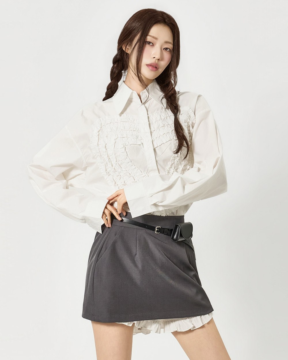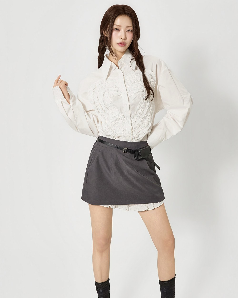 전면에 더해진 프릴 디테일이 하트 형태로 표현되어