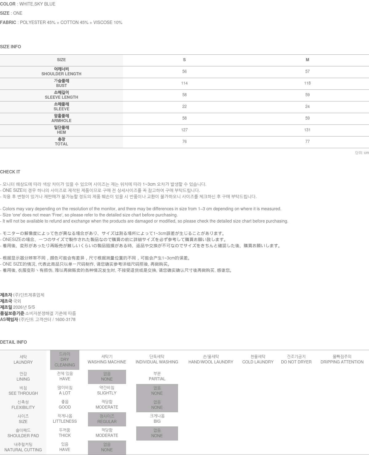 171CM 모델 S 사이즈, WHITE 컬러 착용하였습니다.