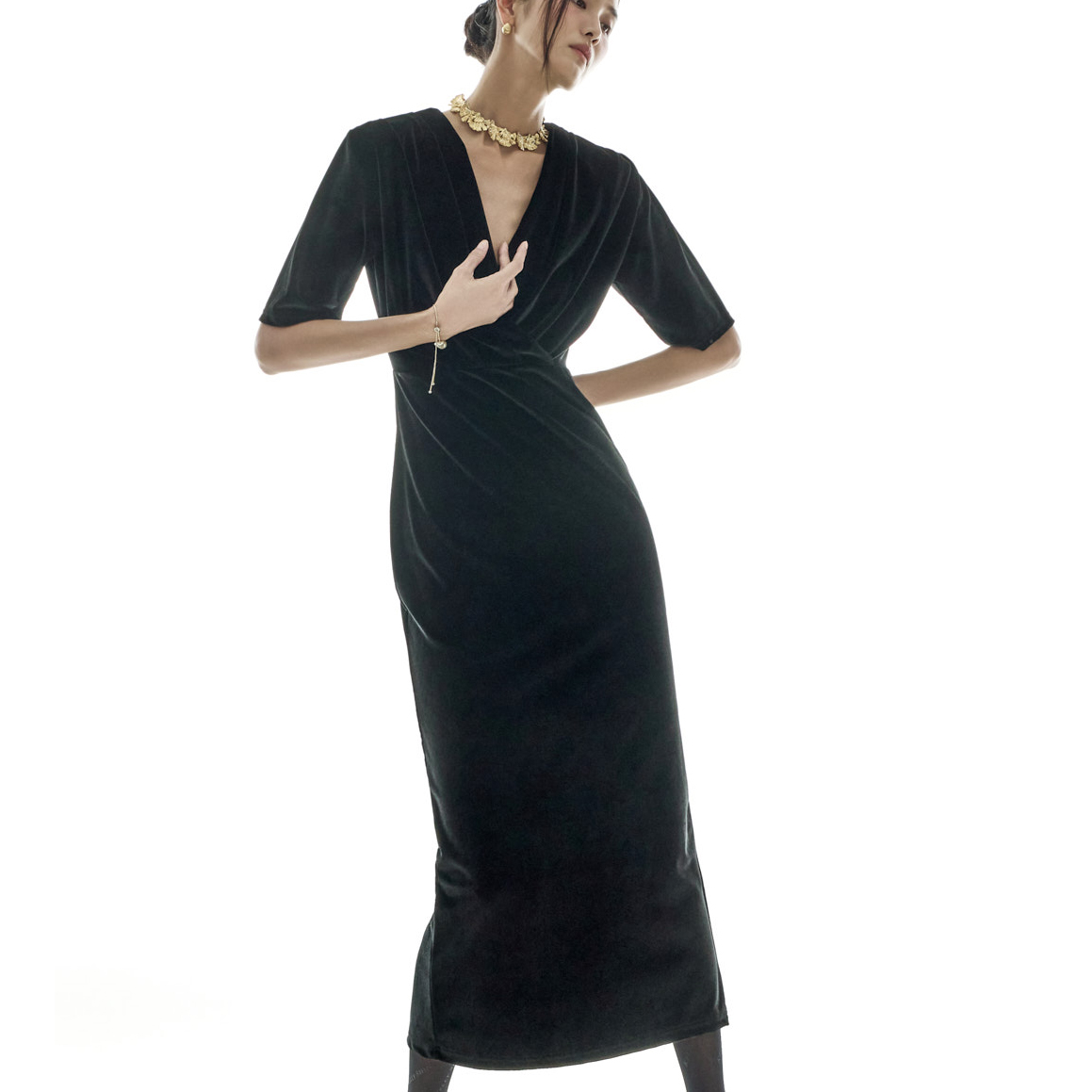딥한 브이넥 라인과 바스트 드레이프 셔링 디테일로