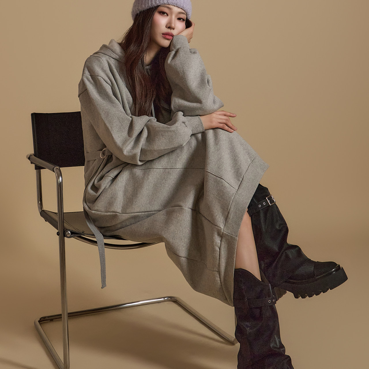 후드 원피스의 디자인으로 편안한 코디네이션이 가능하고