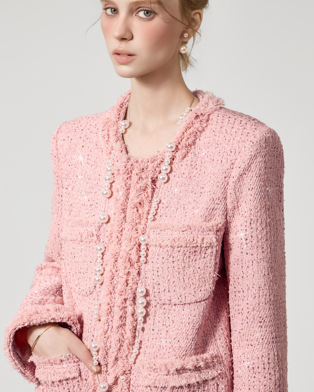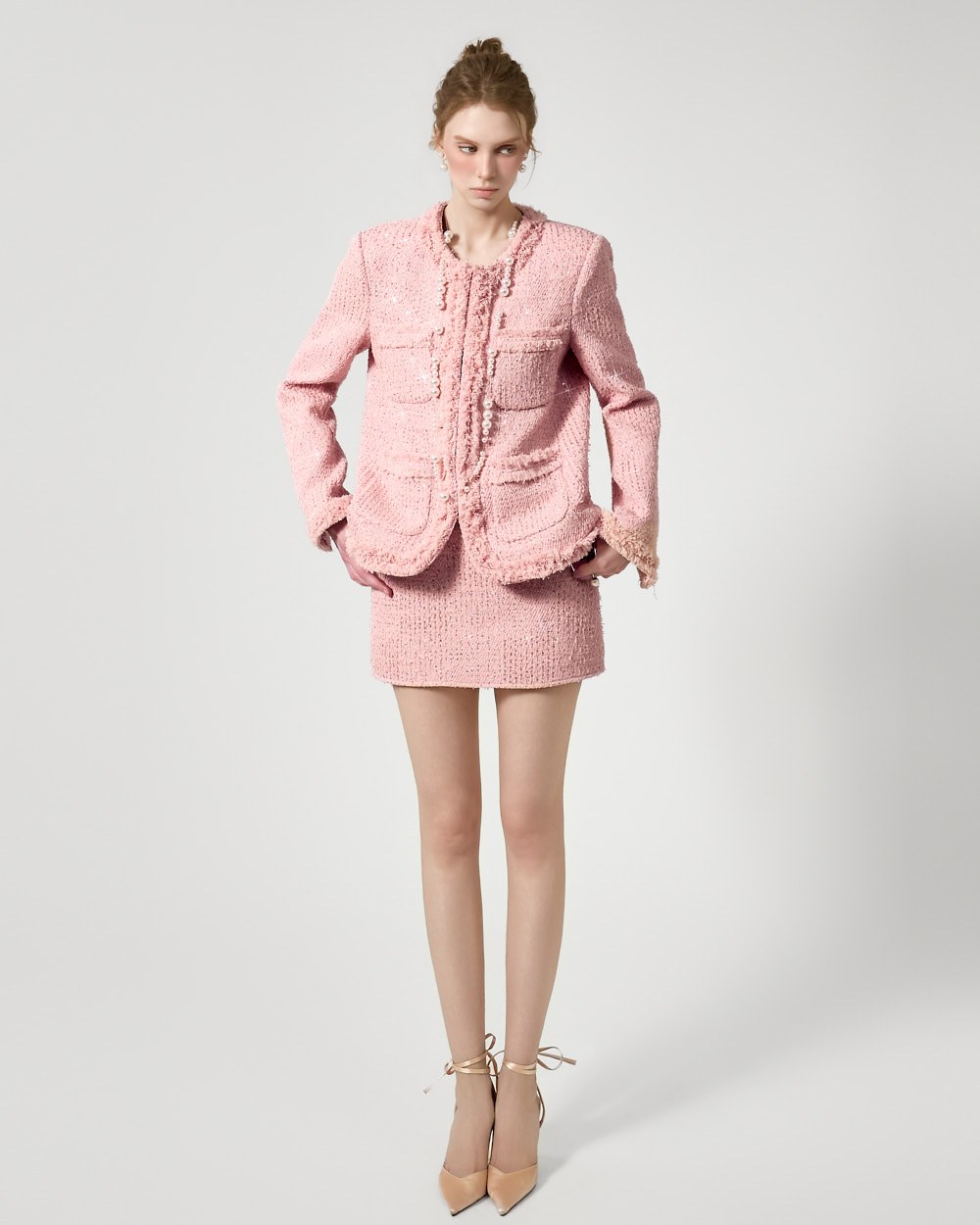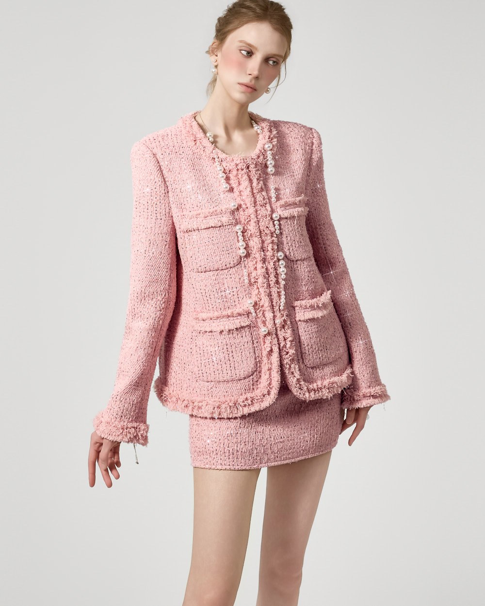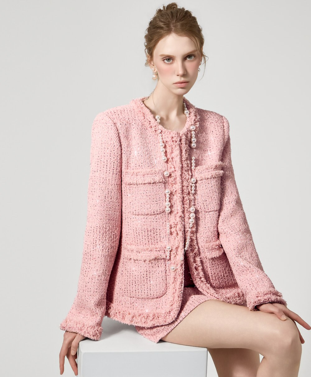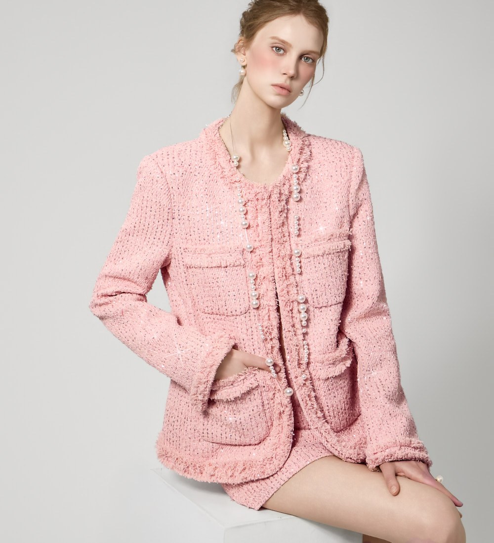 자켓과 동일한 트위드 소재에 스팽글 포인트를 더해