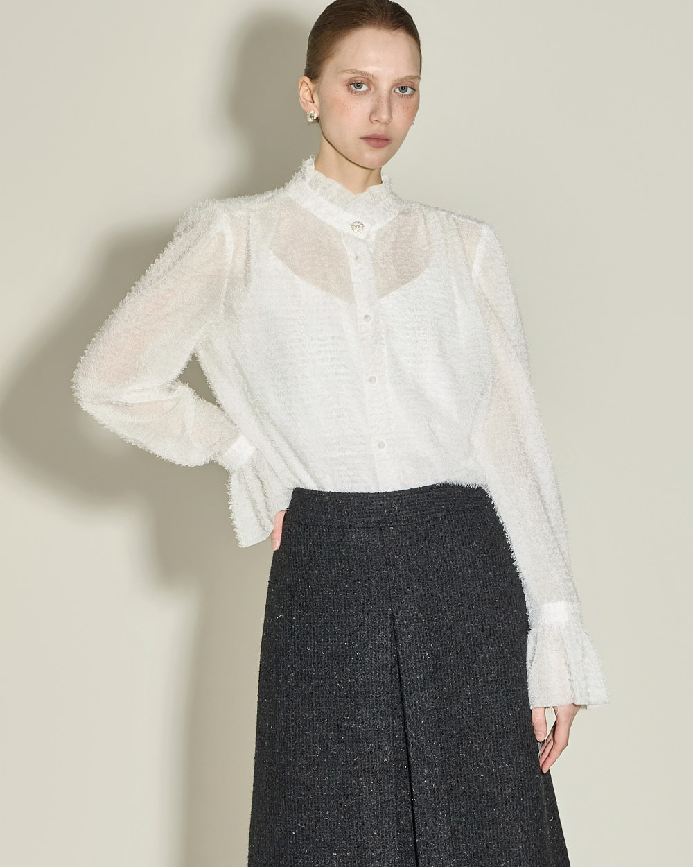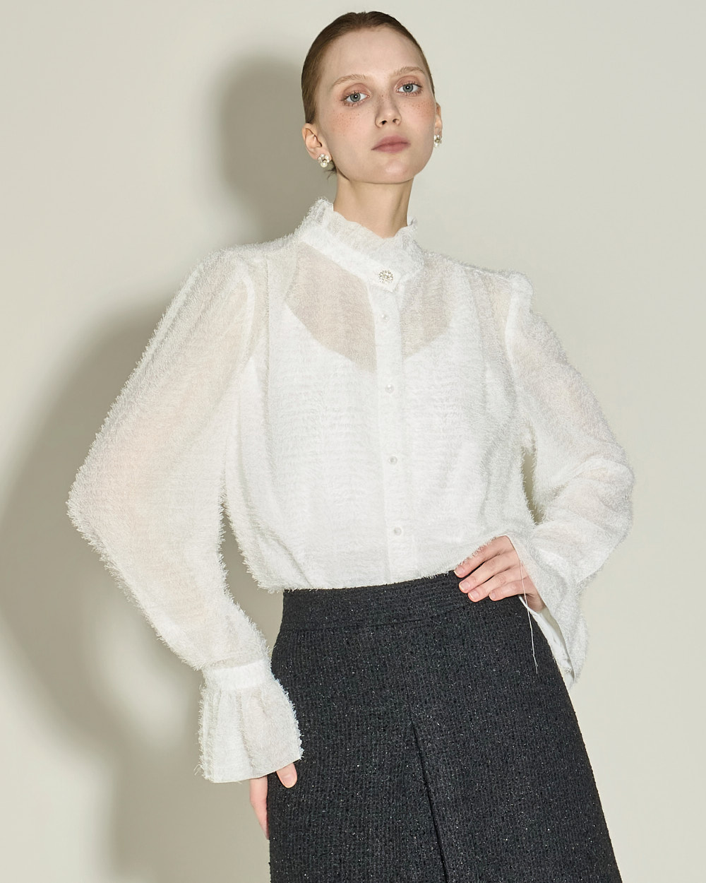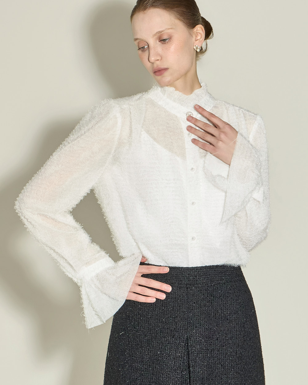 우아한 무드의 프릴 하이넥 블라우스입니다.