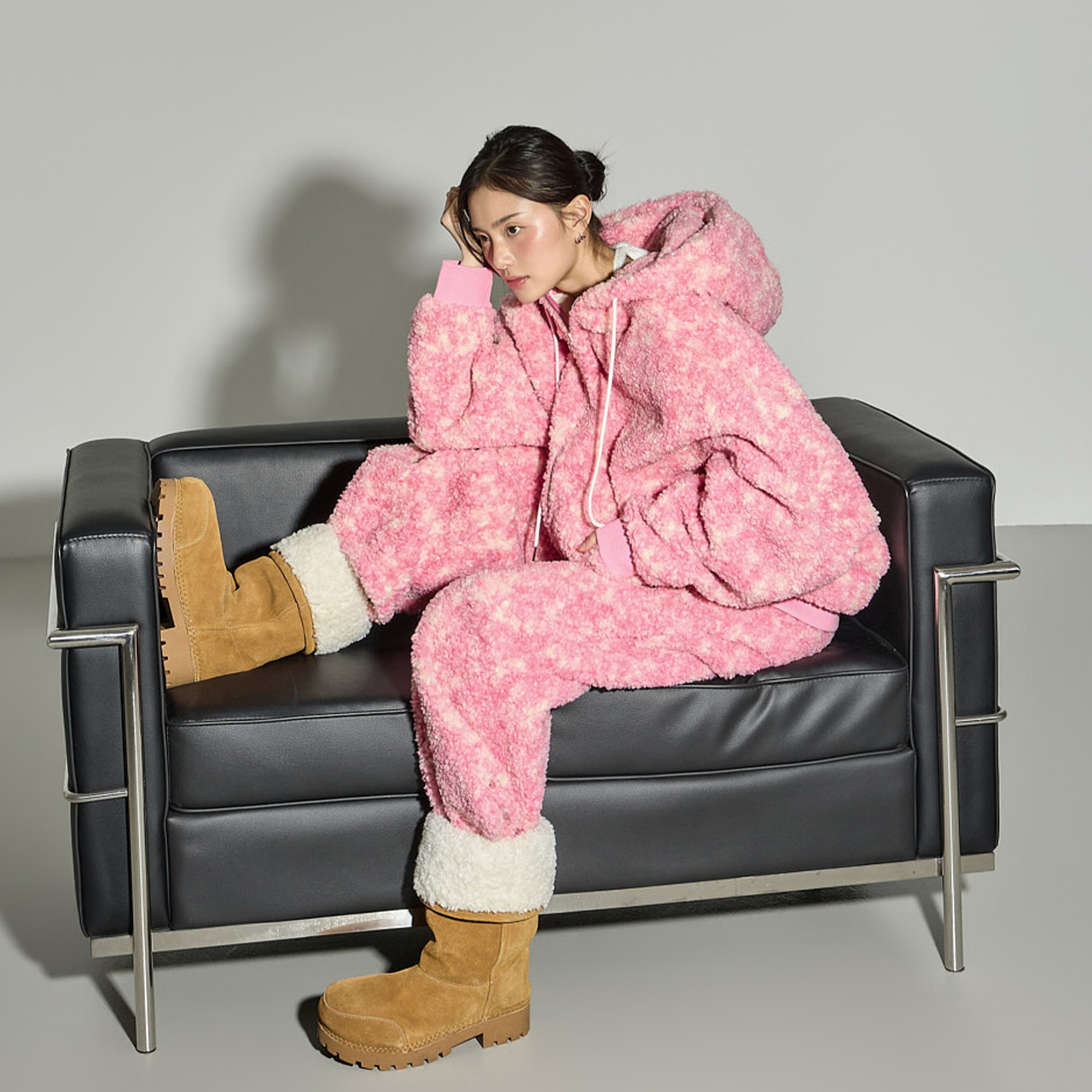 테디 후드 점퍼와 테디 팬츠 구성으로