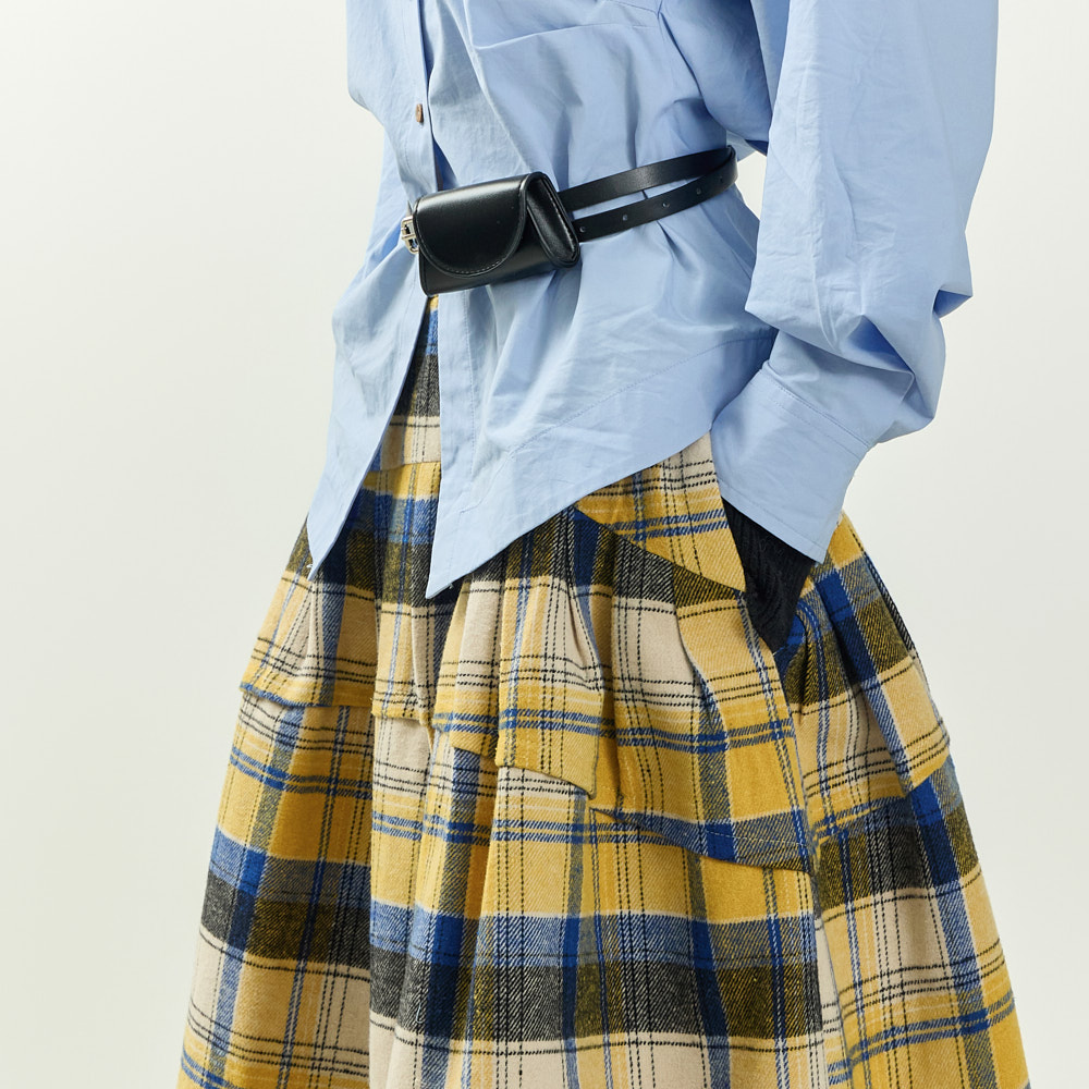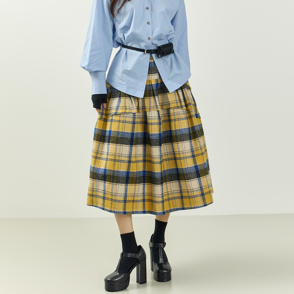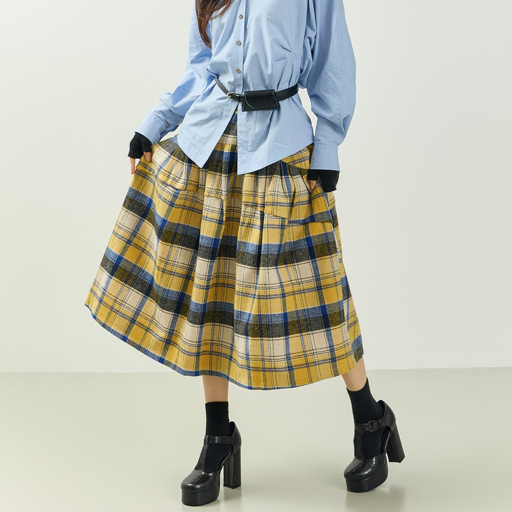레트로 캐주얼 무드의 체크 플레어 울 스커트입니다.