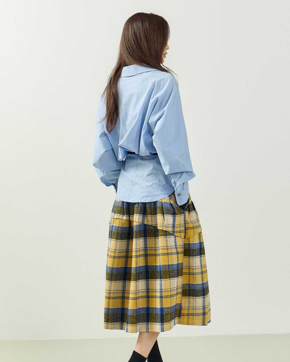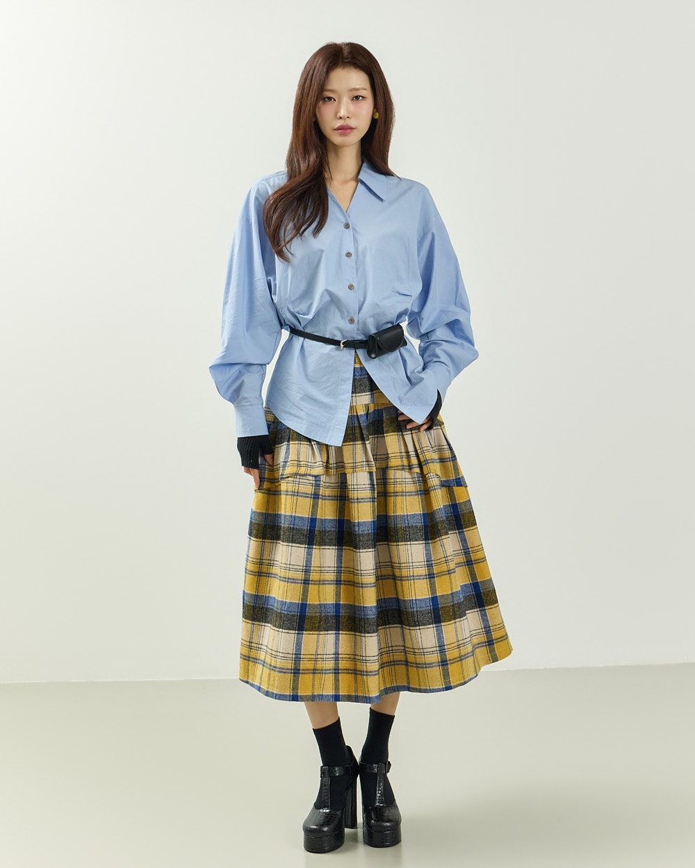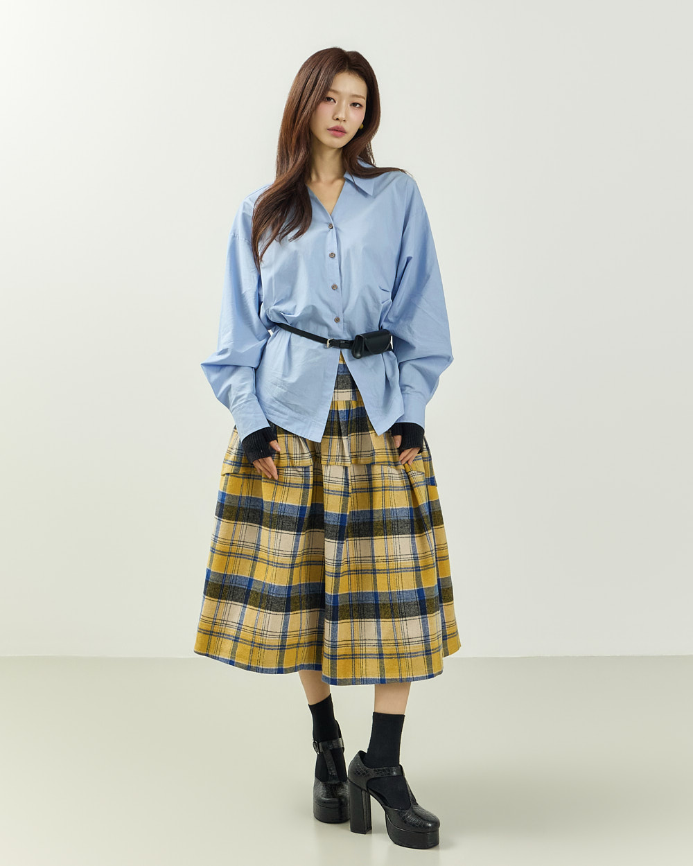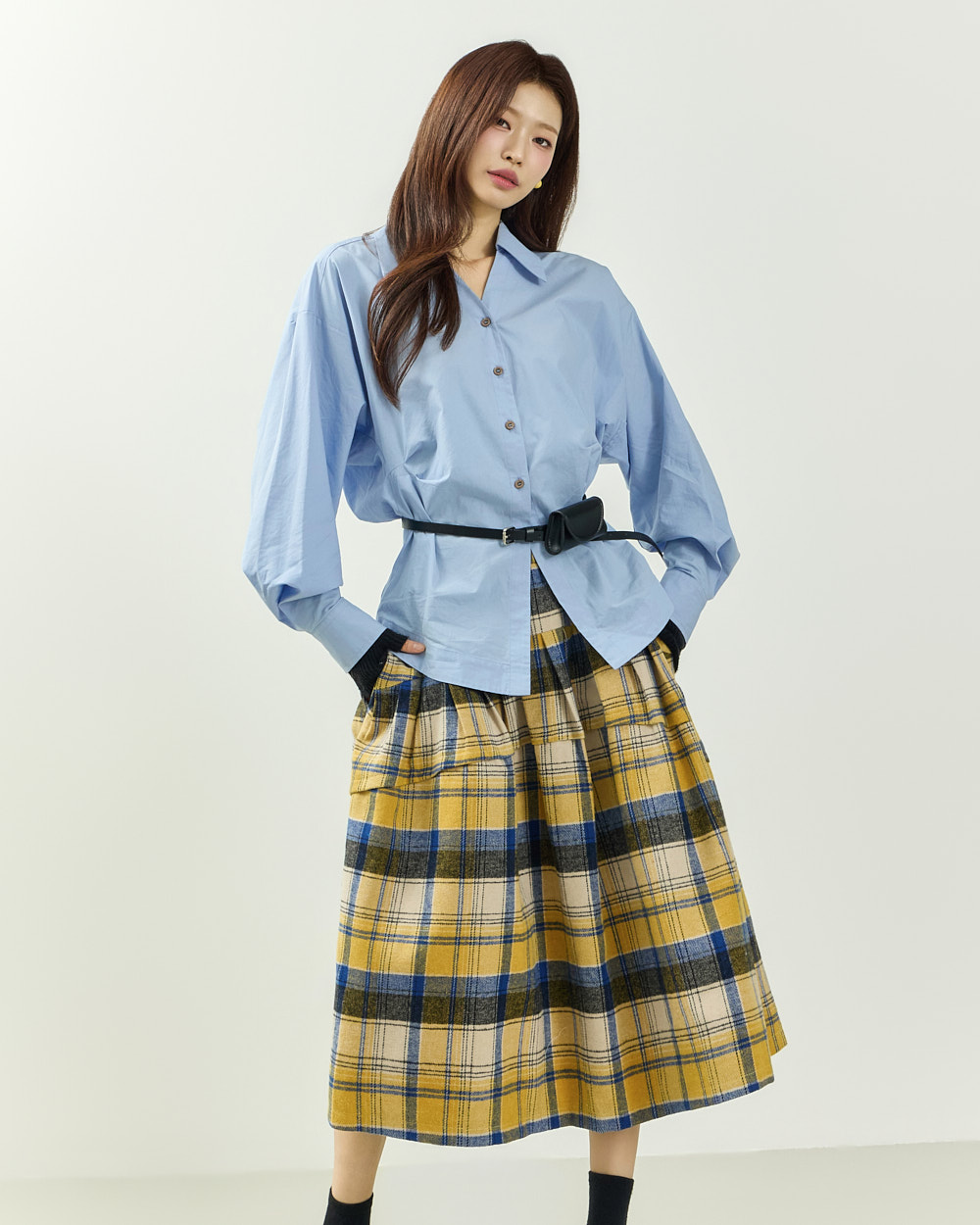 플레어한 실루엣과 미디 기장감이 어우러져
