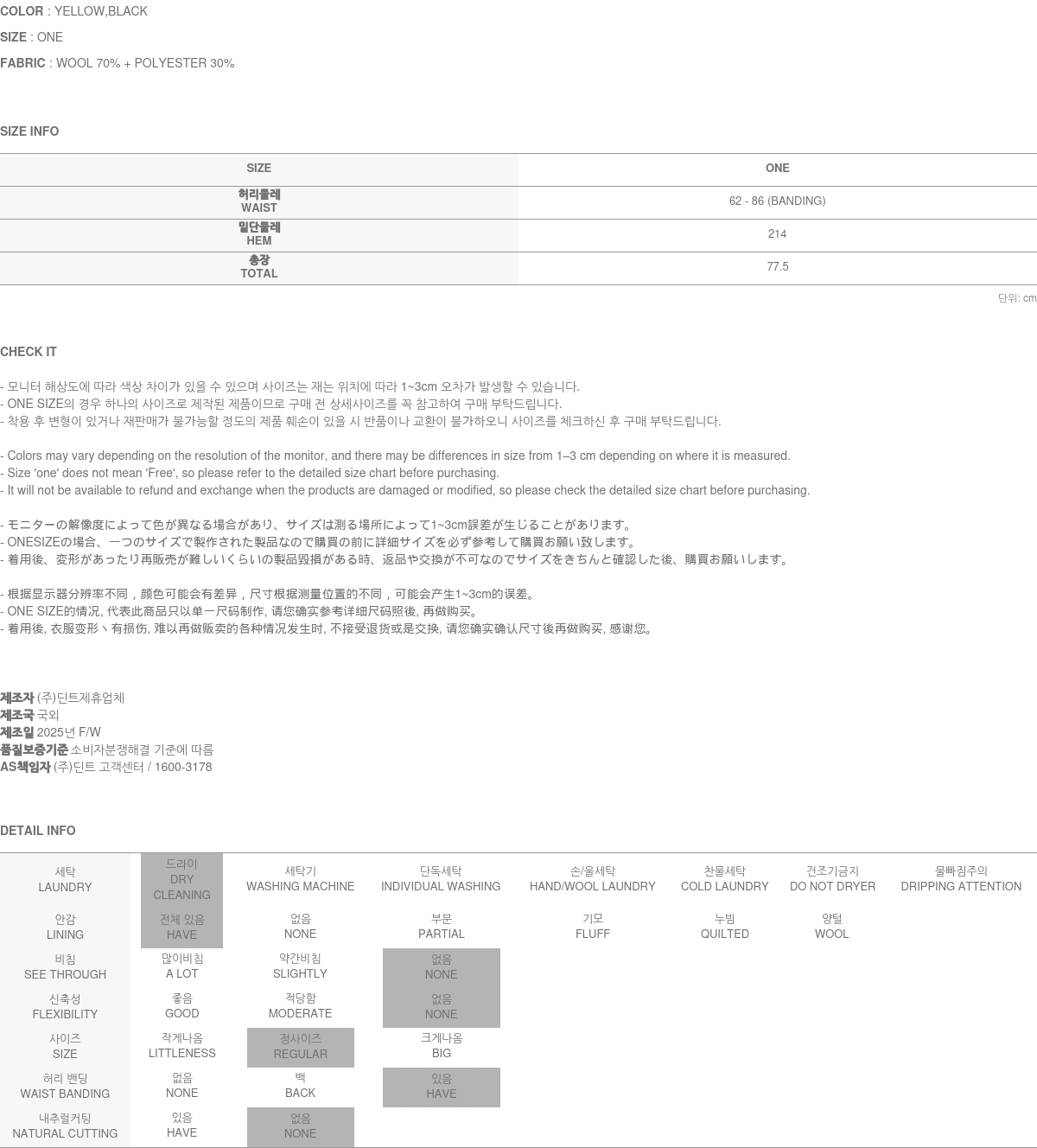 171CM 모델 ONE 사이즈, YELLOW 컬러 착용하였습니다.