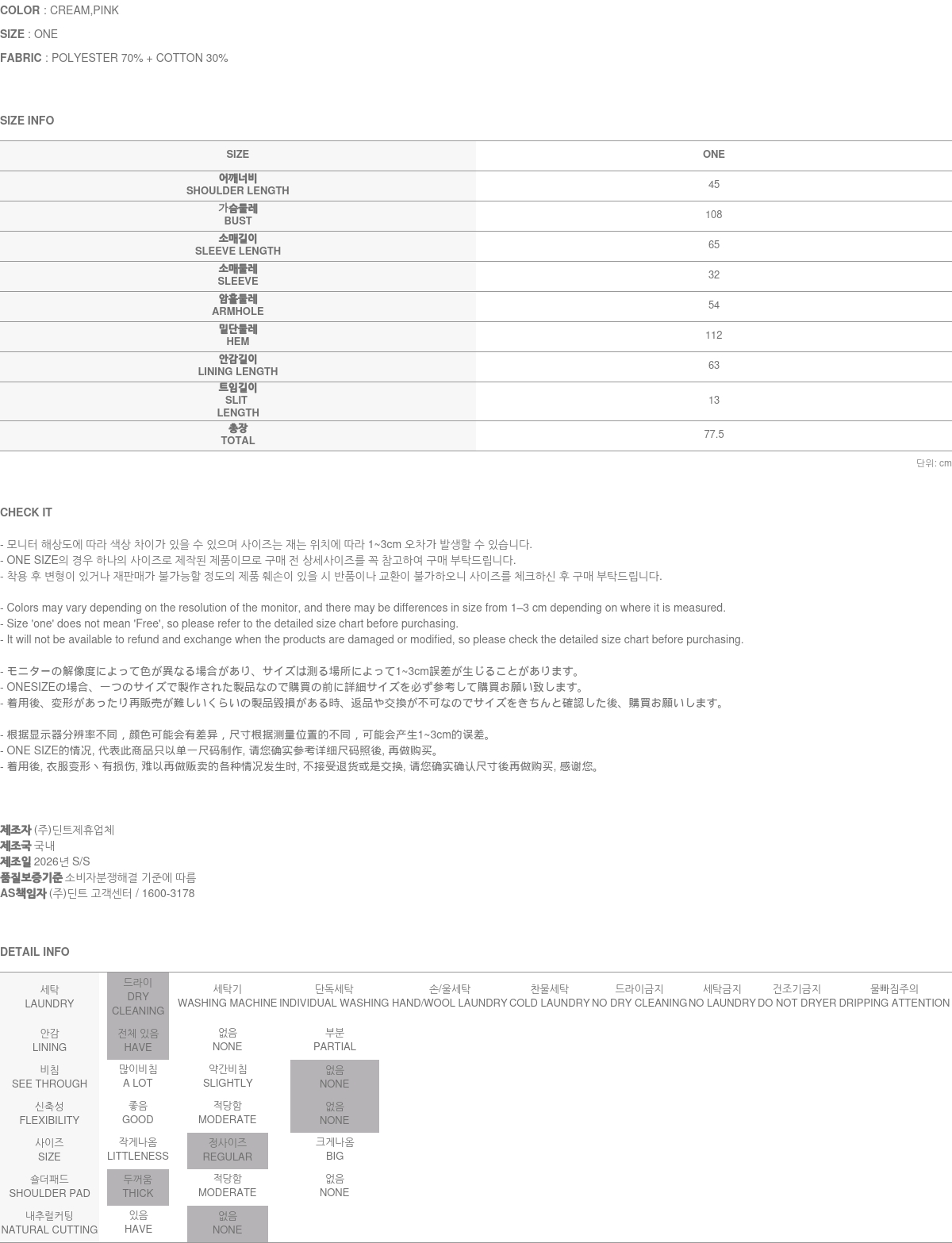 174CM 모델 ONE 사이즈, PINK 컬러 착용하였습니다.