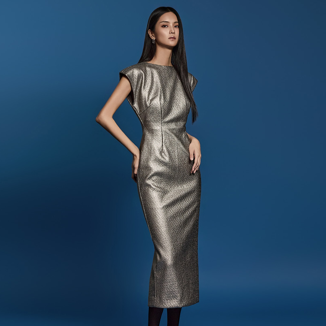 웨이스트라인 절개로 슬림한 아웃핏을 연출합니다.