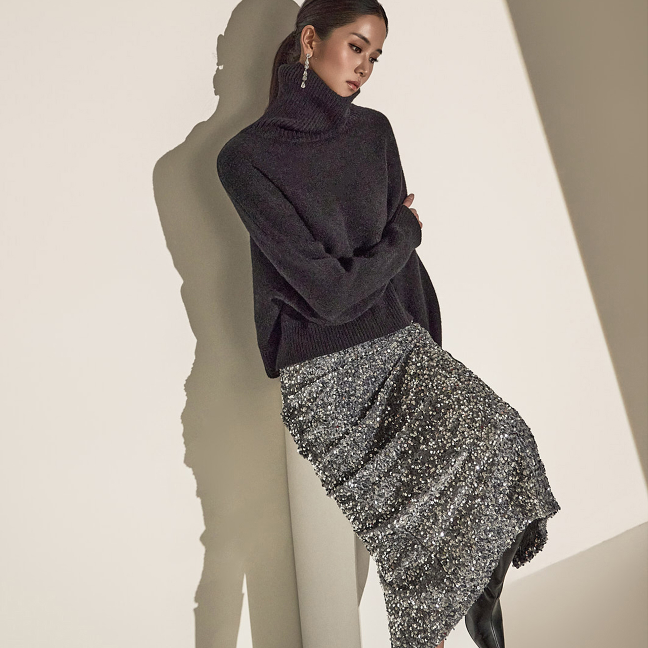 길게 내려오는 소매 라인으로 스타일을 더해주었으며,
