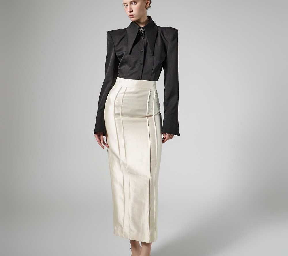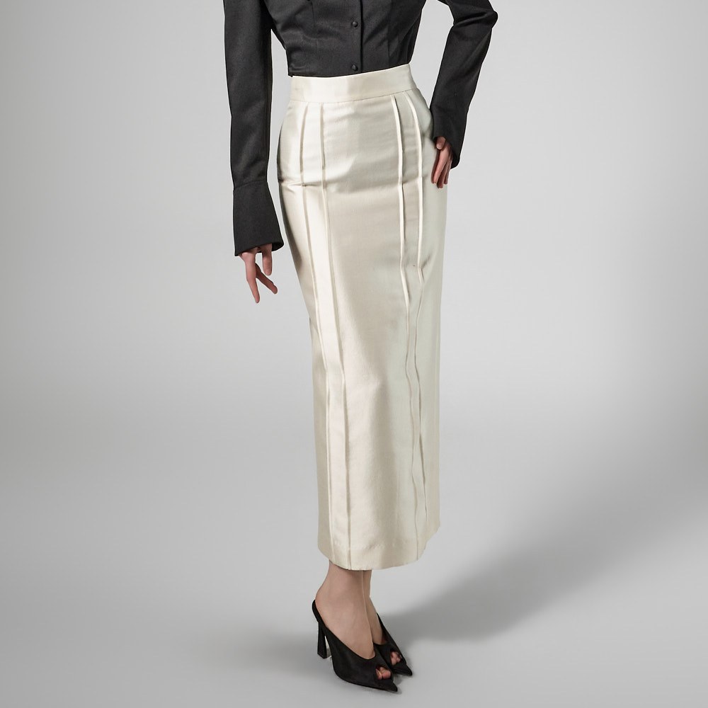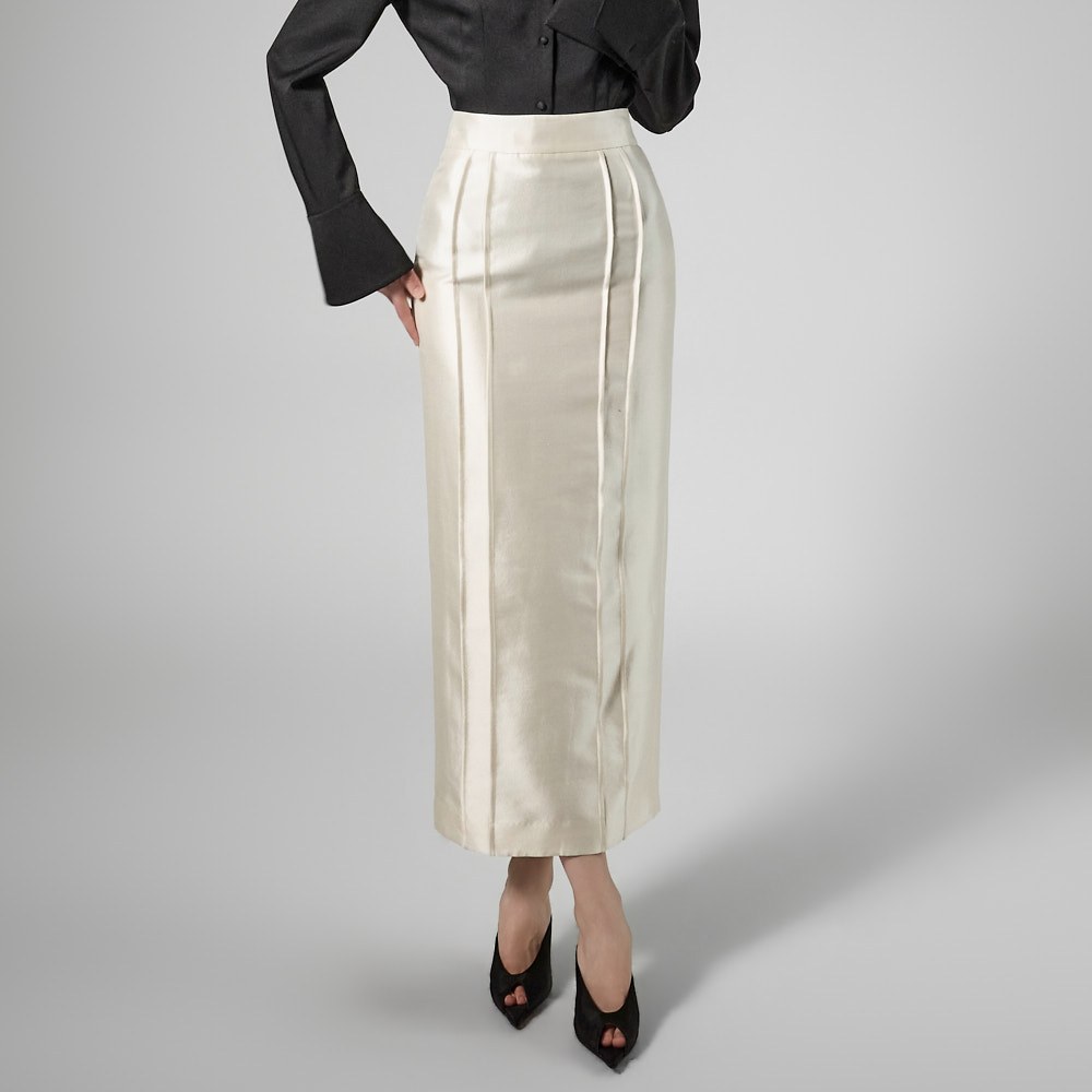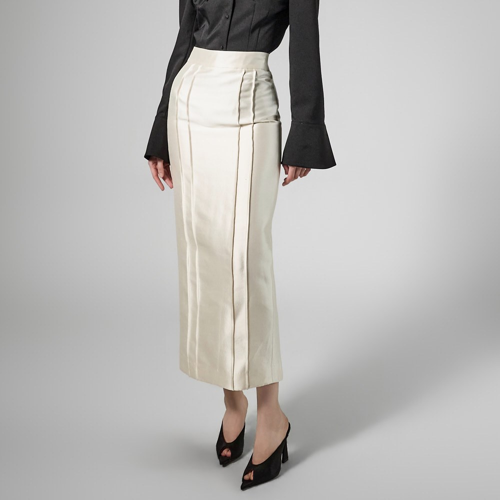 제작된 미디 기장의 펜슬 스커트입니다.