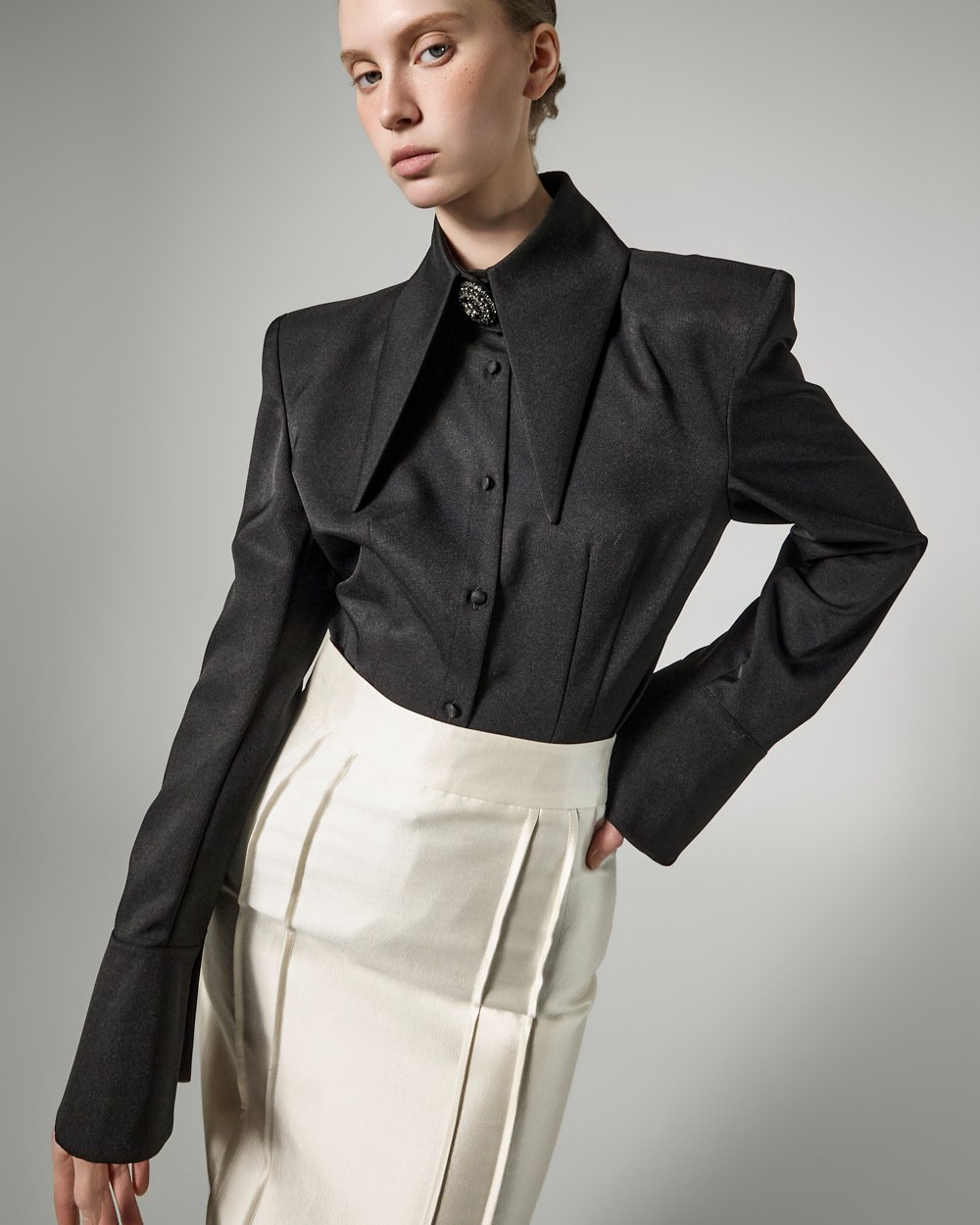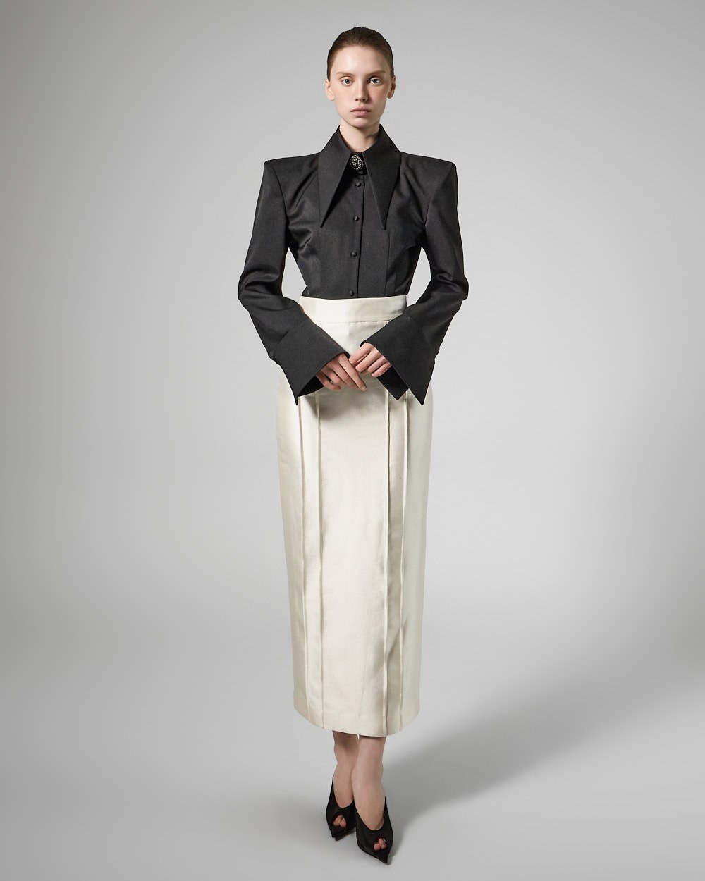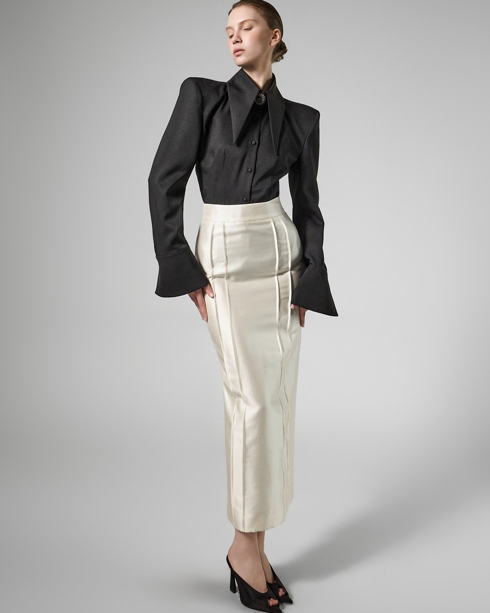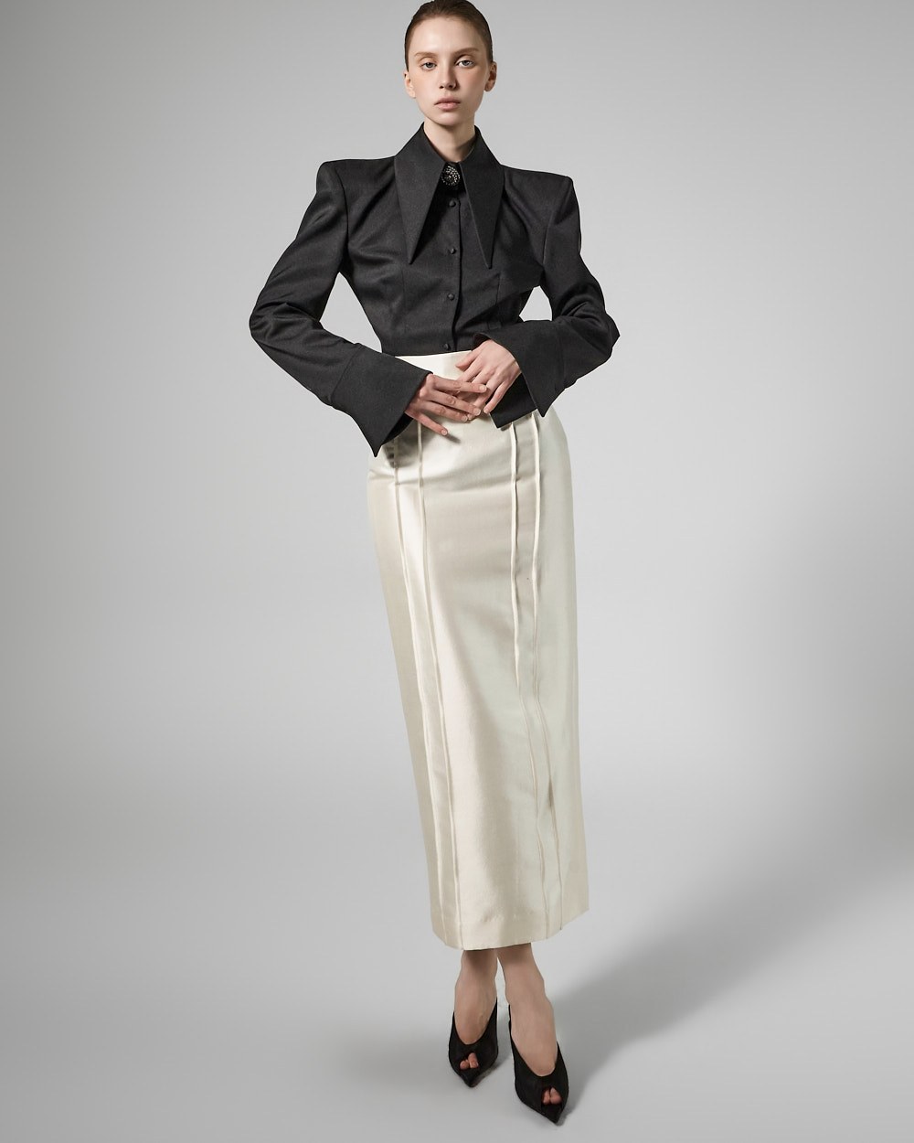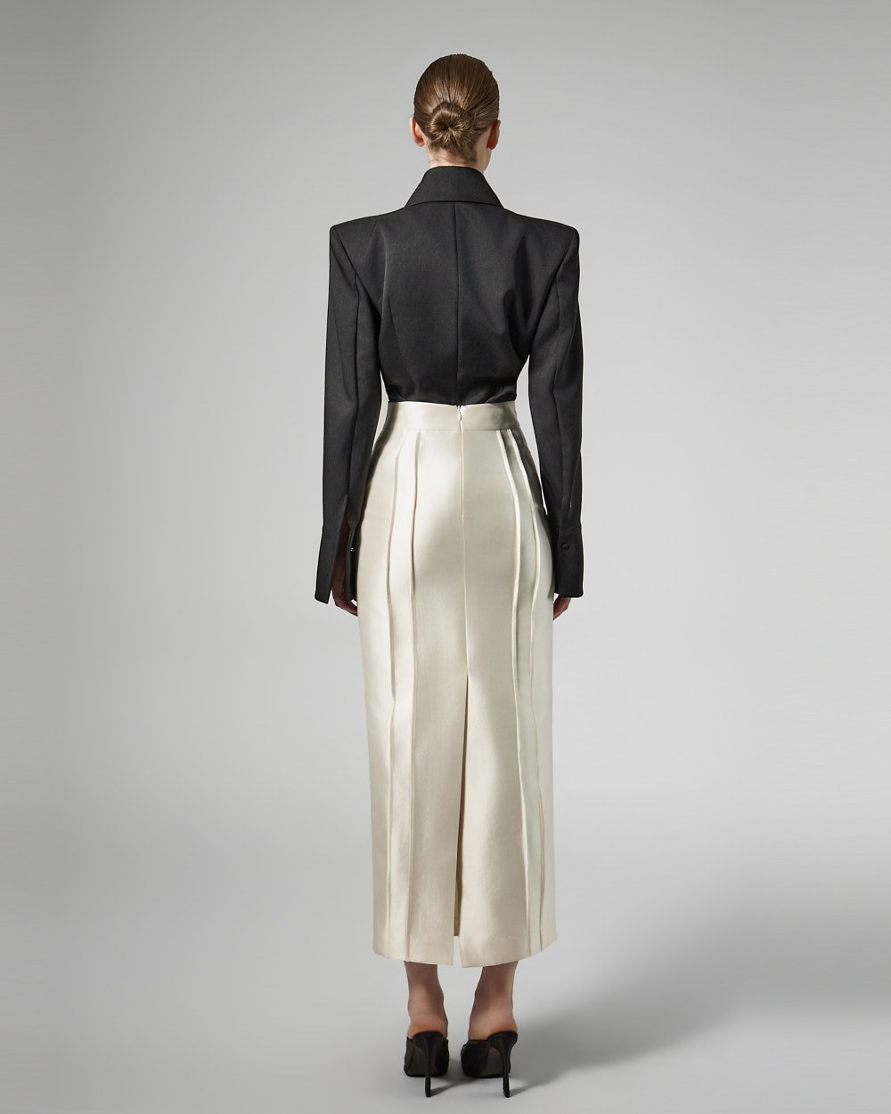전면에 절개선을 더해 코르셋 느낌의 입체적인 라인을 연출합니다.