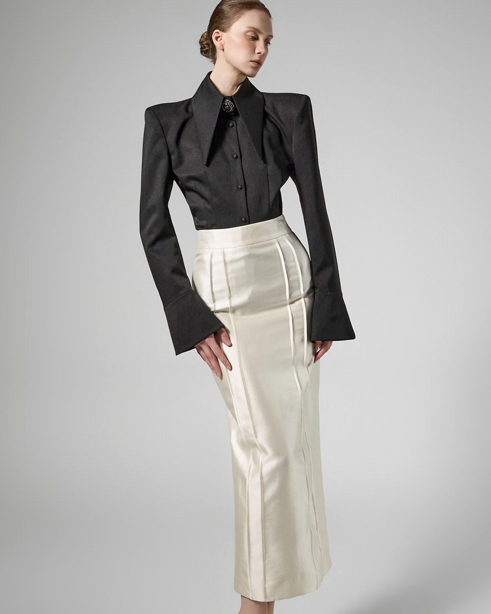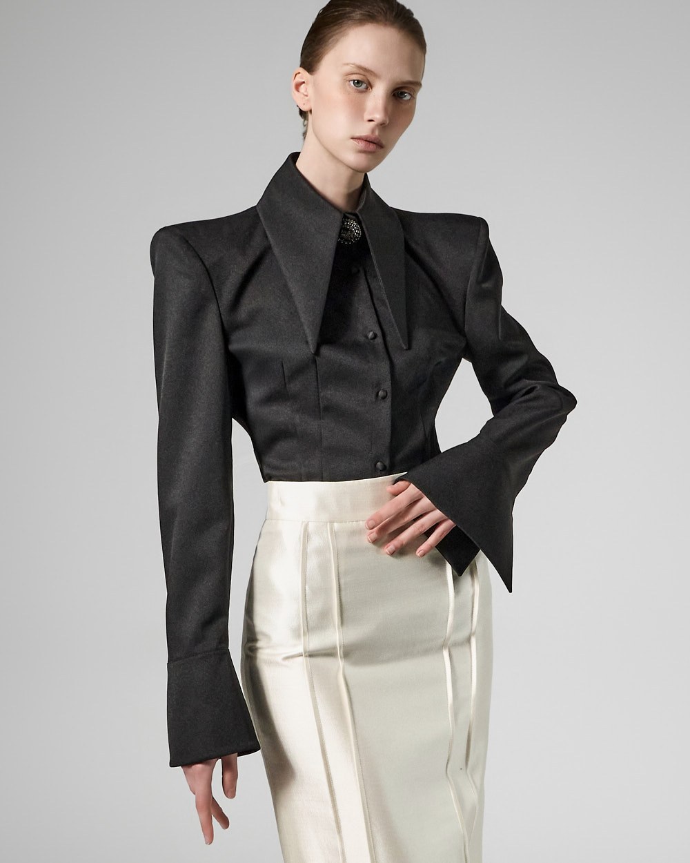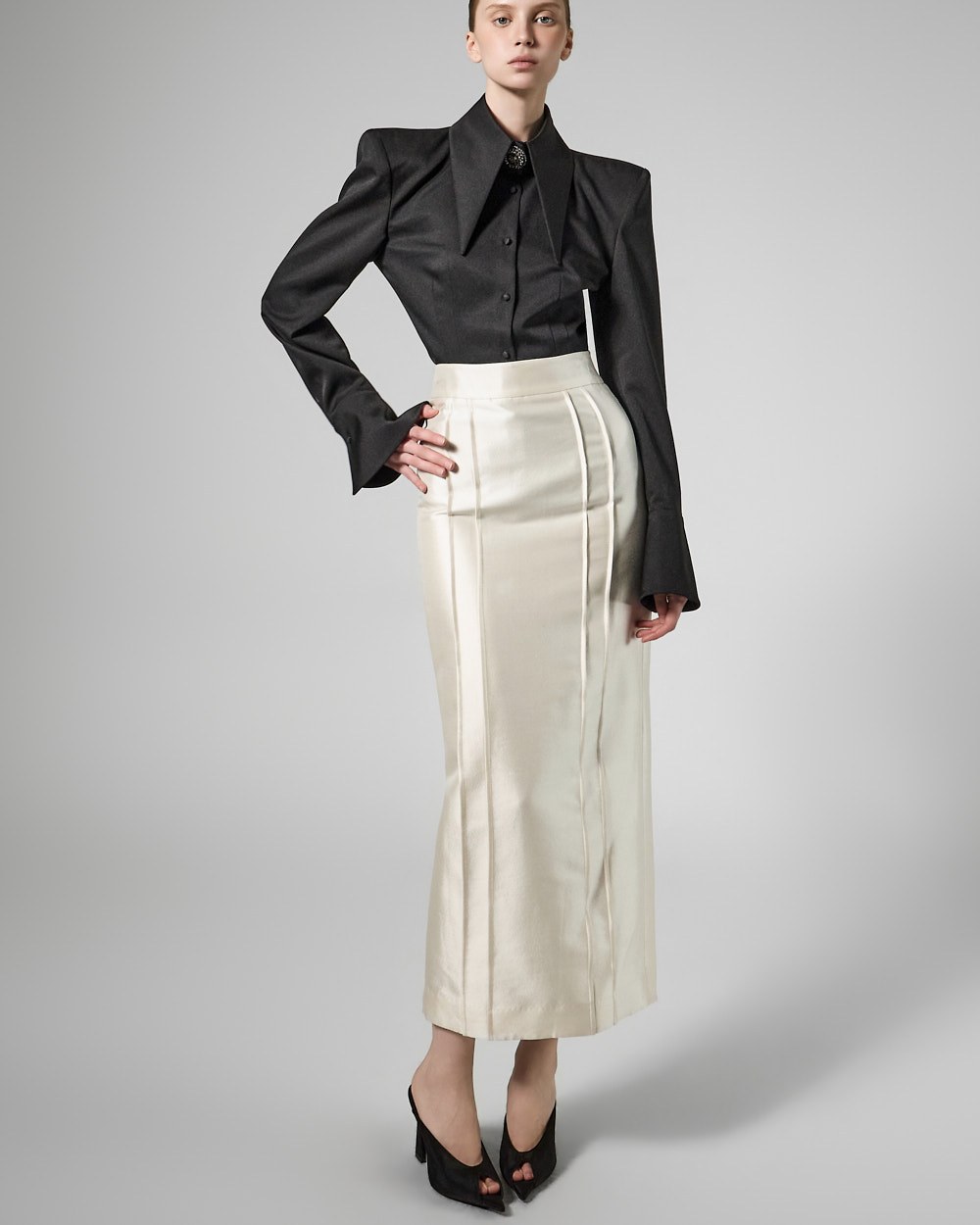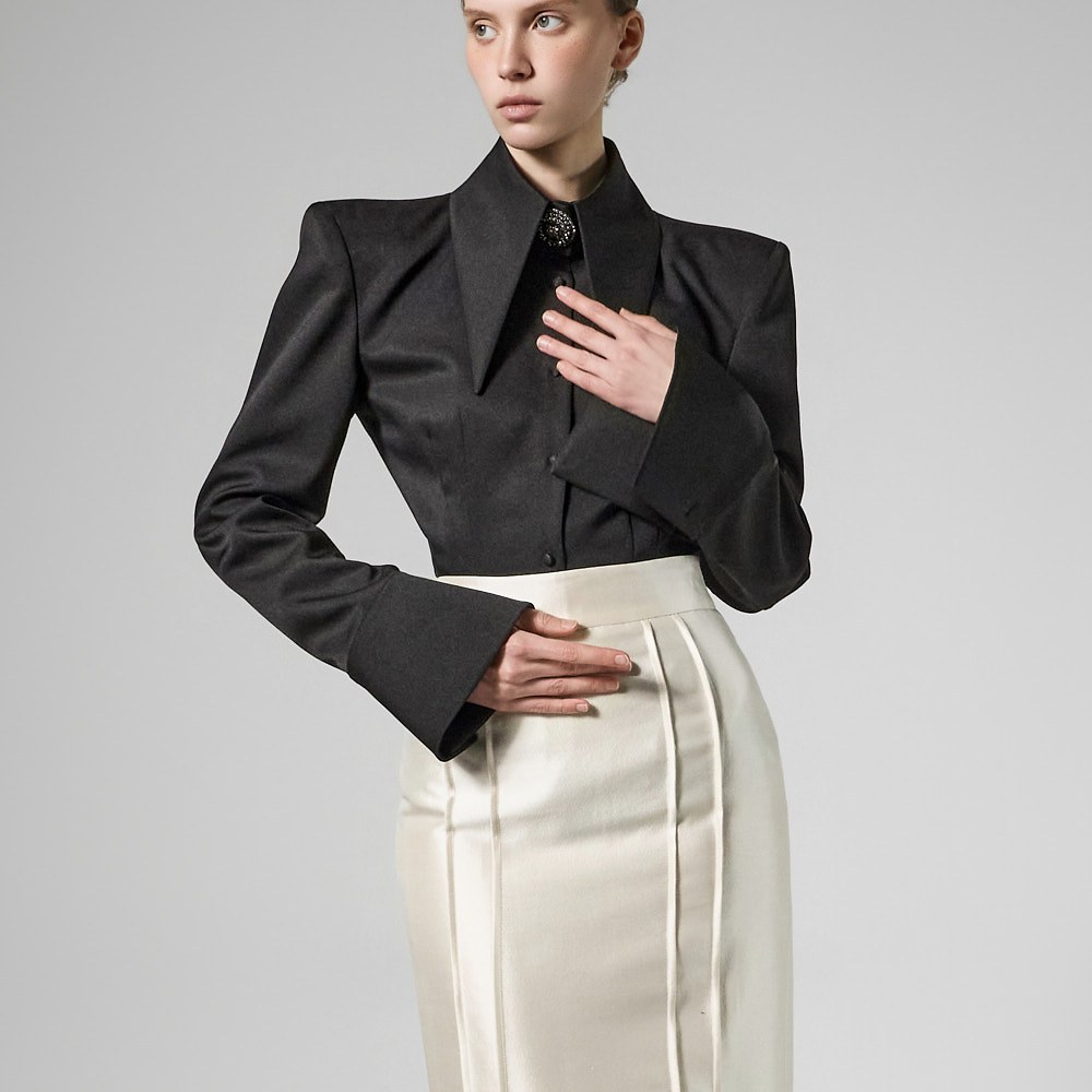 매끄럽게 떨어지는 슬림 핏 실루엣이 바디 라인을 정돈해 주며,
