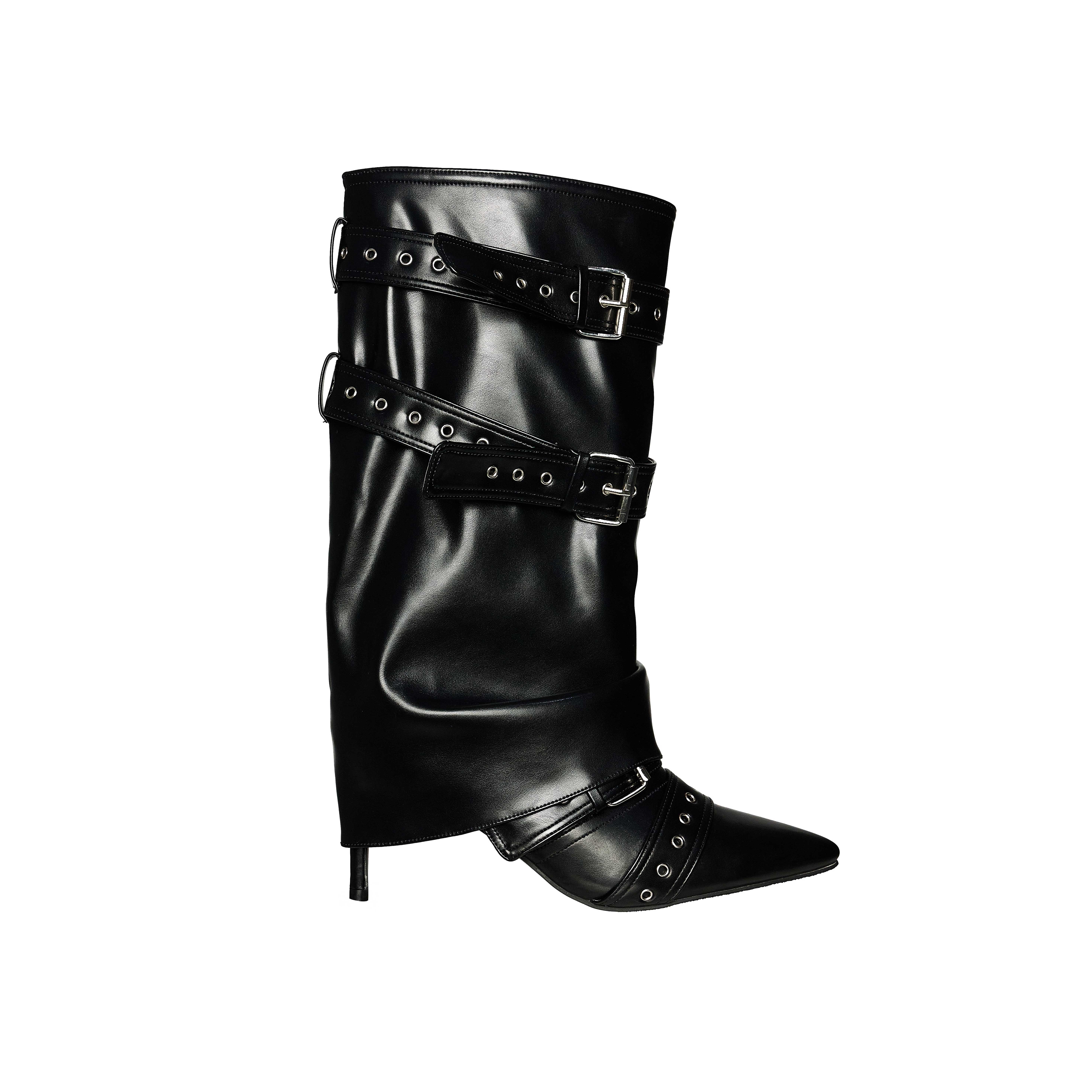 스트랩 벨트 디테일이 강렬한 포인트가 되는 슬라우치 부츠입니다.