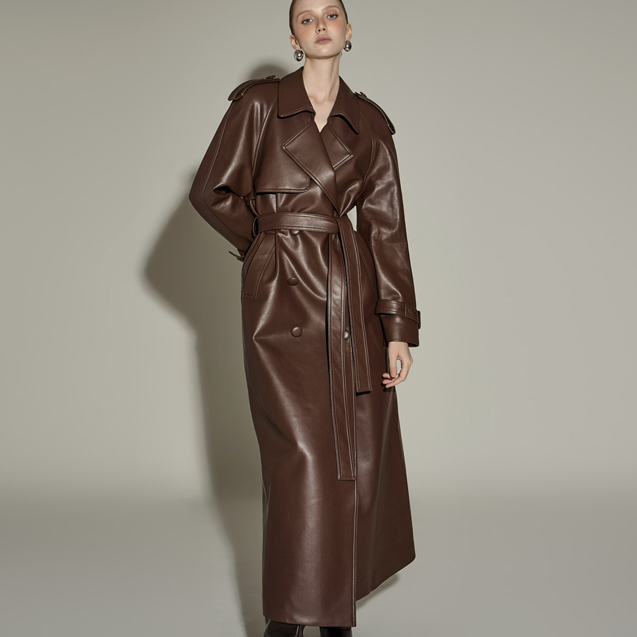 캐주얼한 무드의 벨트 세트 레더 트렌치 코트입니다.