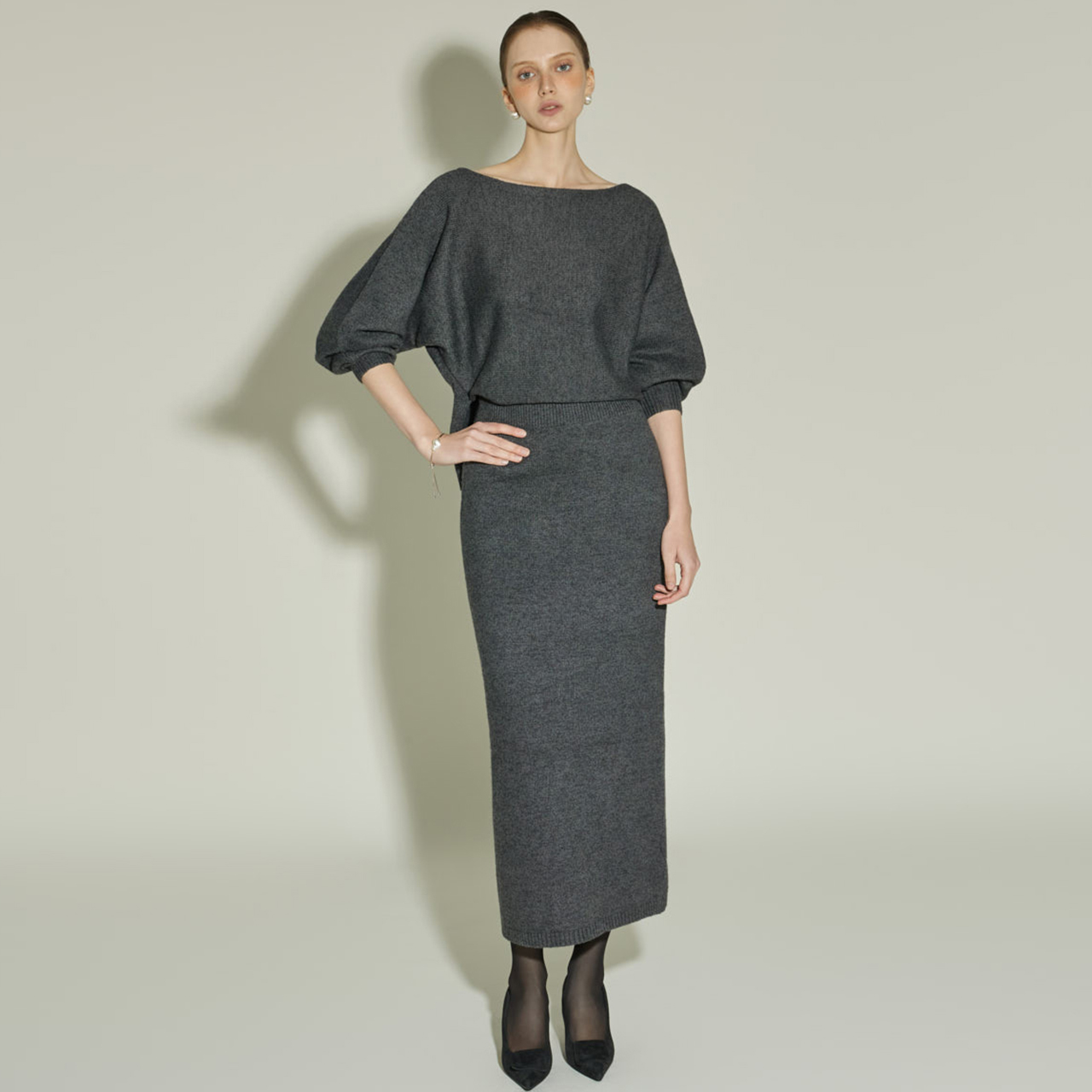 보트넥 라인으로 목선을 여리하게 드러내며,