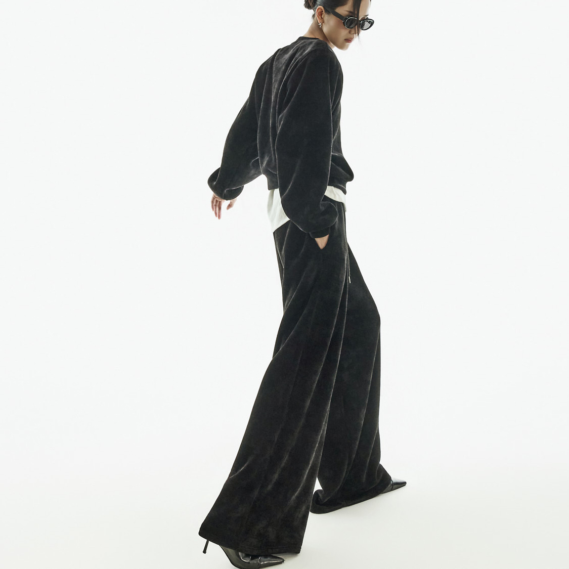 하의는 와이드핏에 전면 핀턱 디테일을 더해