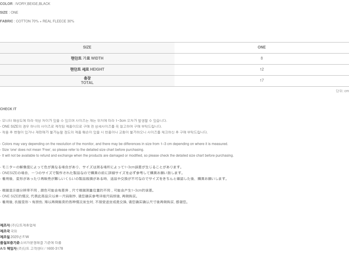 • (주)딘트의 의류는 일반 세탁 및 건조기 사용 시 원단의 변형이나 제품 손상의 원인이 될 수 있으므로, 하단에 안내된 세탁 방법을 따라주시기를 권장합니다.