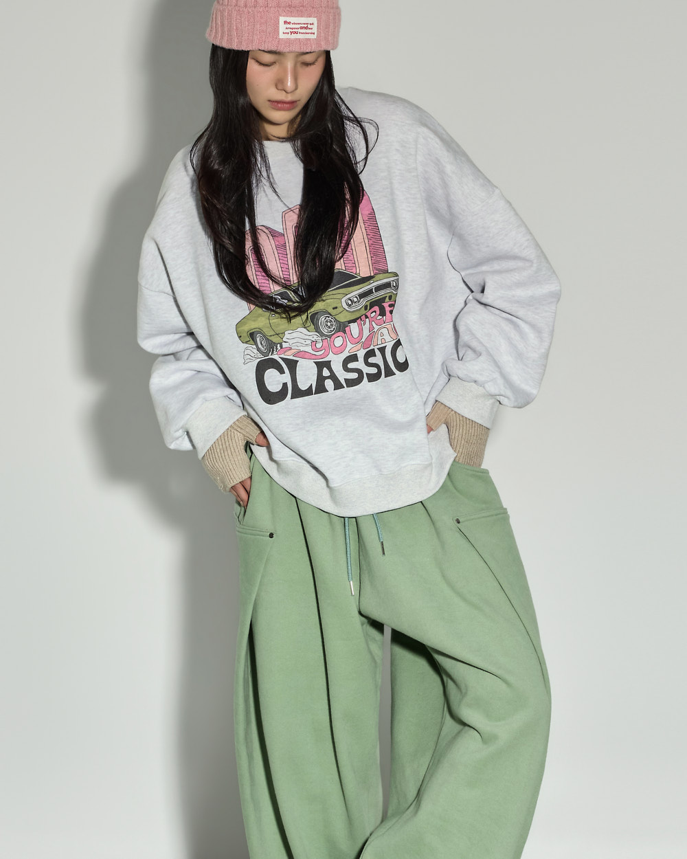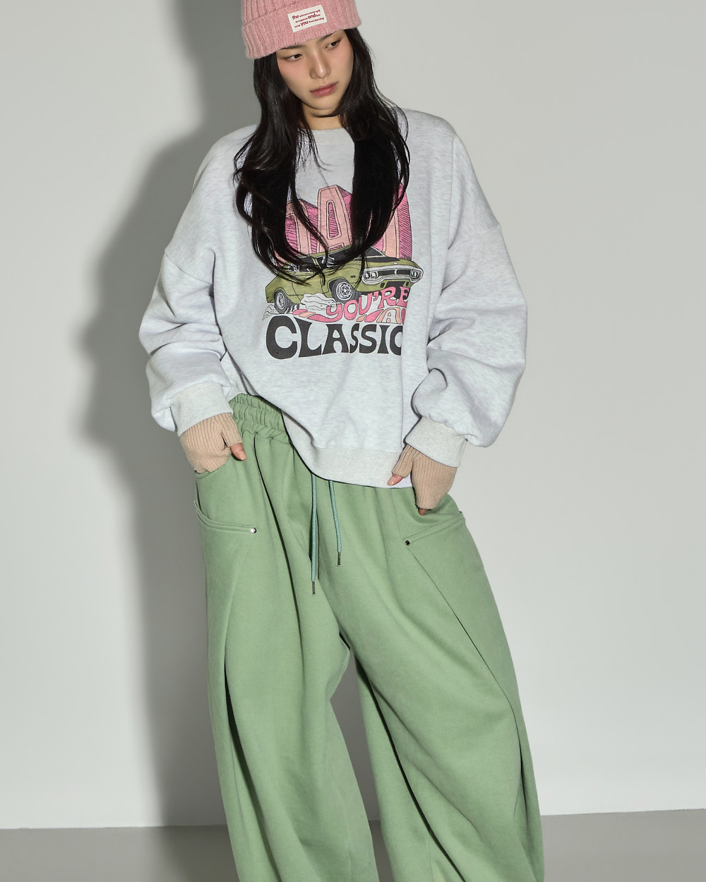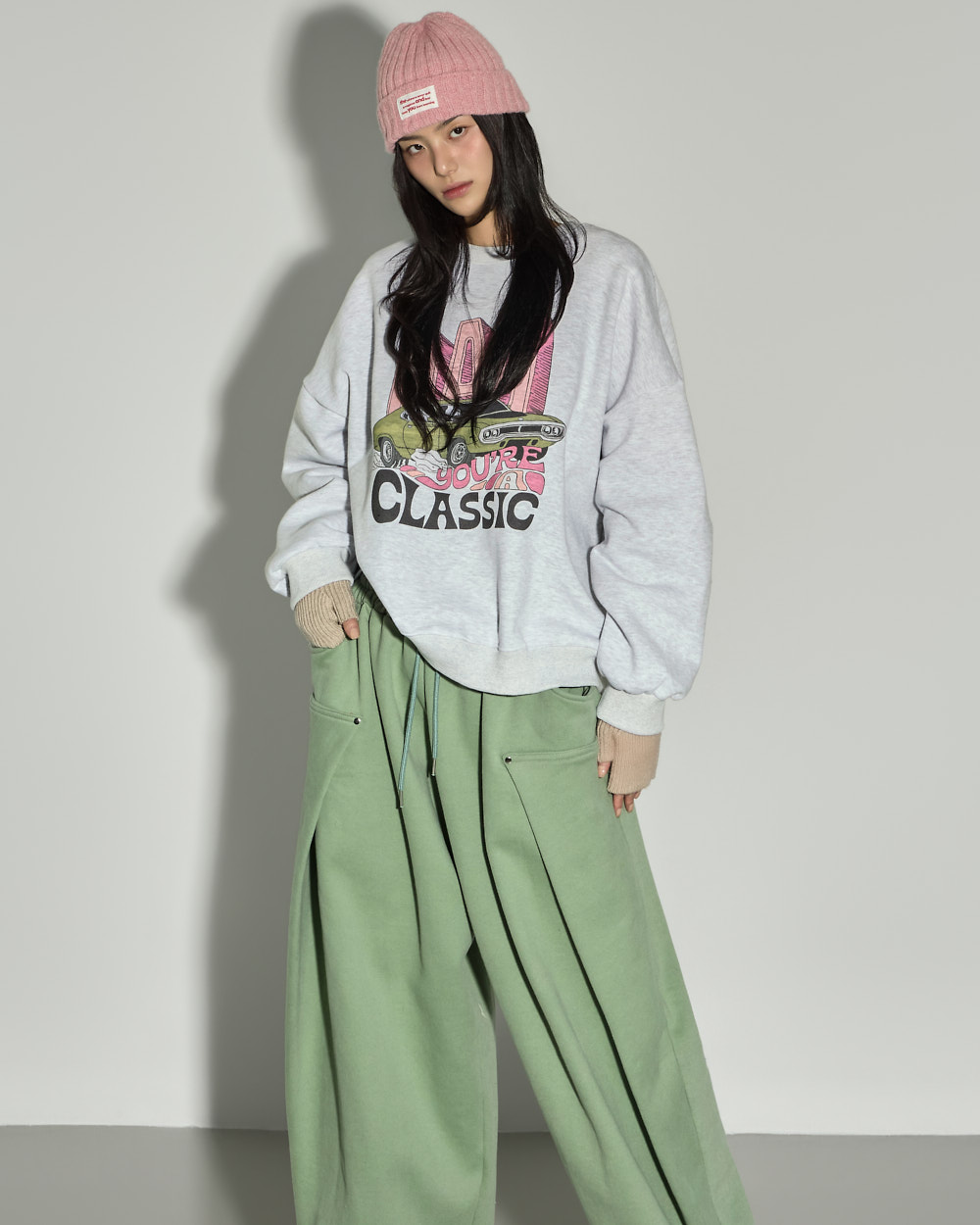 소매 밑단과 밑단 시보리 마감으로 안정적인 핏을 잡아줍니다.