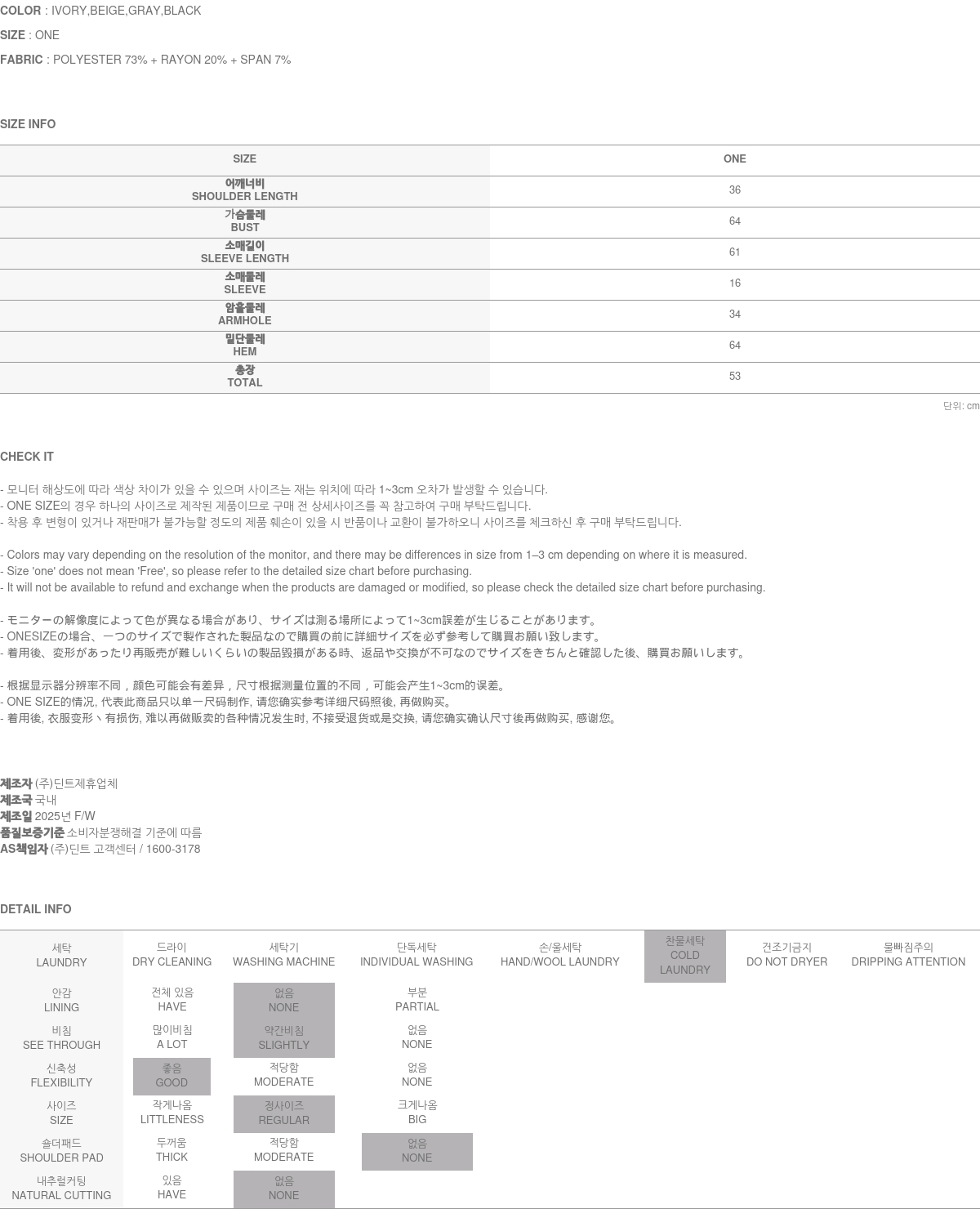 • (주)딘트의 의류는 일반 세탁 및 건조기 사용 시 원단의 변형이나 제품 손상의 원인이 될 수 있으므로, 하단에 안내된 세탁 방법을 따라주시기를 권장합니다.