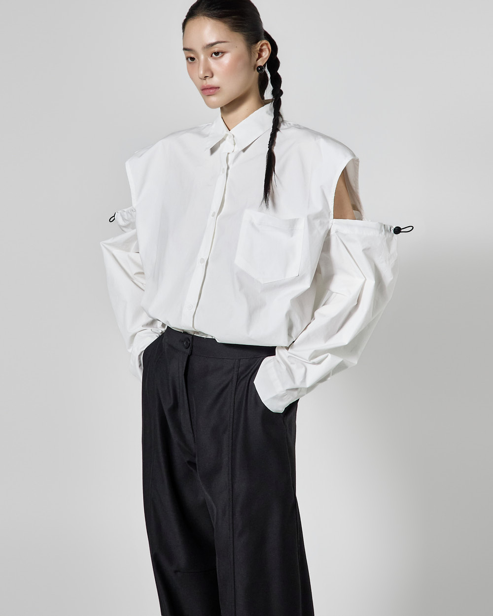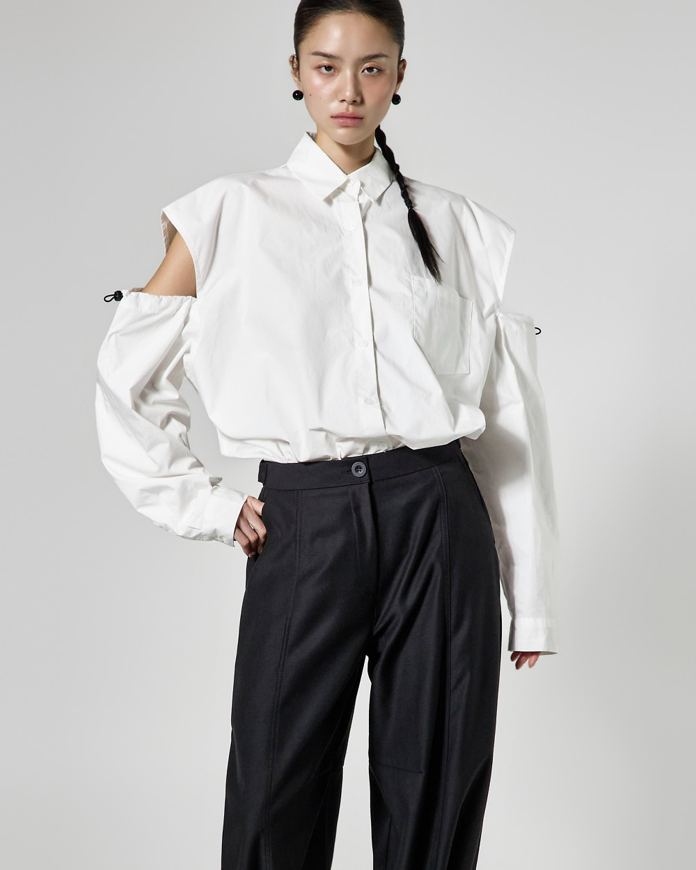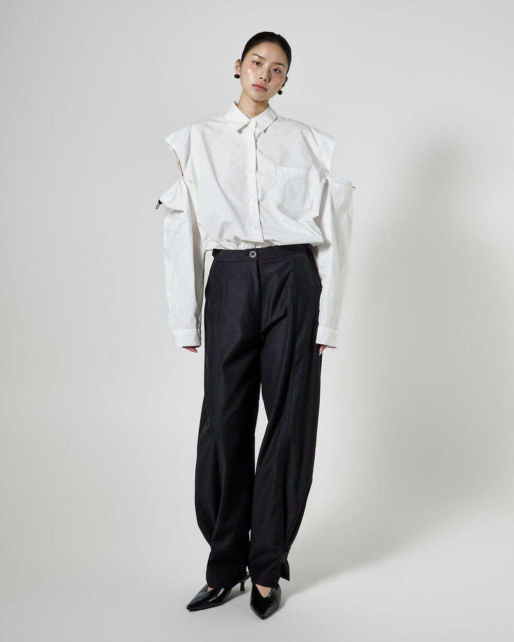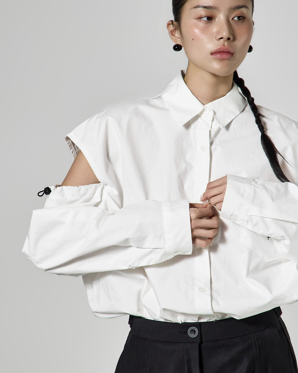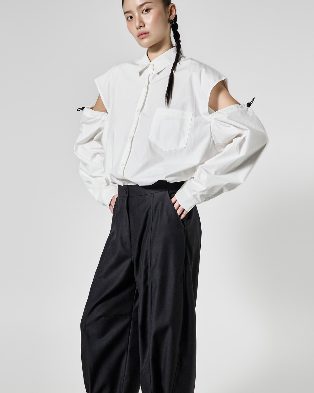 밑단 단추 디테일로 핏 변형이 가능하며,
