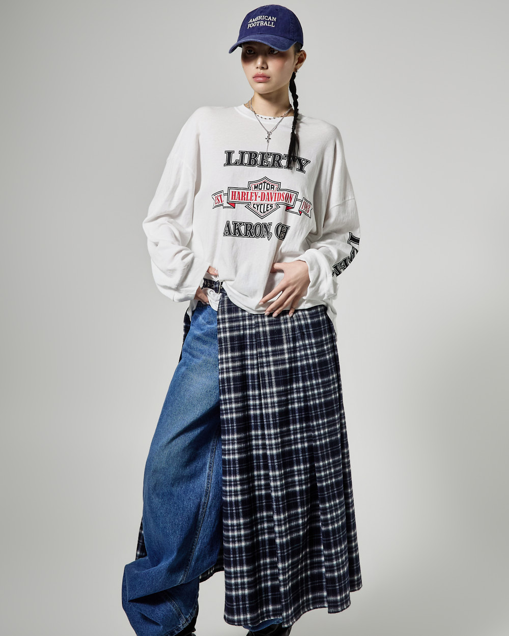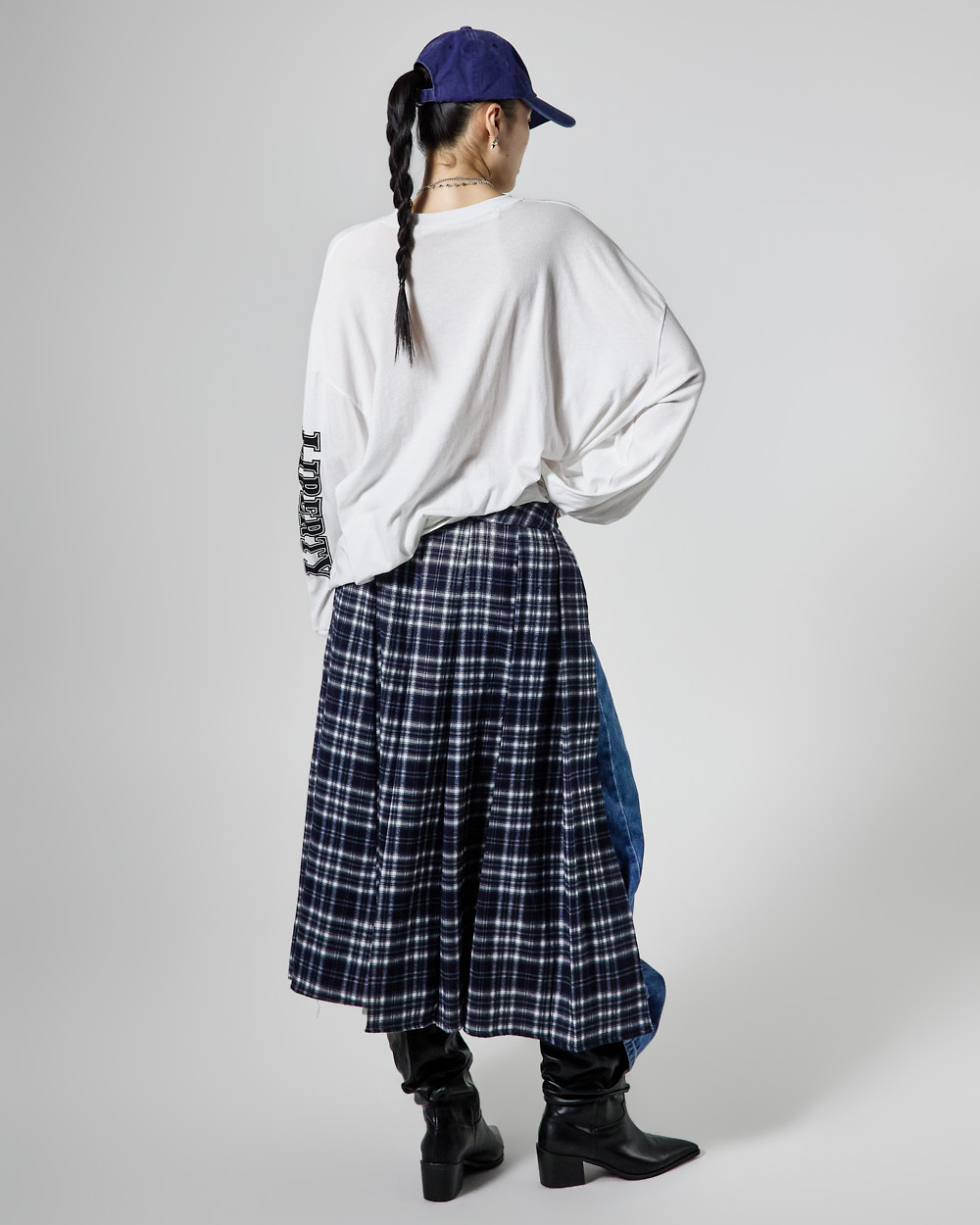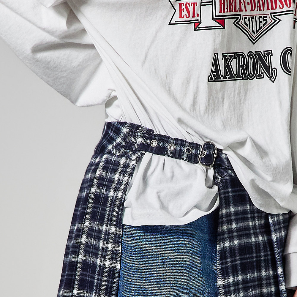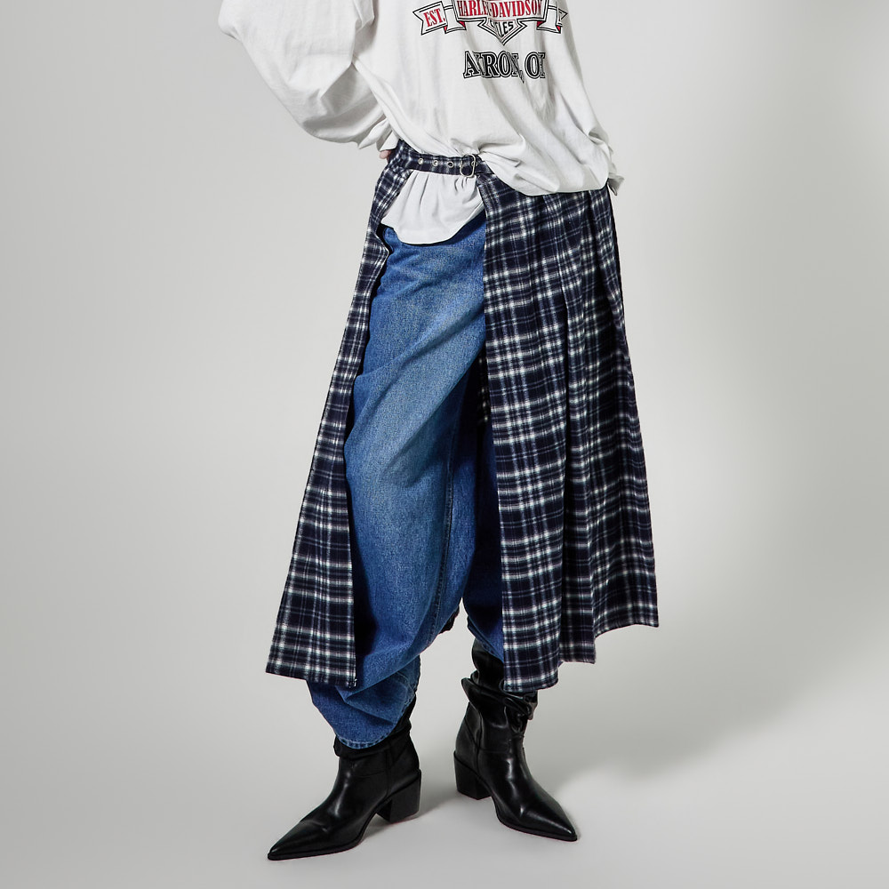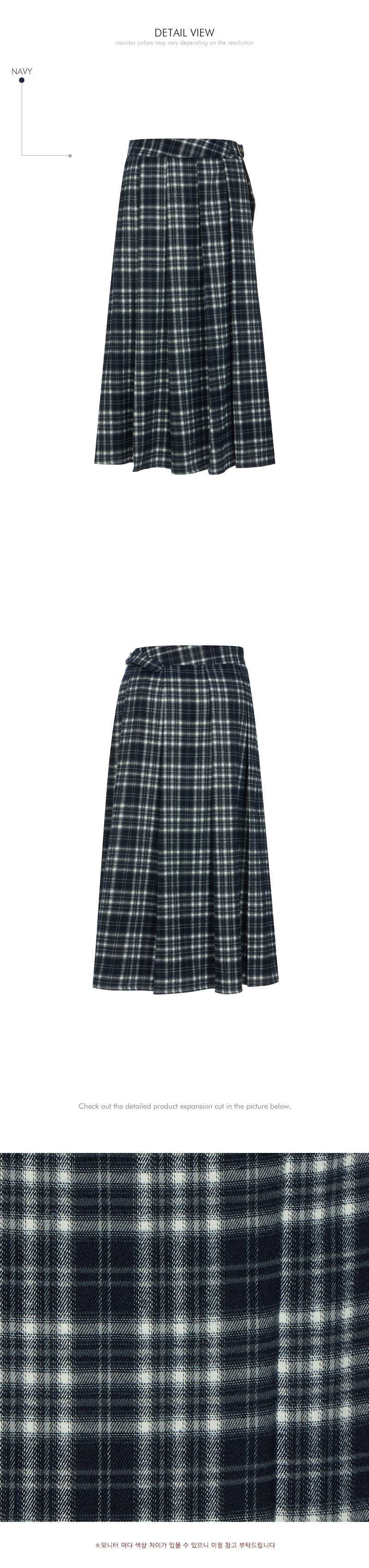 체크 패턴과 플리츠 디테일이 어우러져