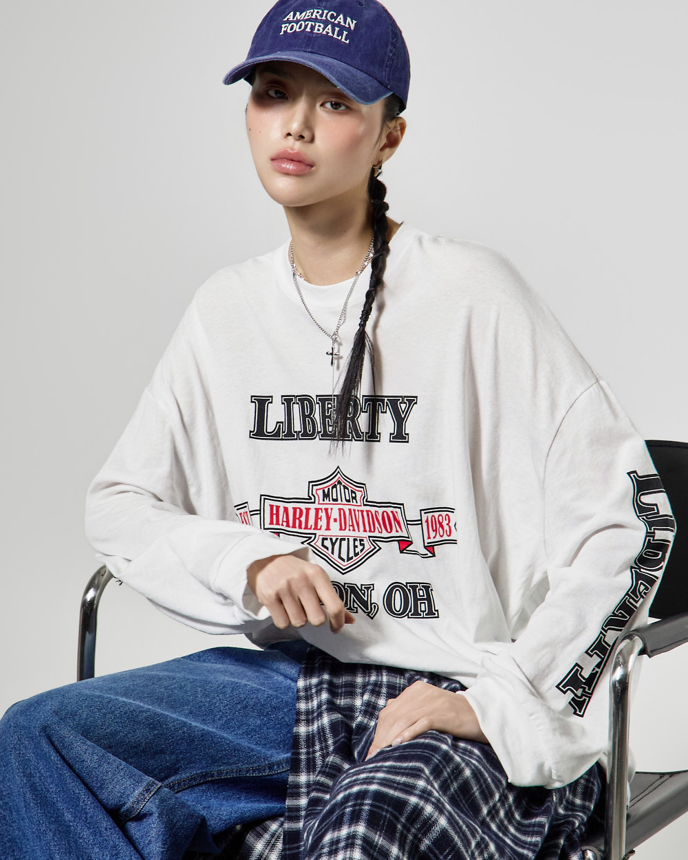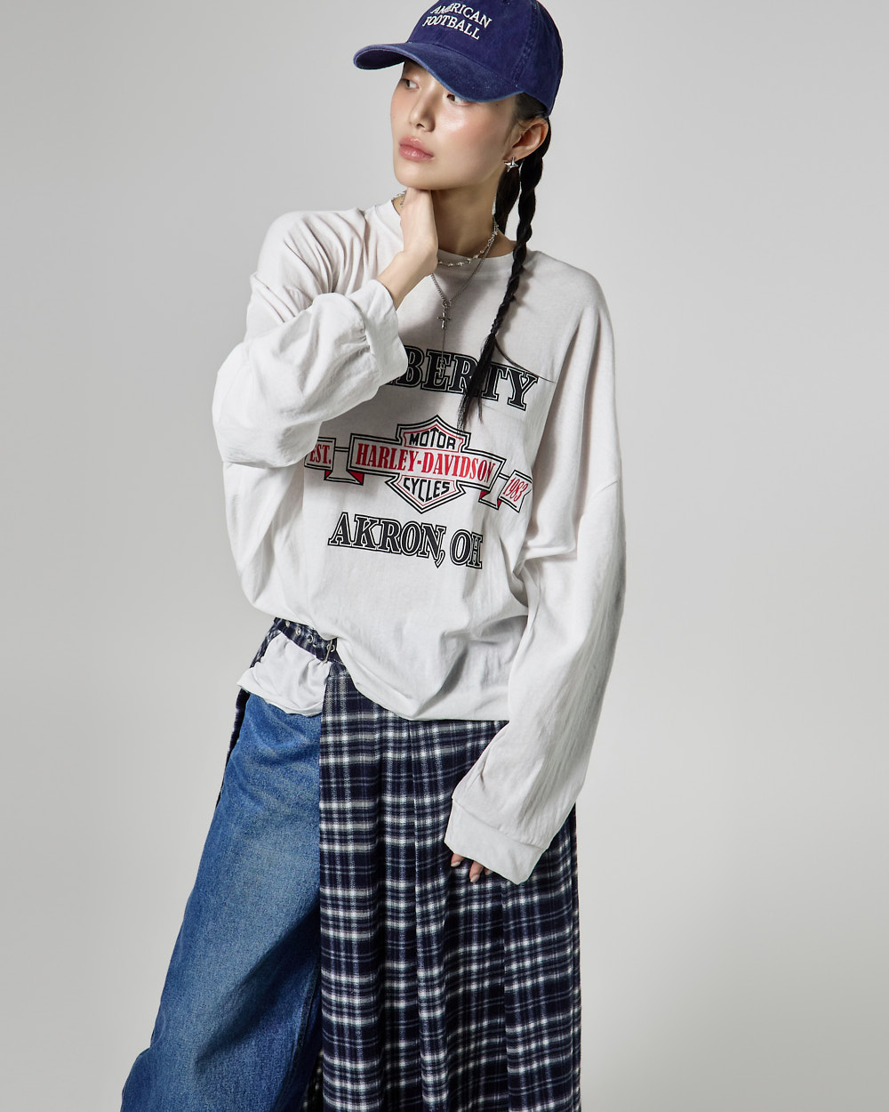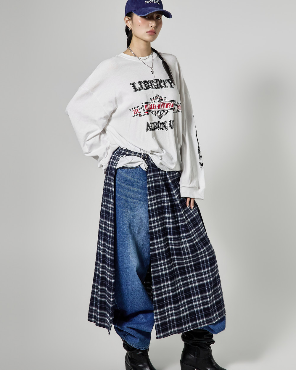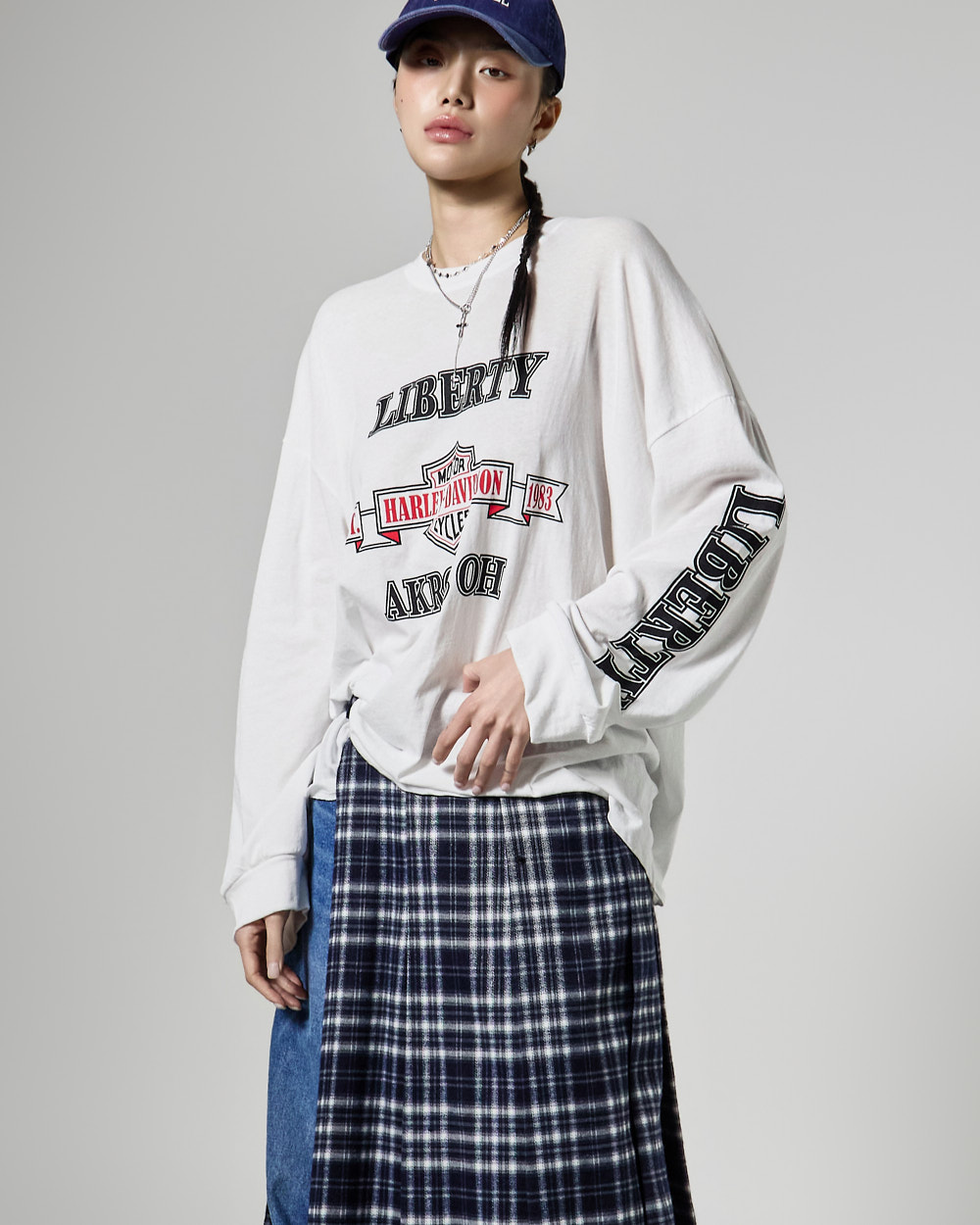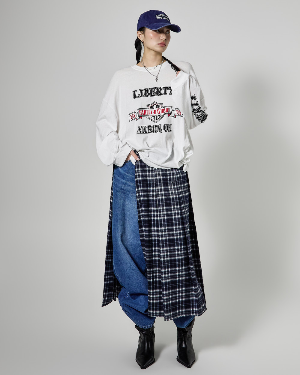 체크 패턴과 플리츠 디테일이 어우러져
