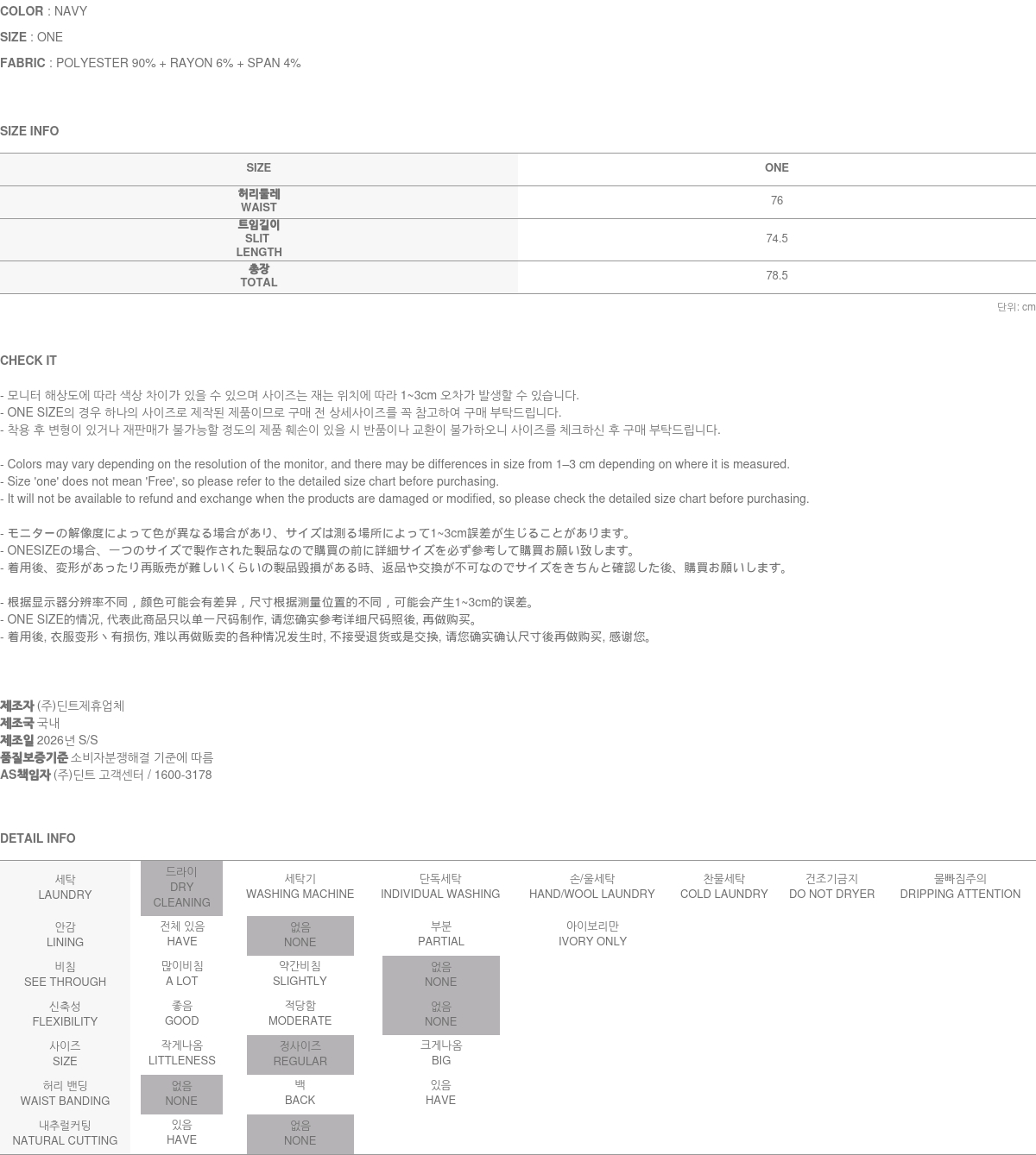 171CM 모델 ONE 사이즈, NAVY 컬러 착용하였습니다.
