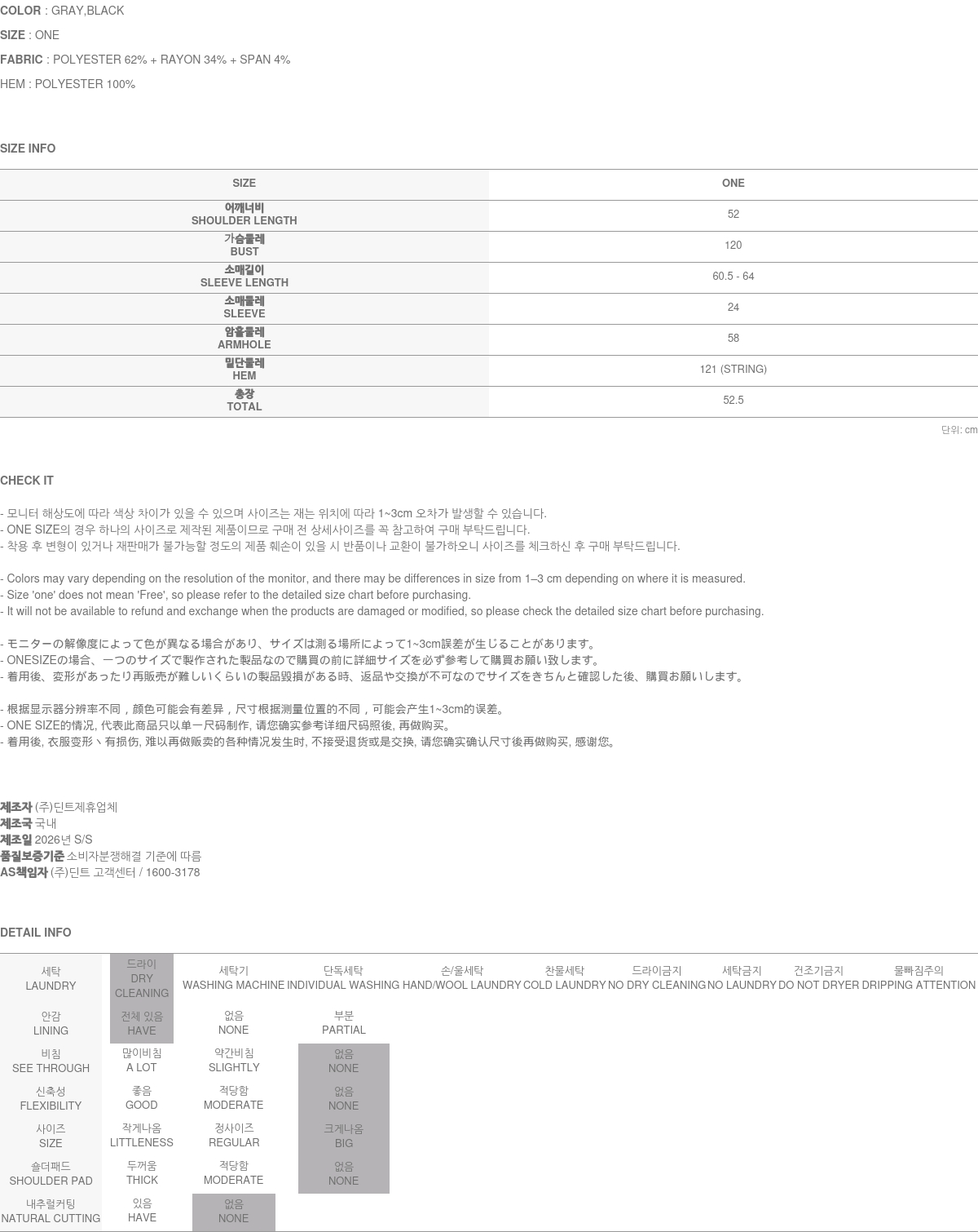 171CM 모델 ONE 사이즈, GRAY 컬러 착용하였습니다.