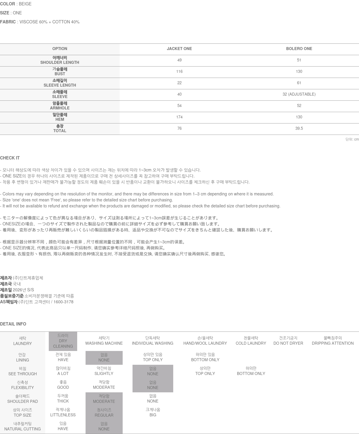 - (주)딘트의 의류는 일반 세탁 및 건조기 사용 시 원단의 변형이나 제품 손상의 원인이 될 수 있으므로, 하단에 안내된 세탁 방법을 따라주시기를 권장합니다.