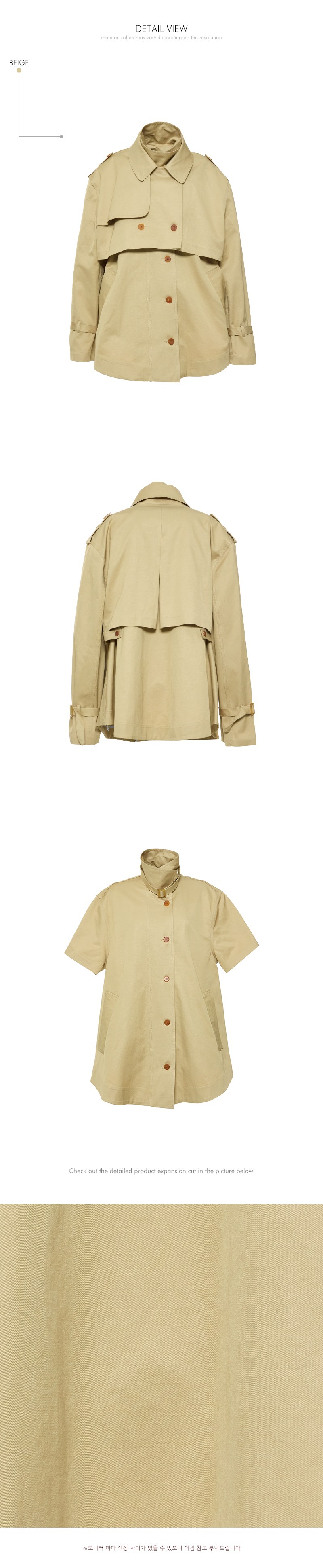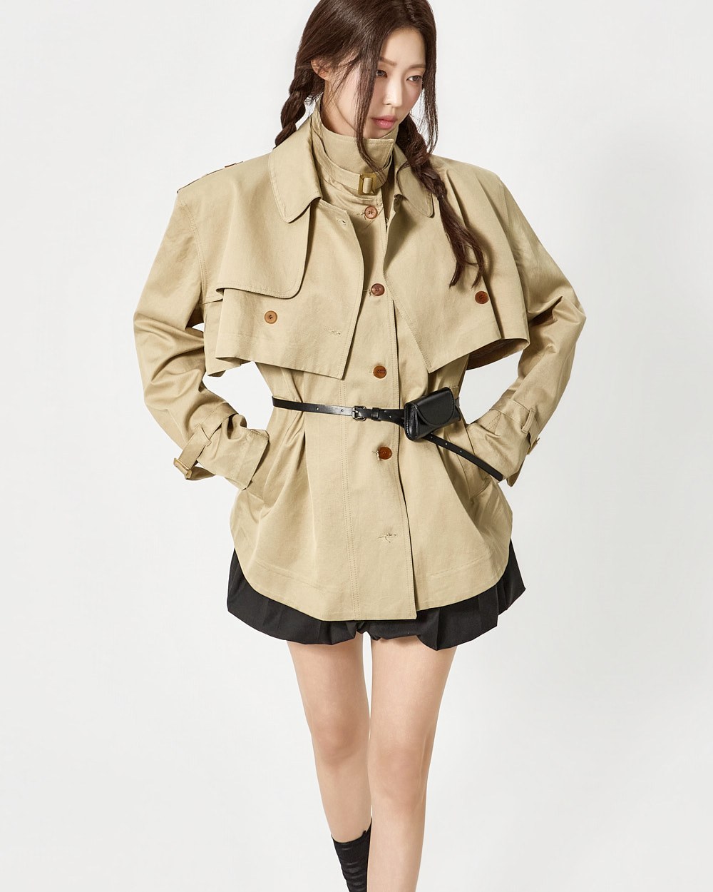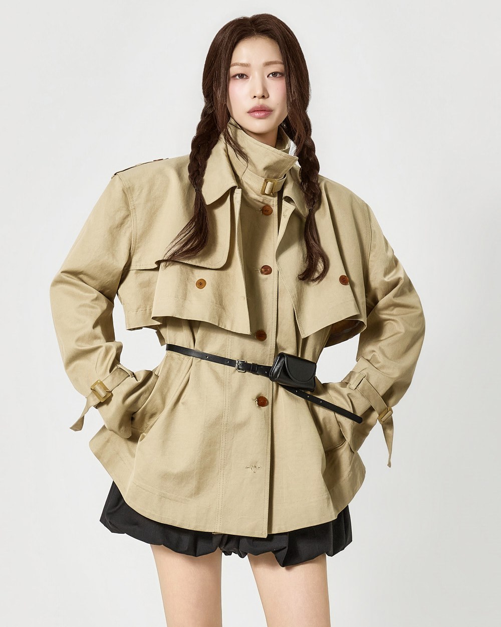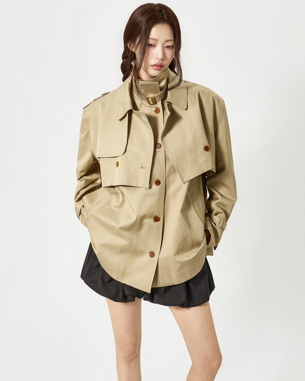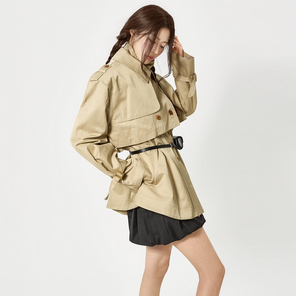 숏 트렌치와 반팔 트렌치 코트가 레이어드된 구성으로