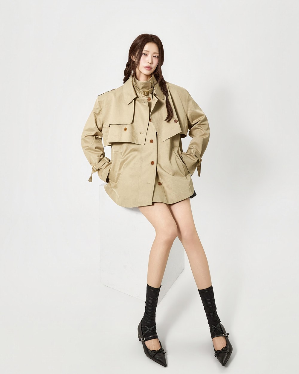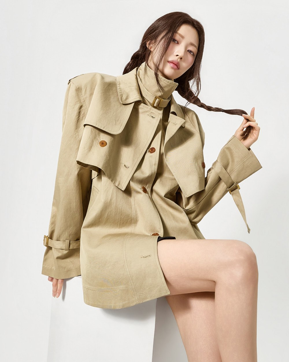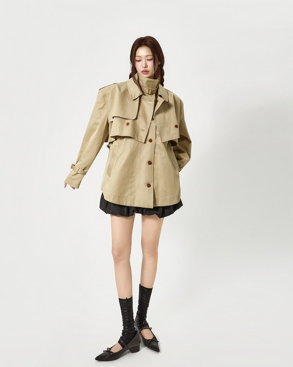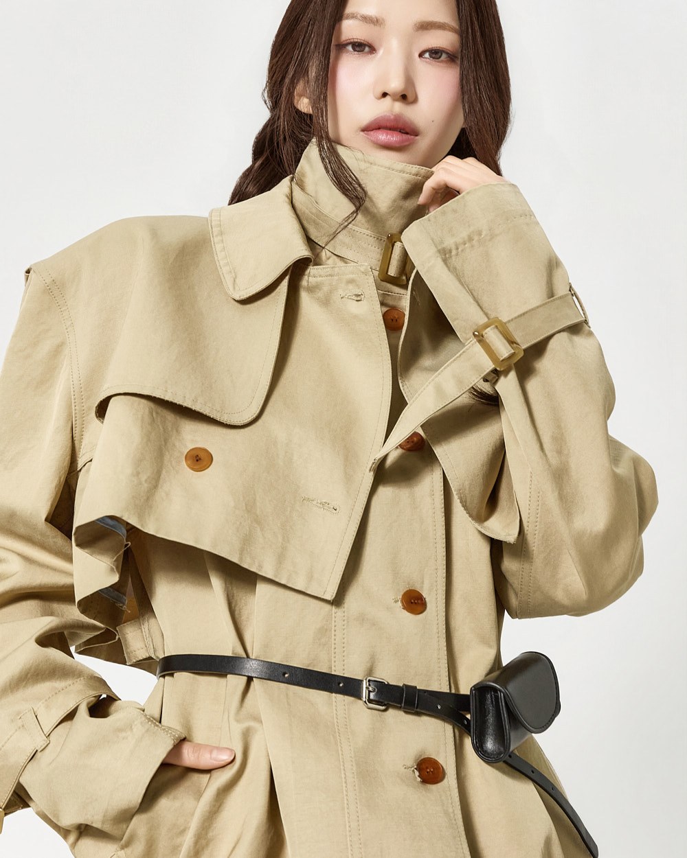 숏 트렌치와 반팔 트렌치 코트가 레이어드된 구성으로