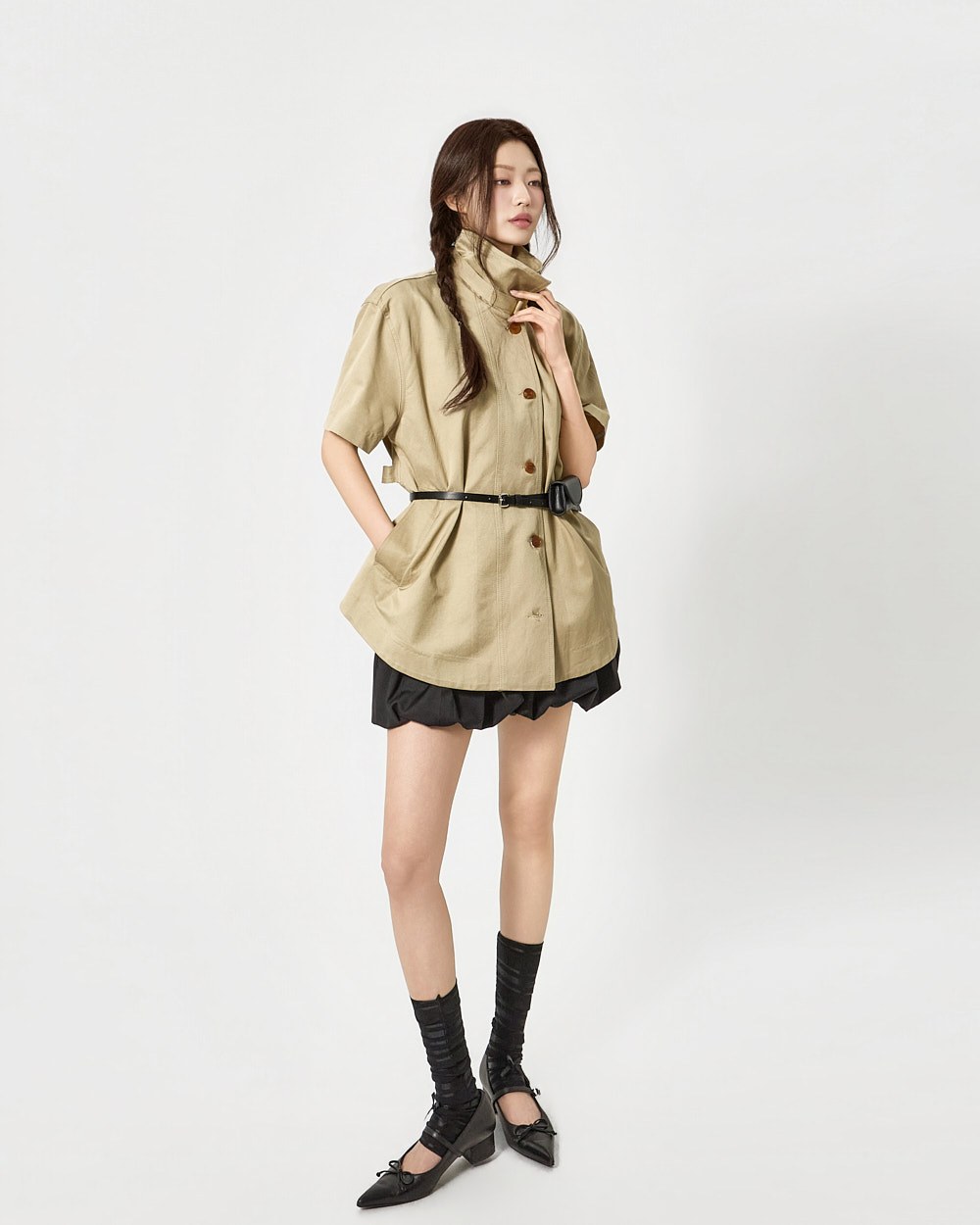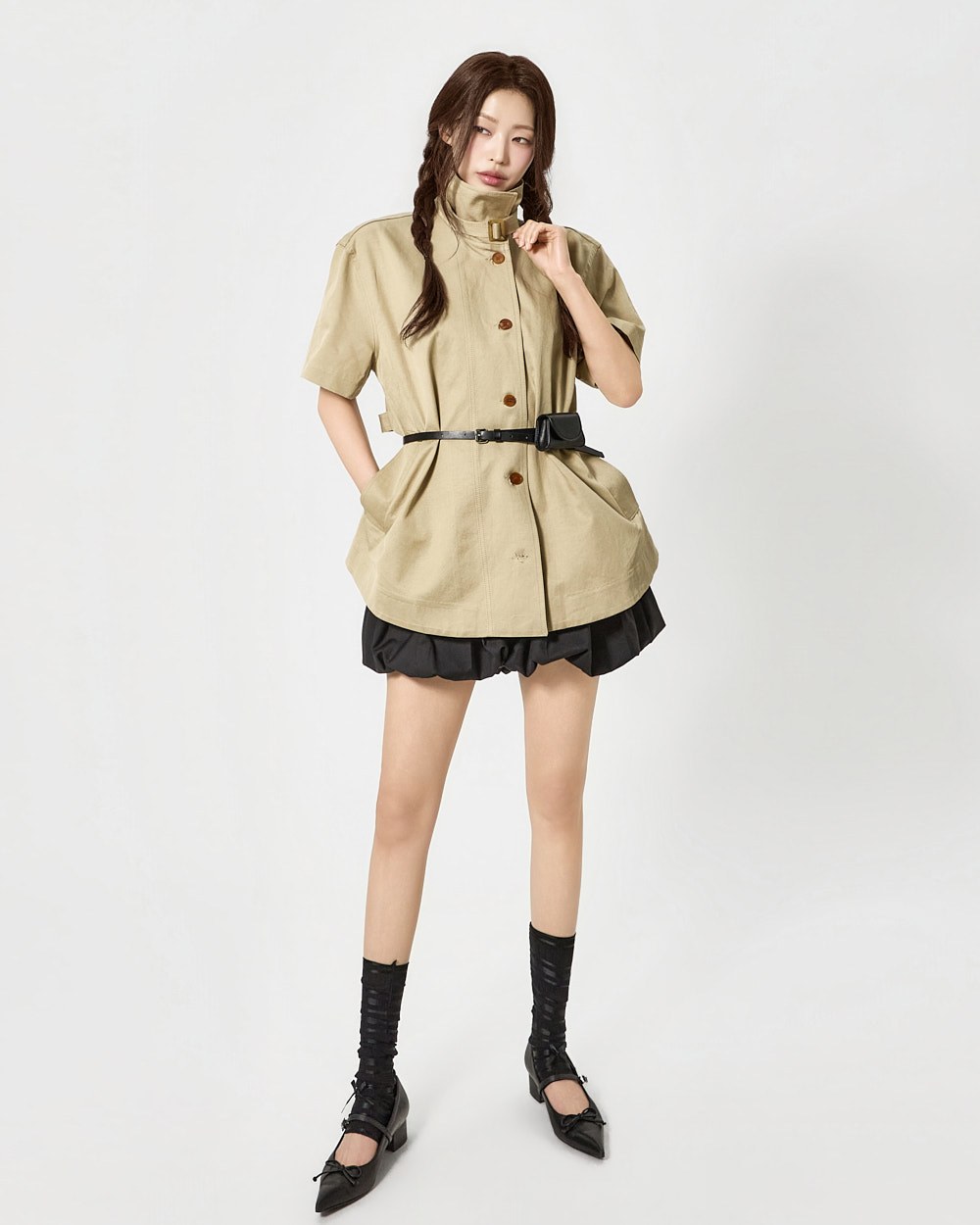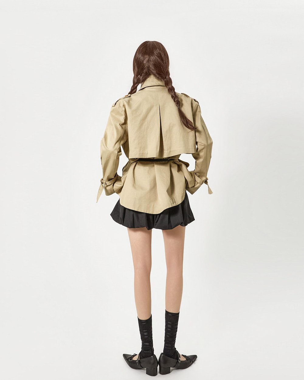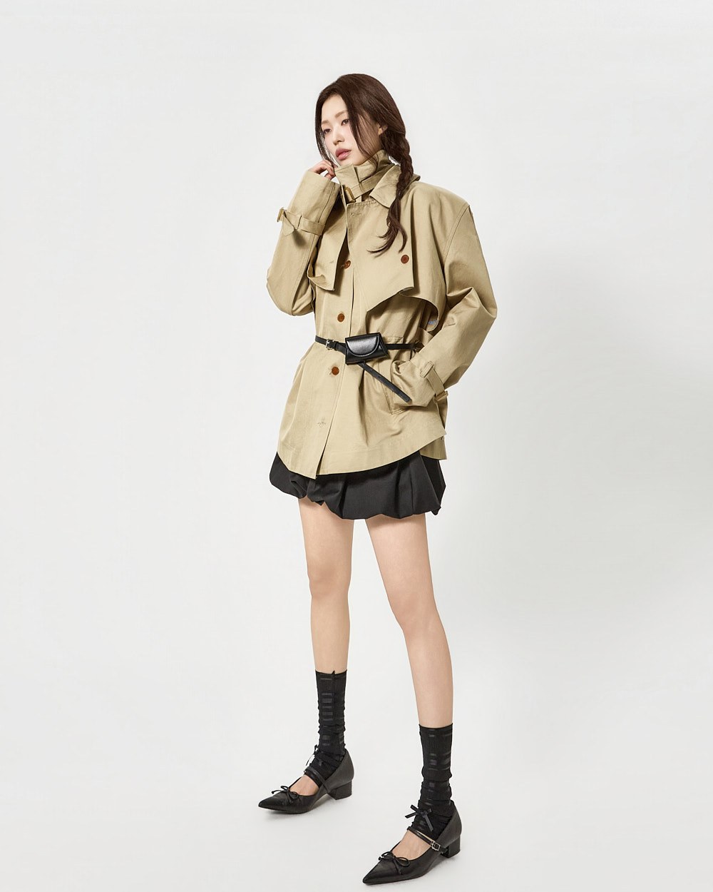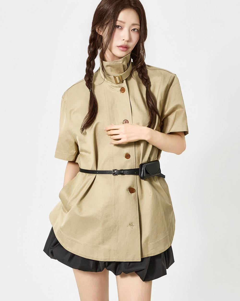 숏 트렌치와 반팔 트렌치 코트가 레이어드된 구성으로