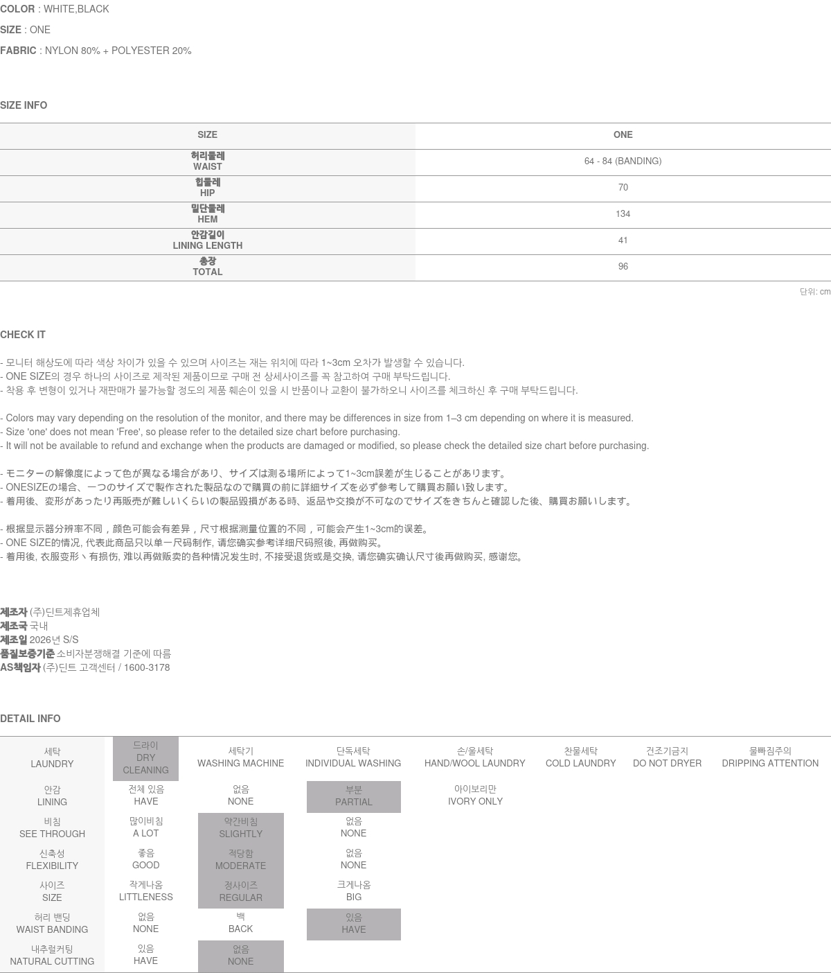 - (주)딘트의 의류는 일반 세탁 및 건조기 사용 시 원단의 변형이나 제품 손상의 원인이 될 수 있으므로, 하단에 안내된 세탁 방법을 따라주시기를 권장합니다.