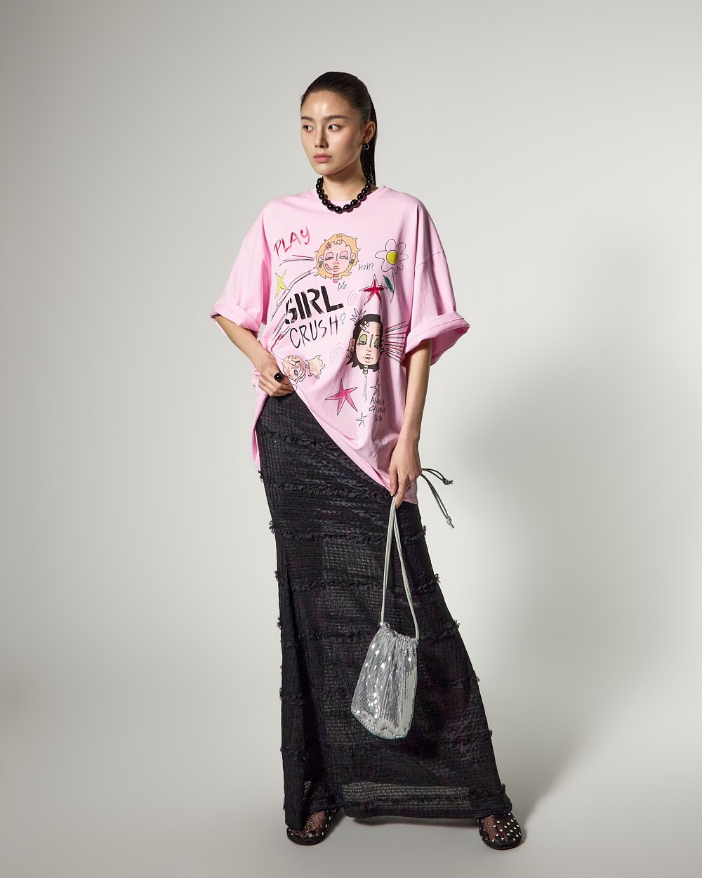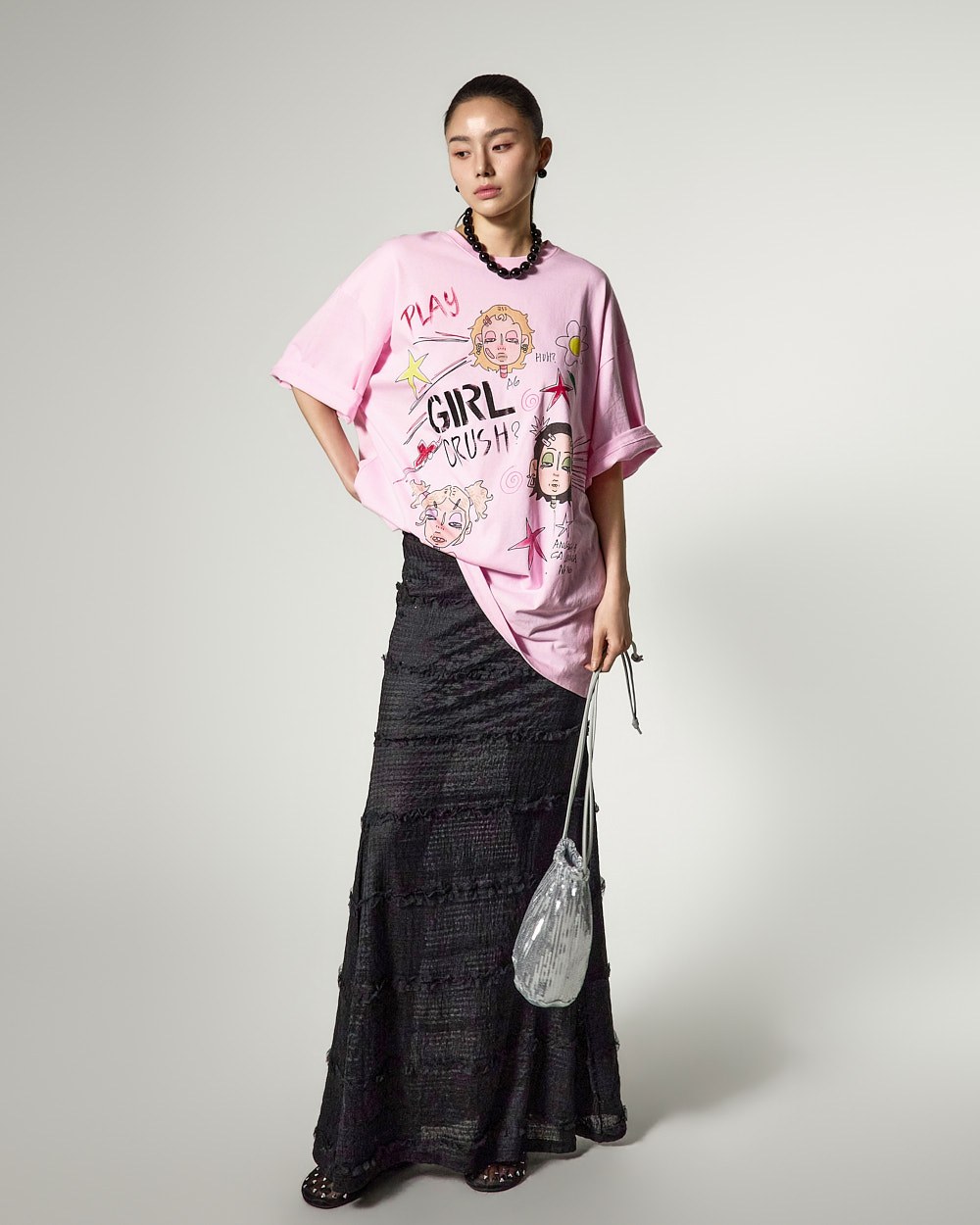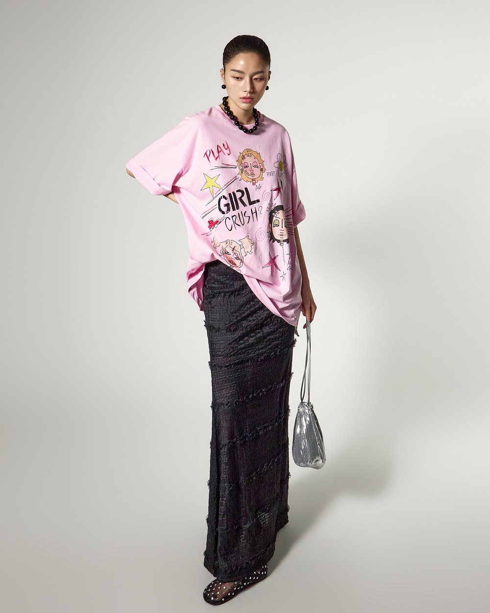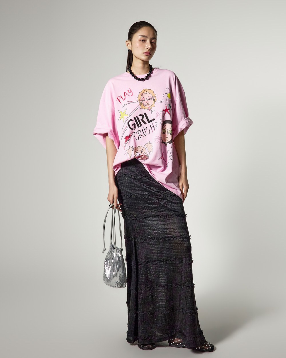 프릴 레이스 디테일로 여성스러운 무드를 강조했으며,