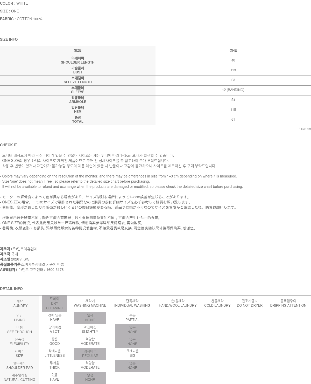 171CM 모델 ONE 사이즈, WHITE 컬러 착용하였습니다.