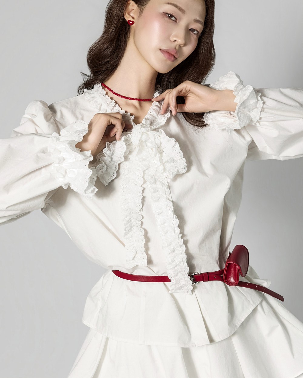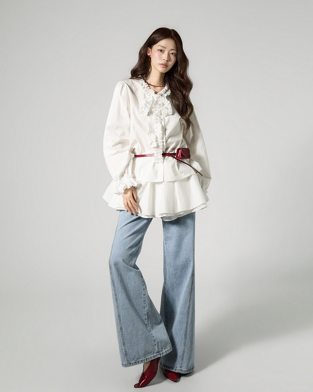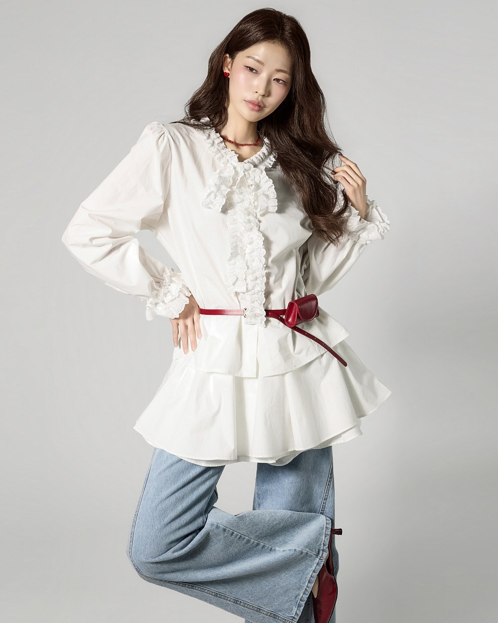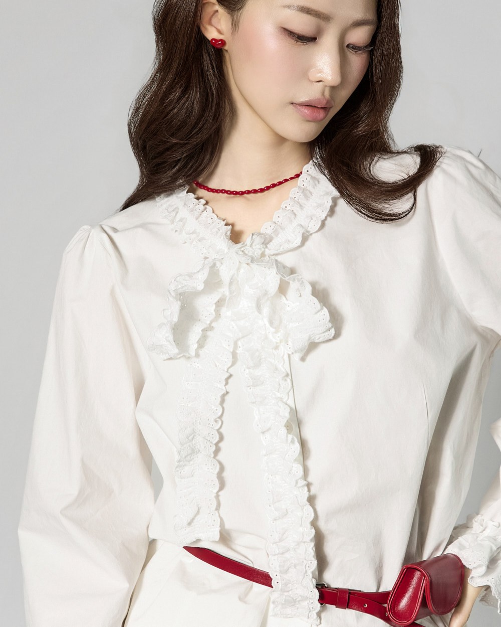 러블리한 무드의 레이스 프릴 블라우스입니다.