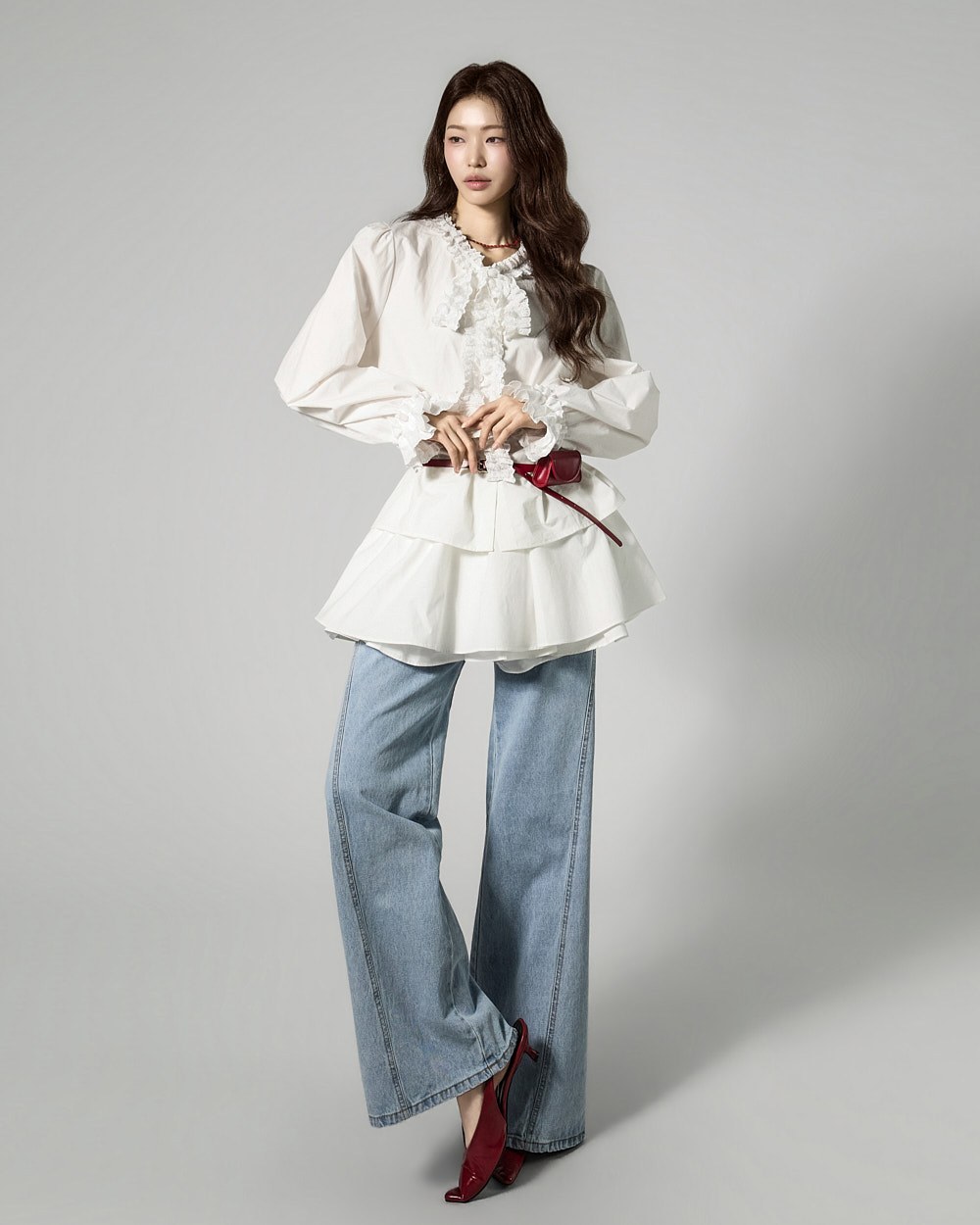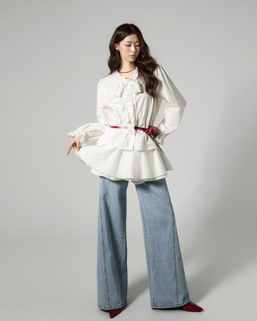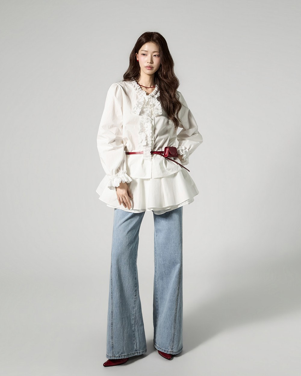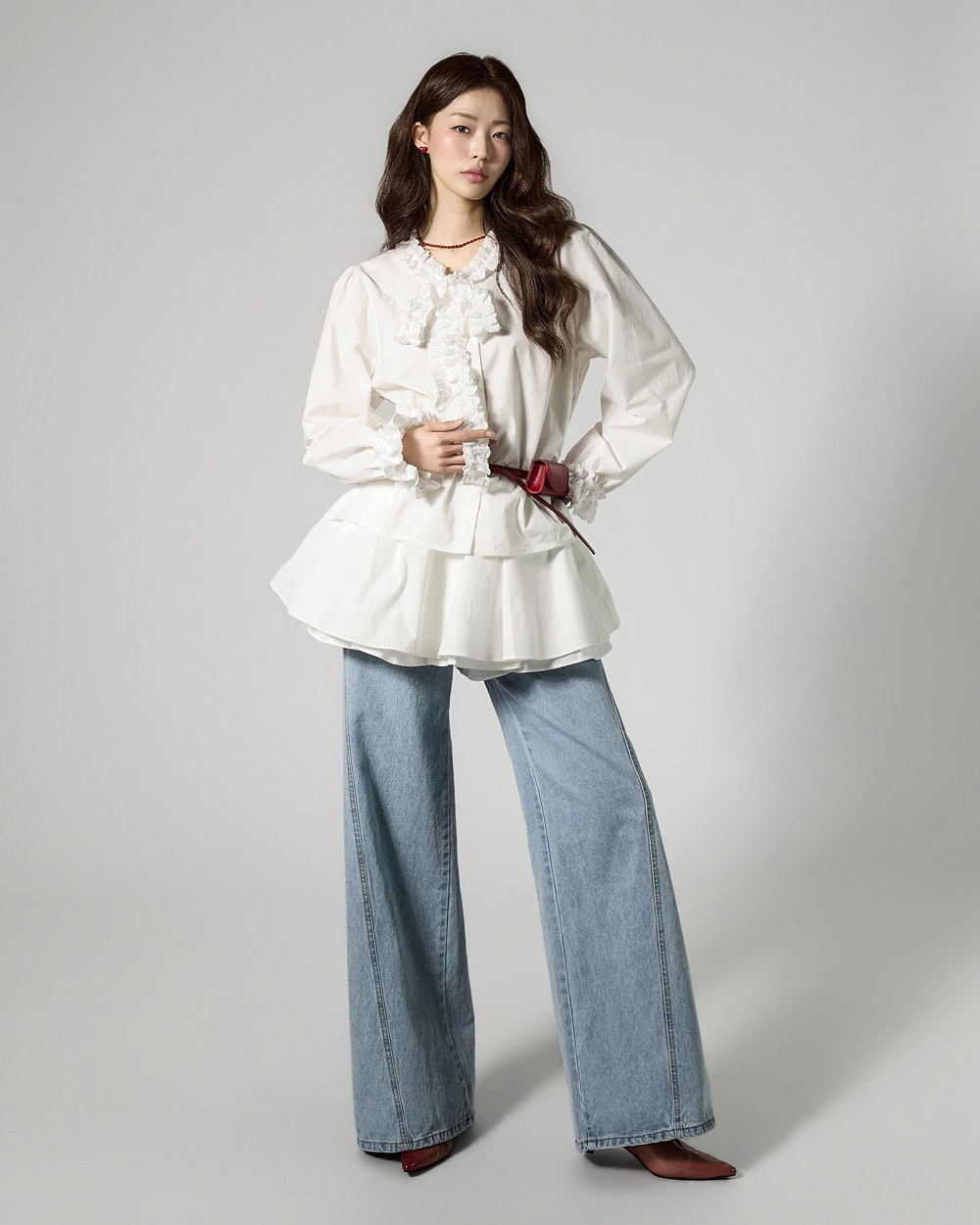 러블리한 무드의 레이스 프릴 블라우스입니다.