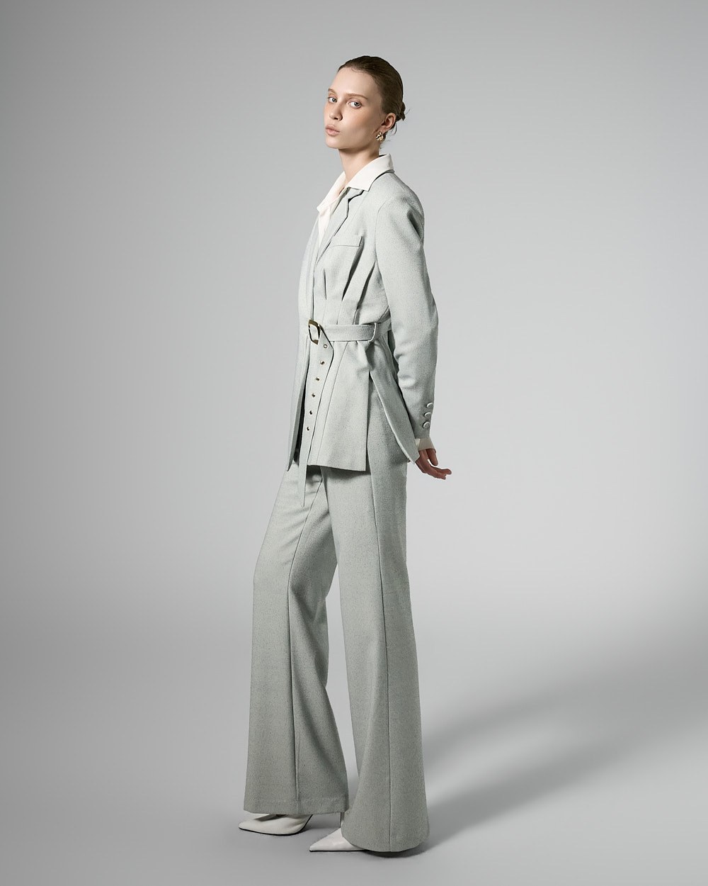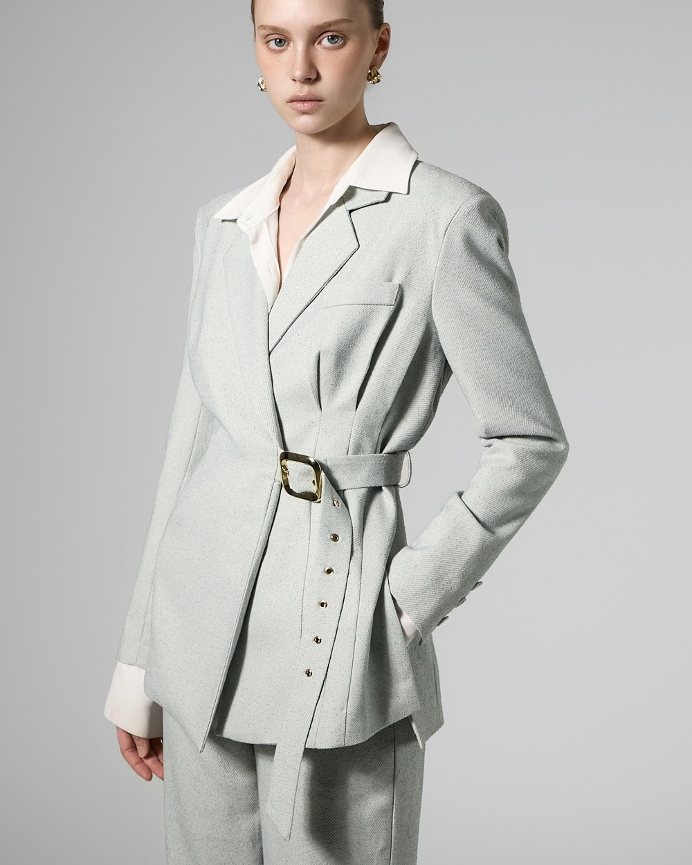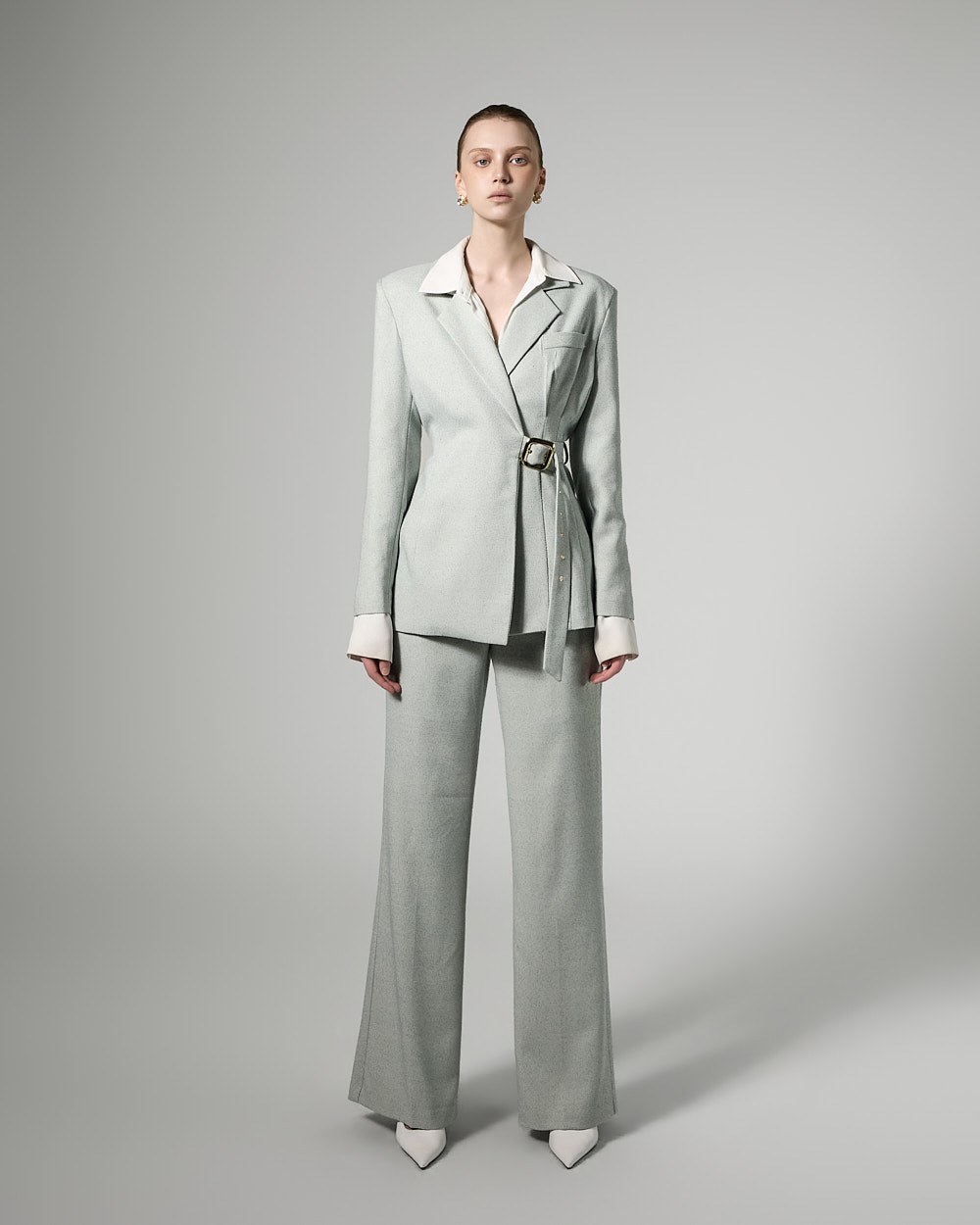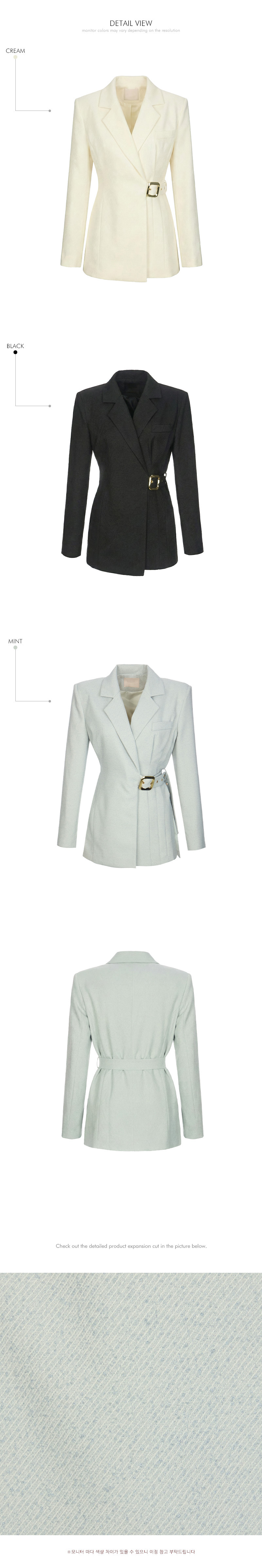 자켓은 슬림핏 실루엣에 히든 단추 여밈으로