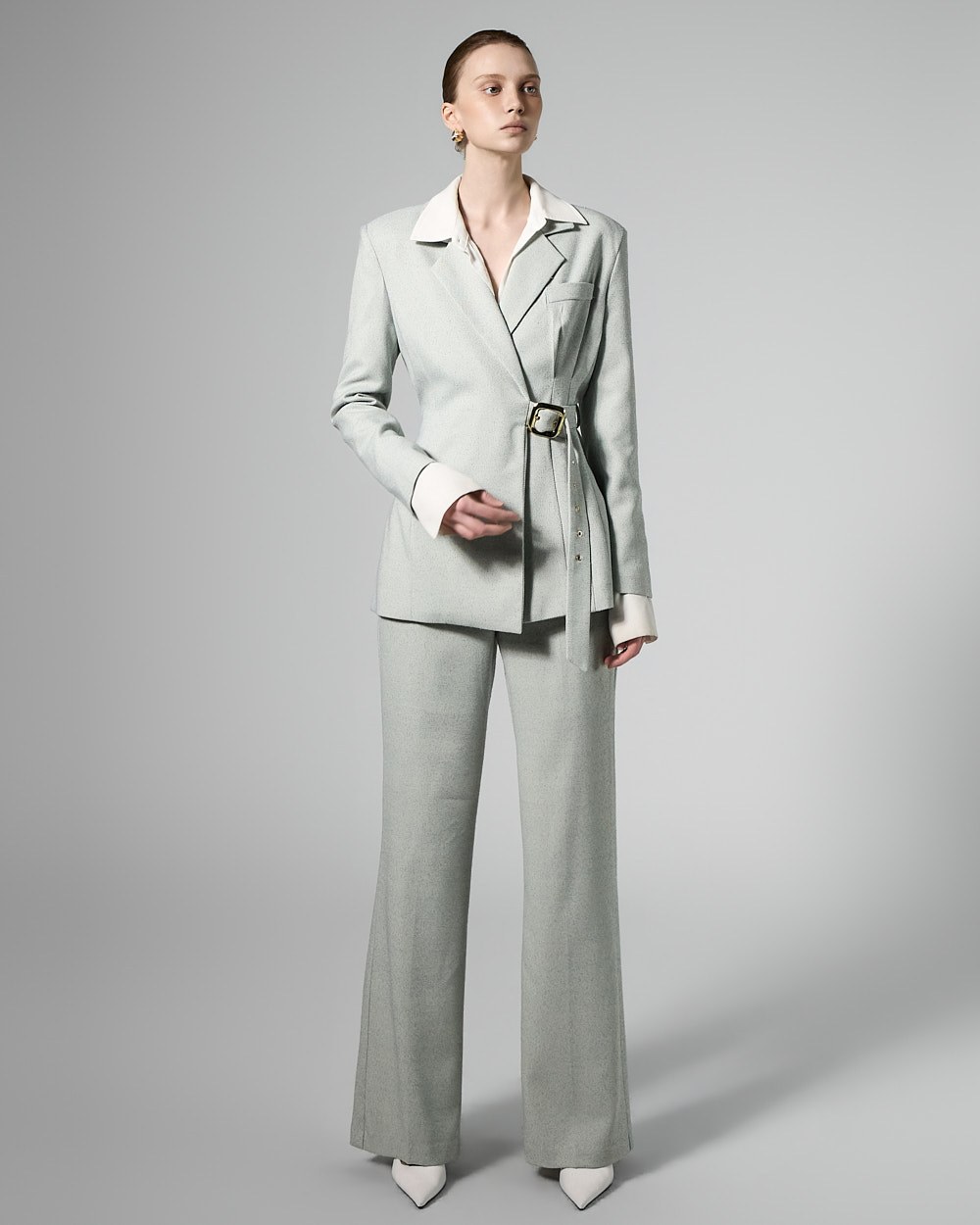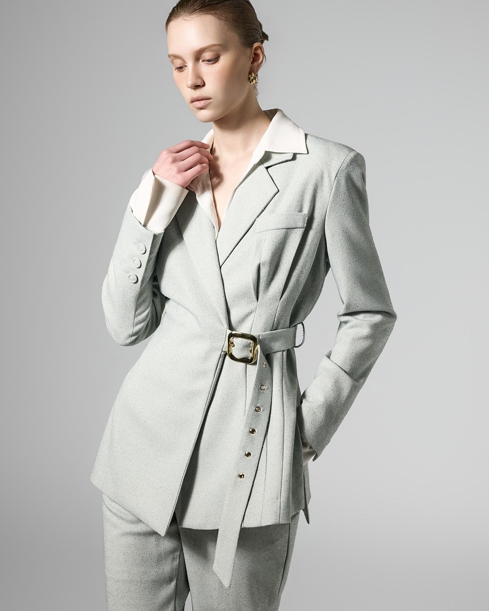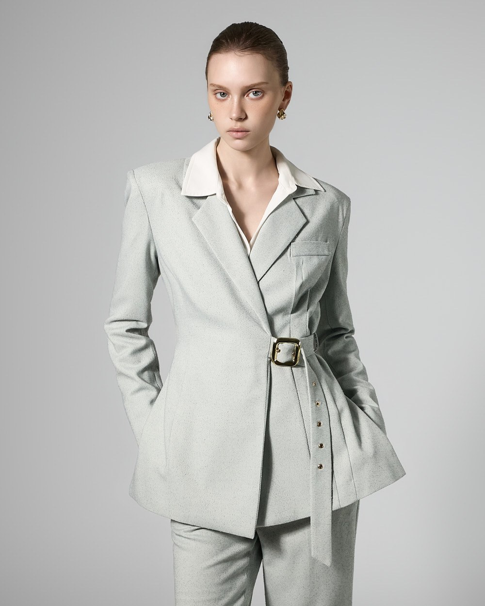 자켓은 슬림핏 실루엣에 히든 단추 여밈으로