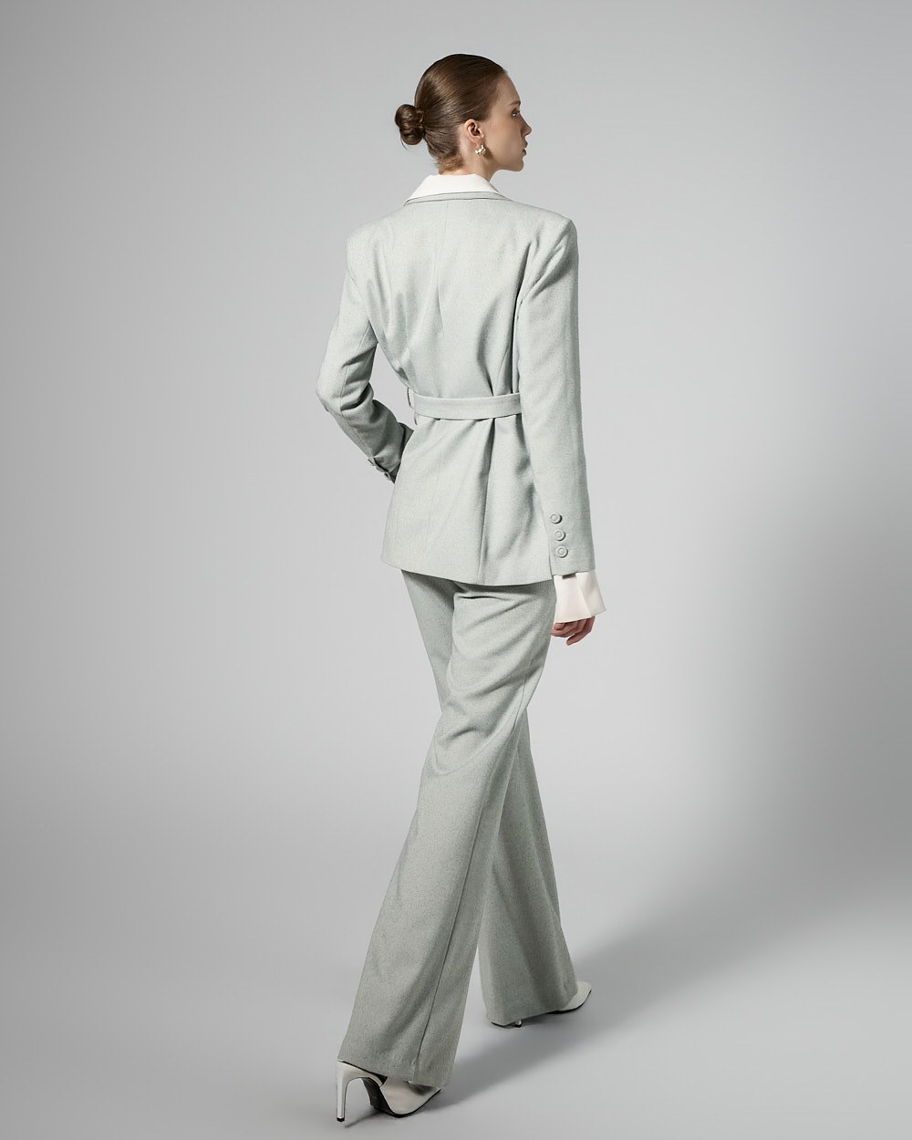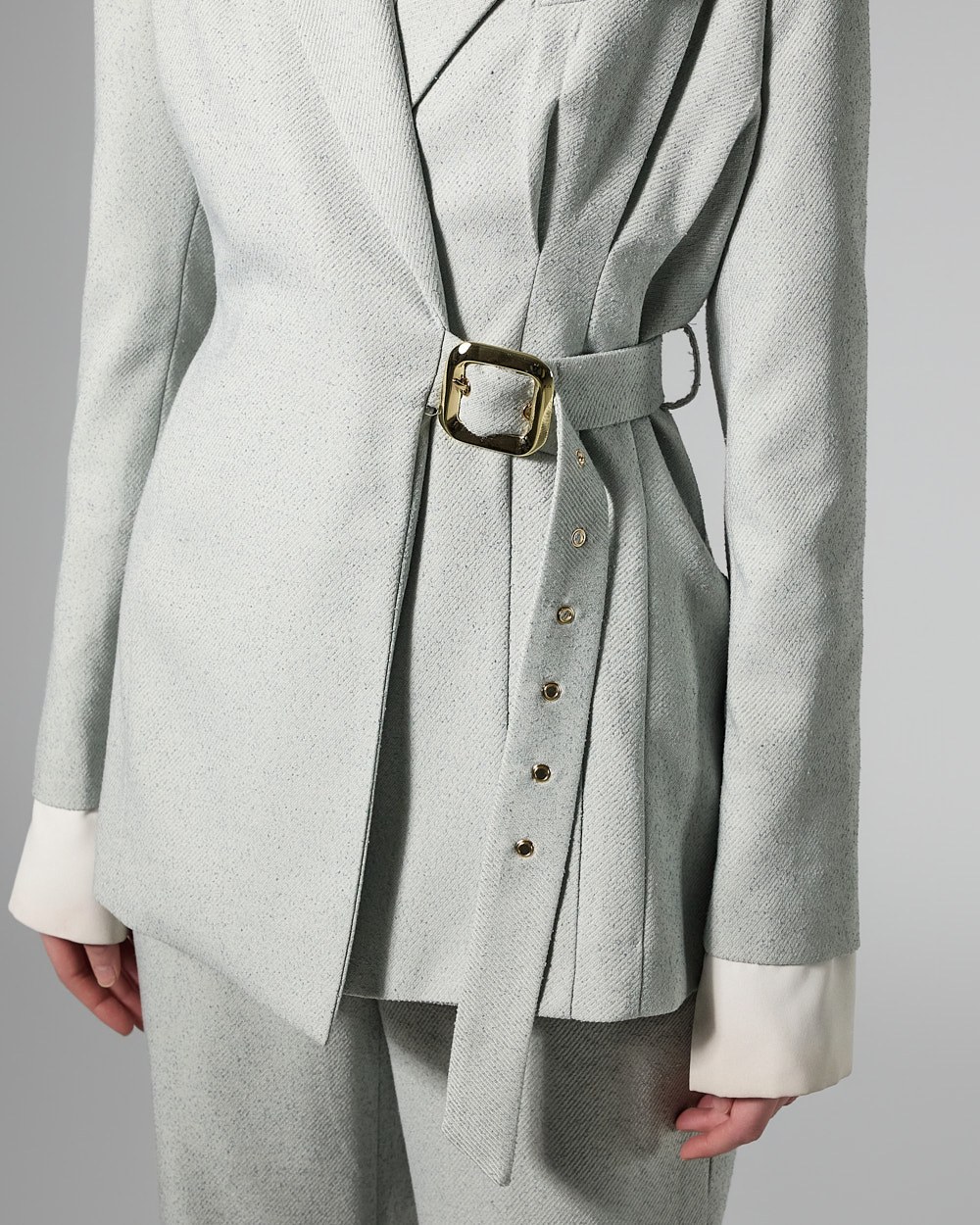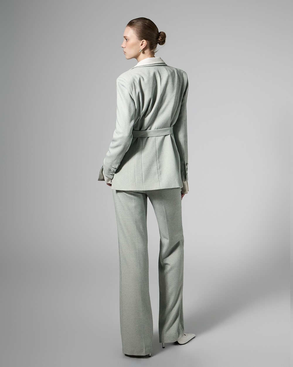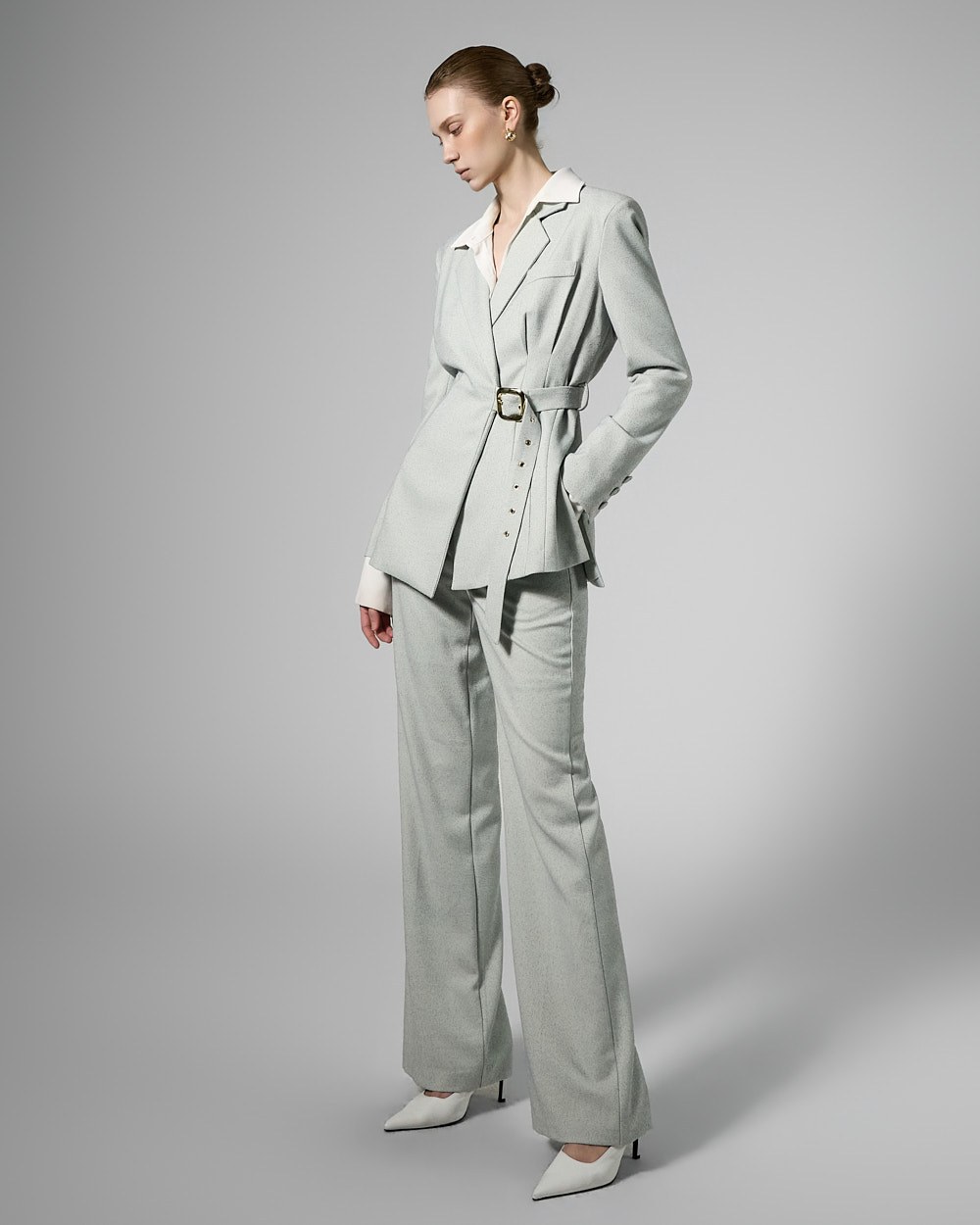 자켓은 슬림핏 실루엣에 히든 단추 여밈으로