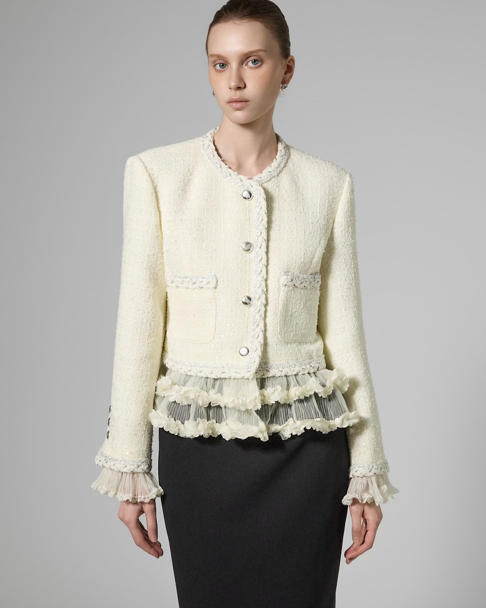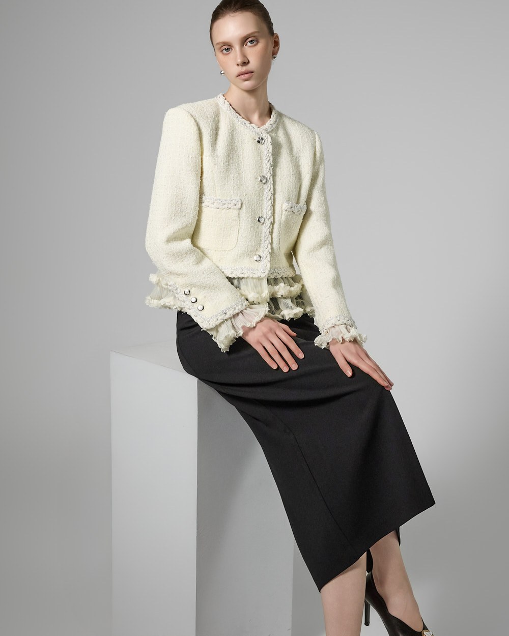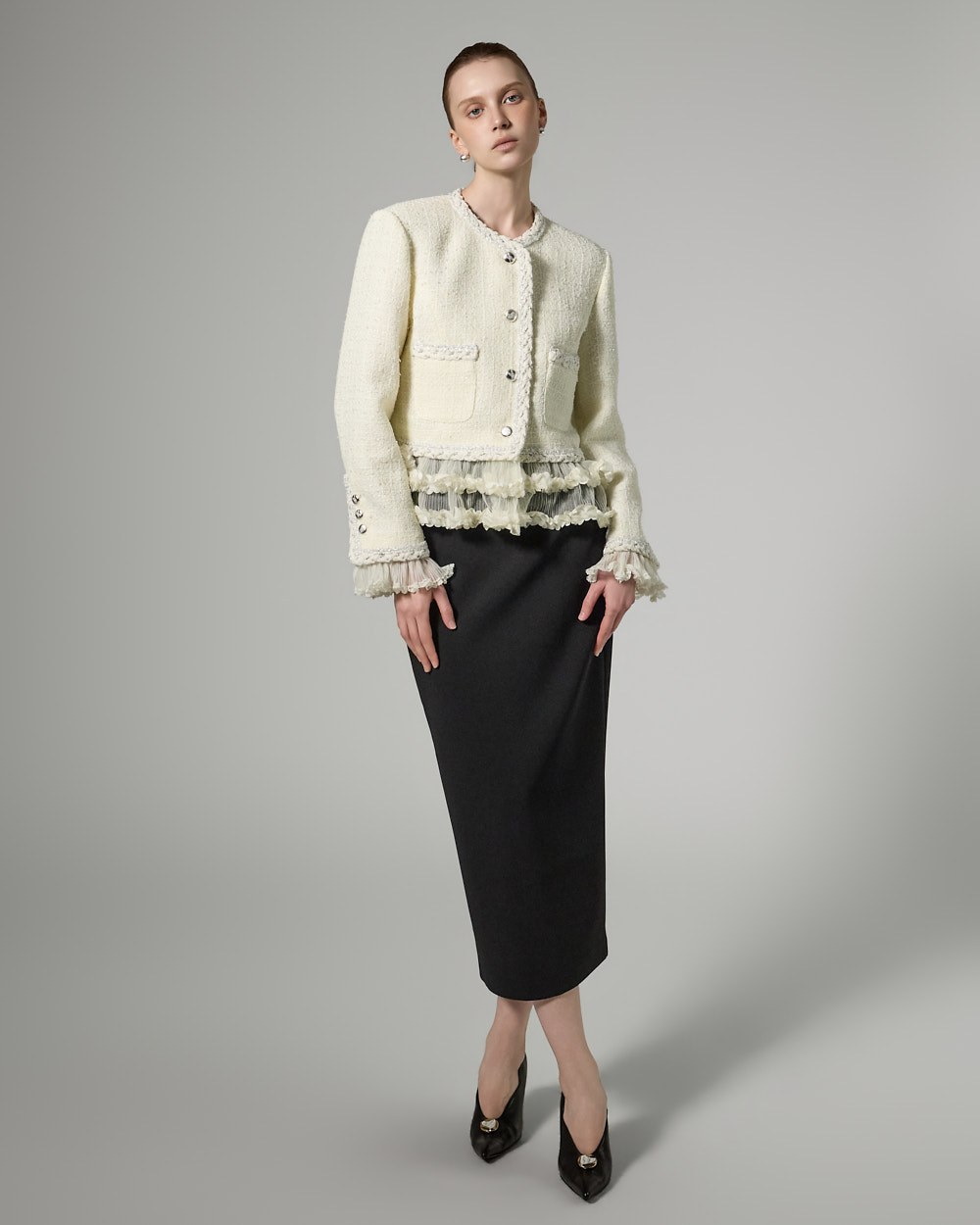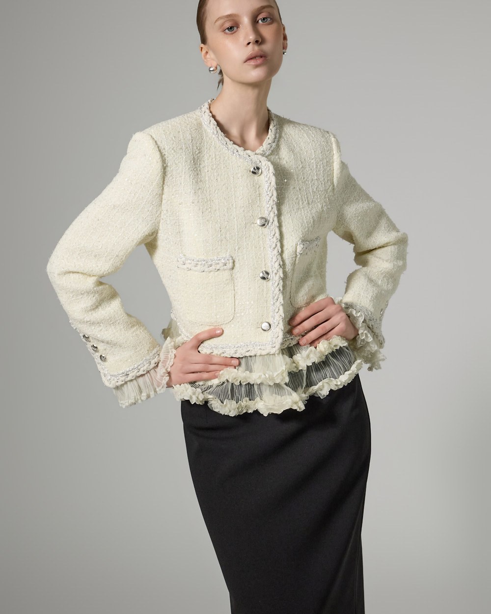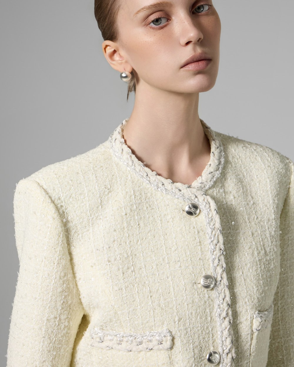트위드 텍스처와 정핏 실루엣이 어우러져