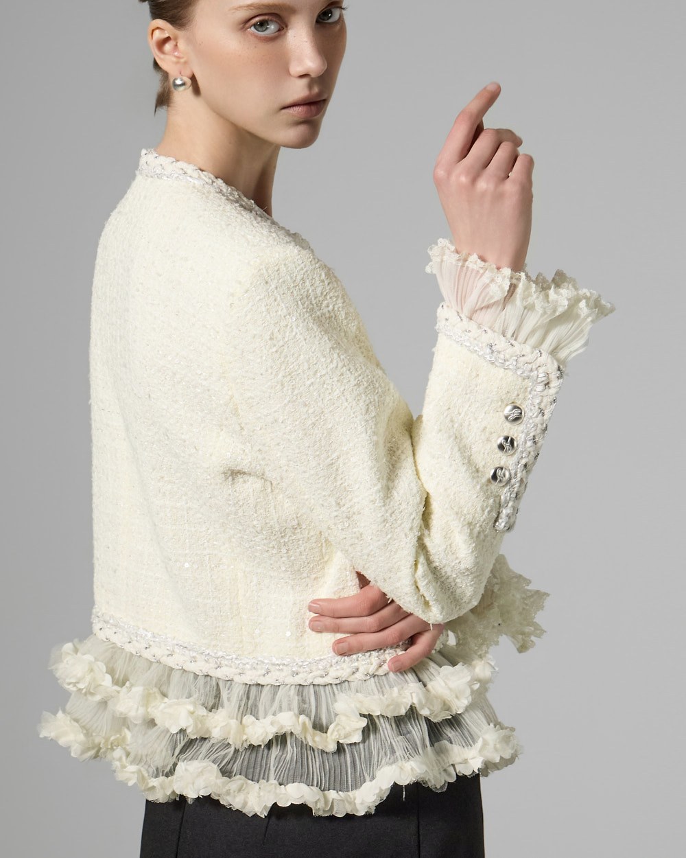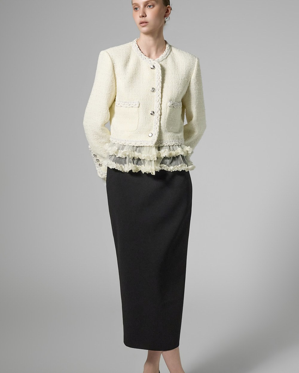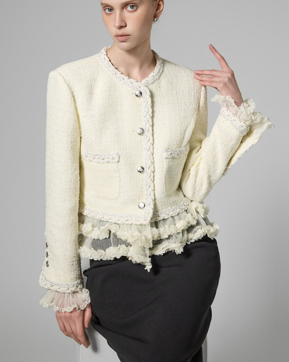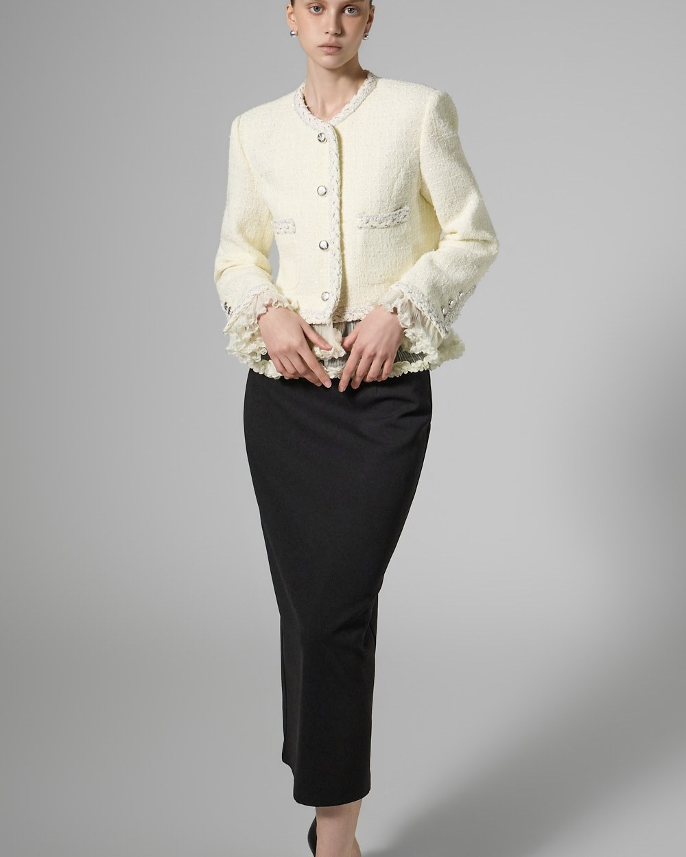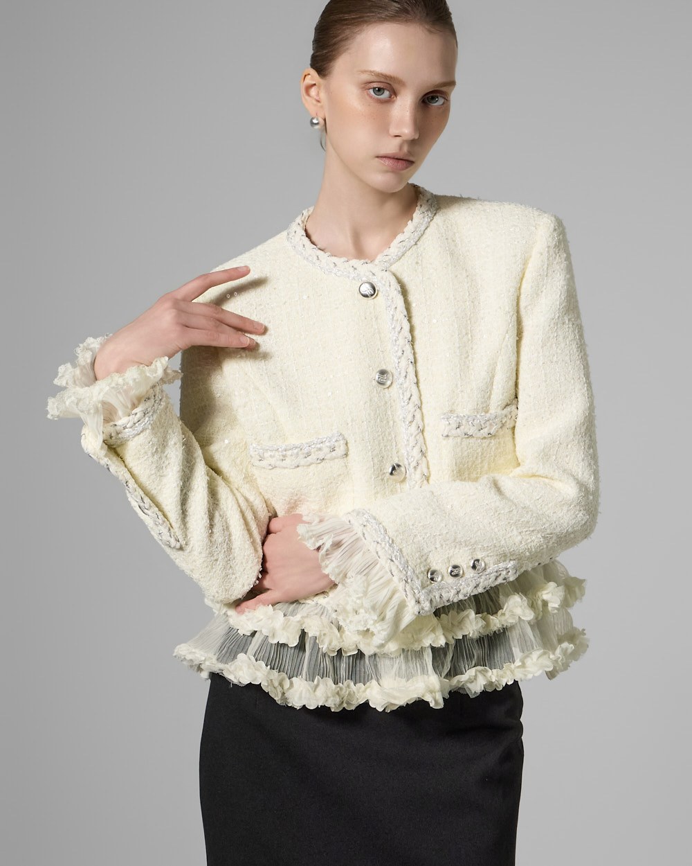 트위드 텍스처와 정핏 실루엣이 어우러져