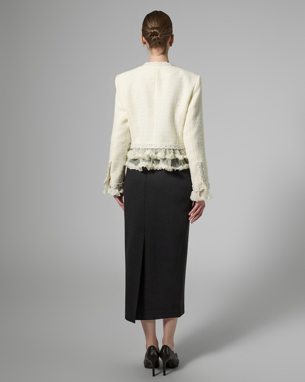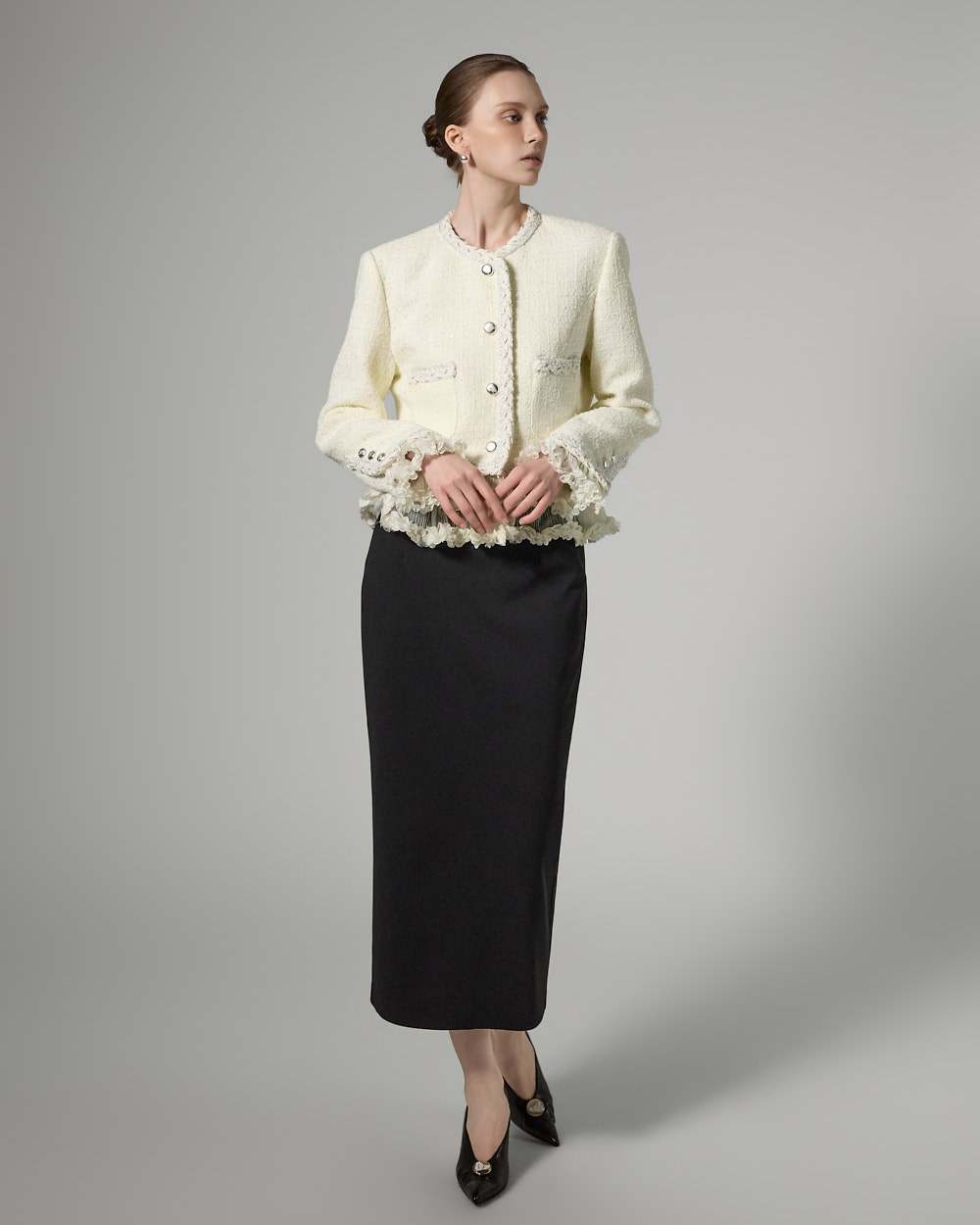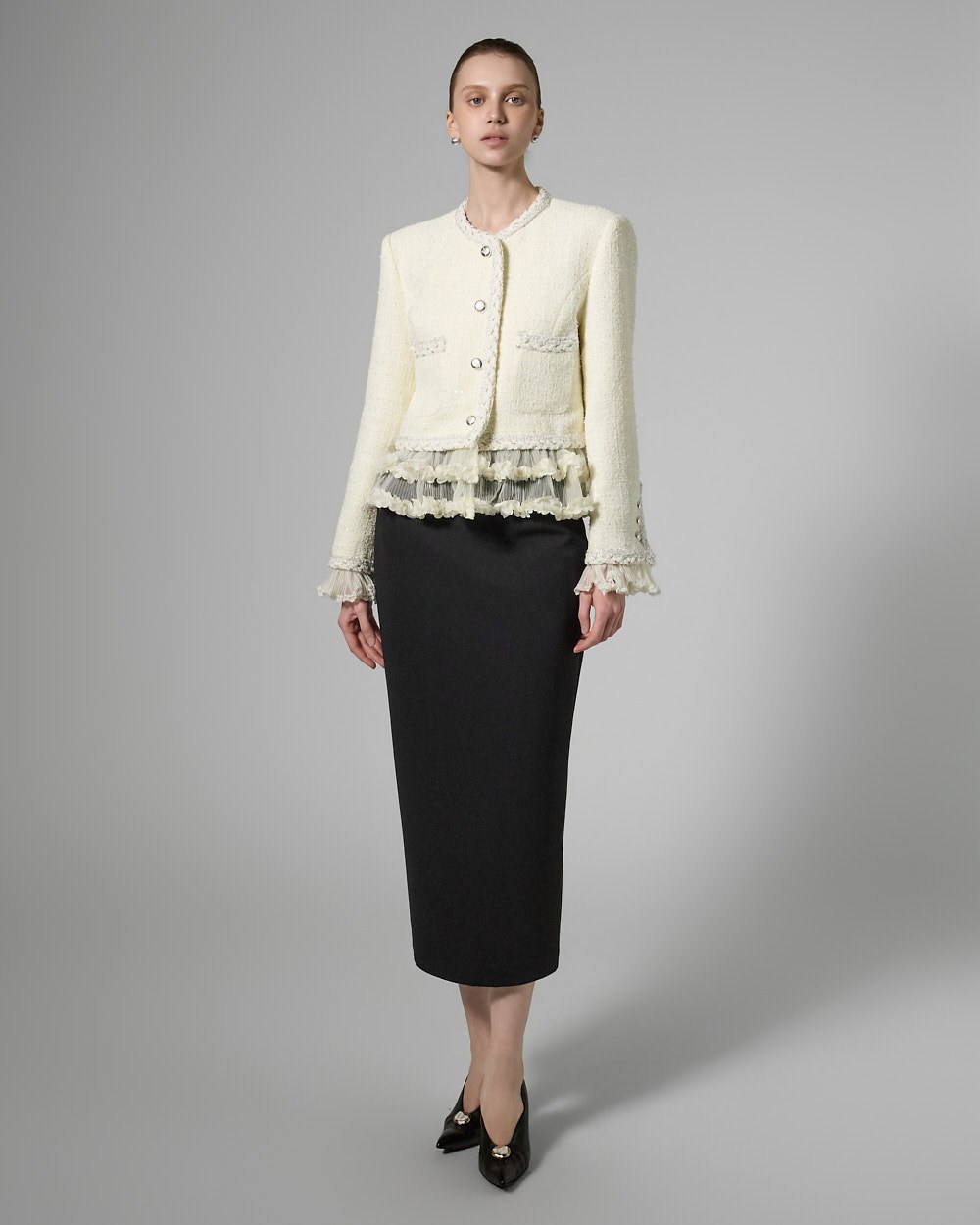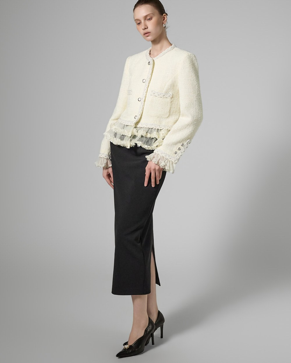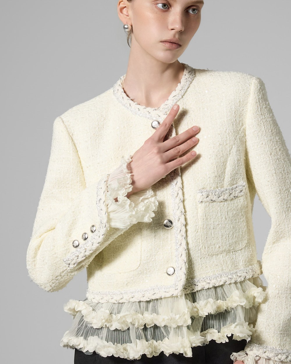 트위드 텍스처와 정핏 실루엣이 어우러져